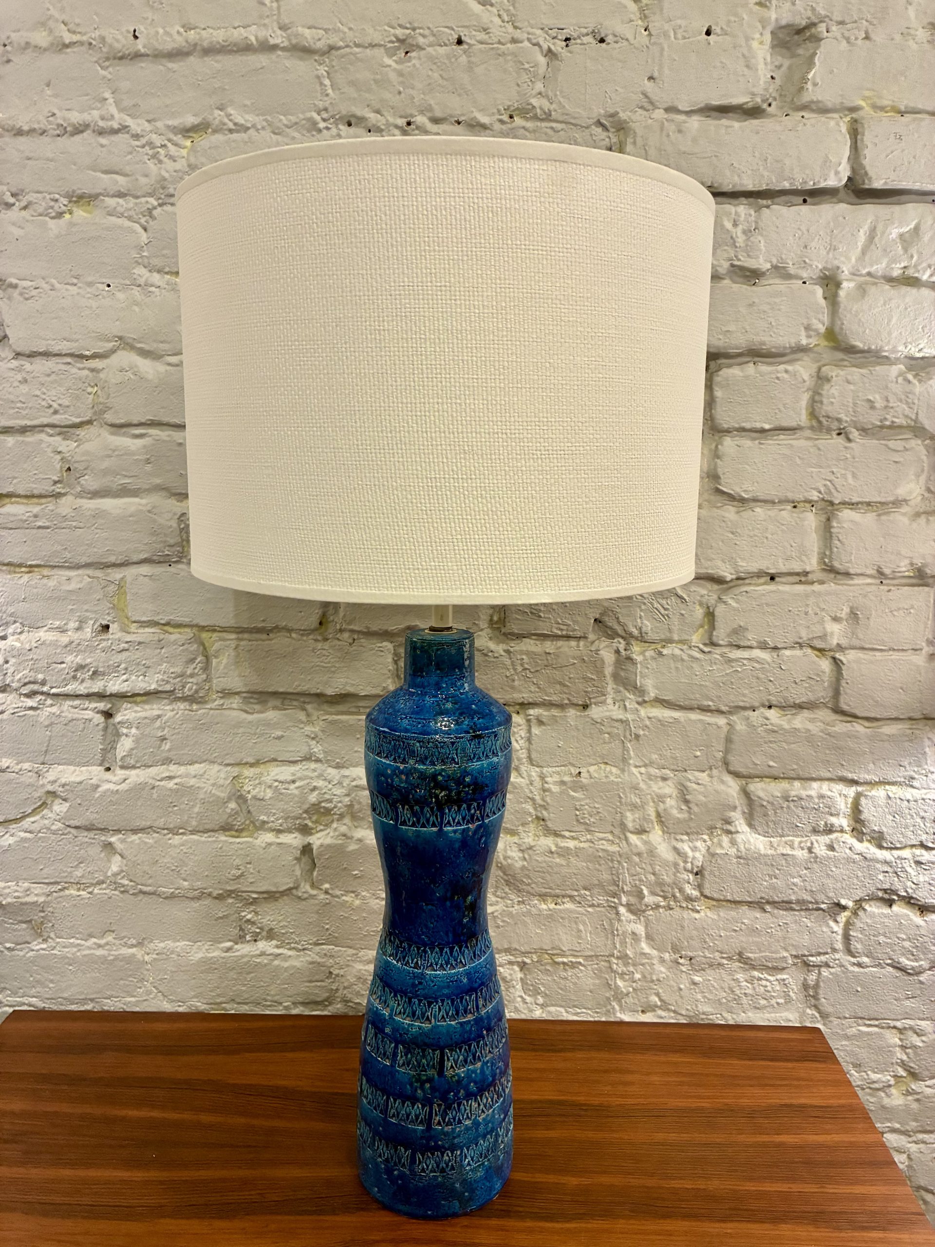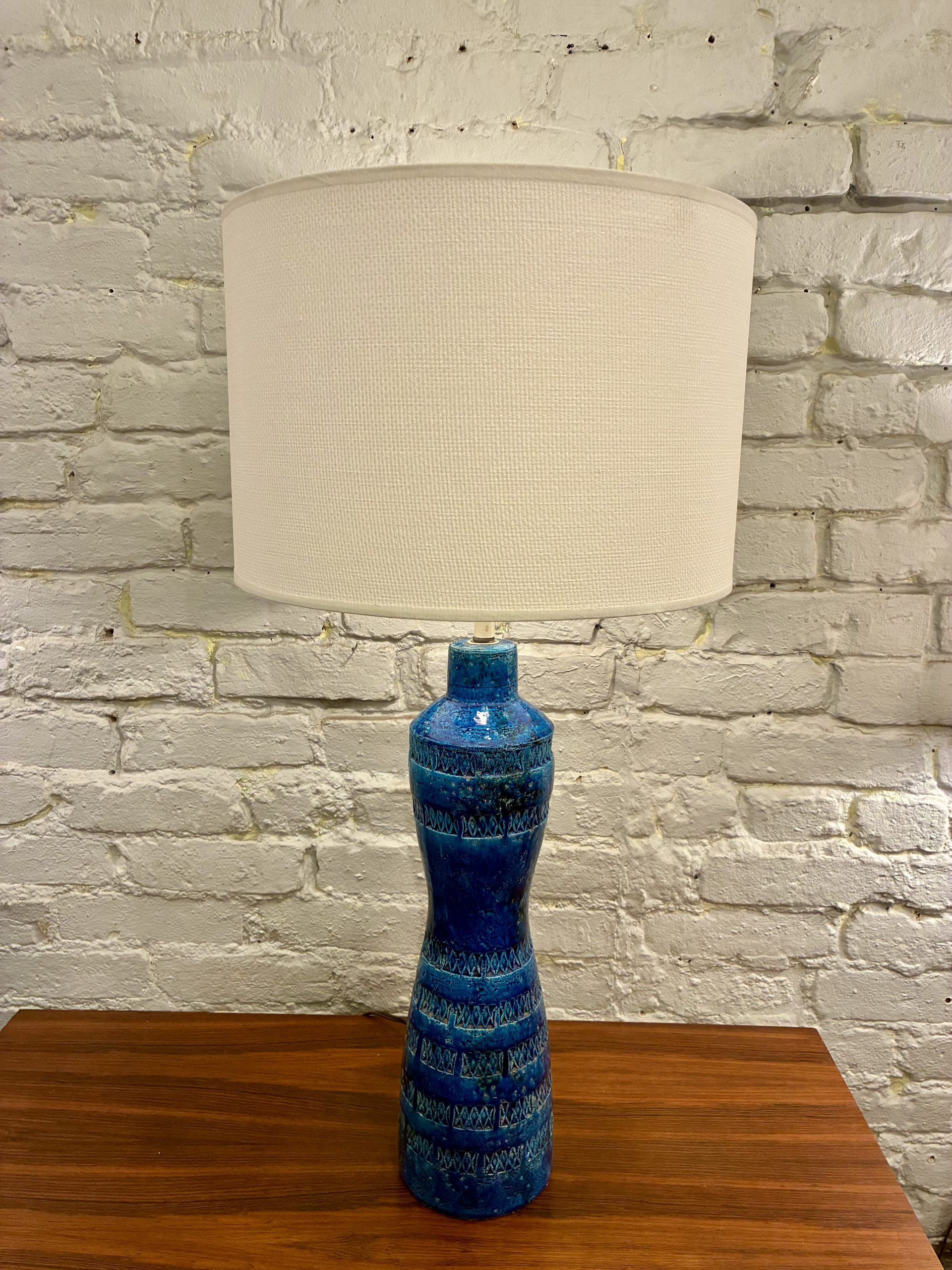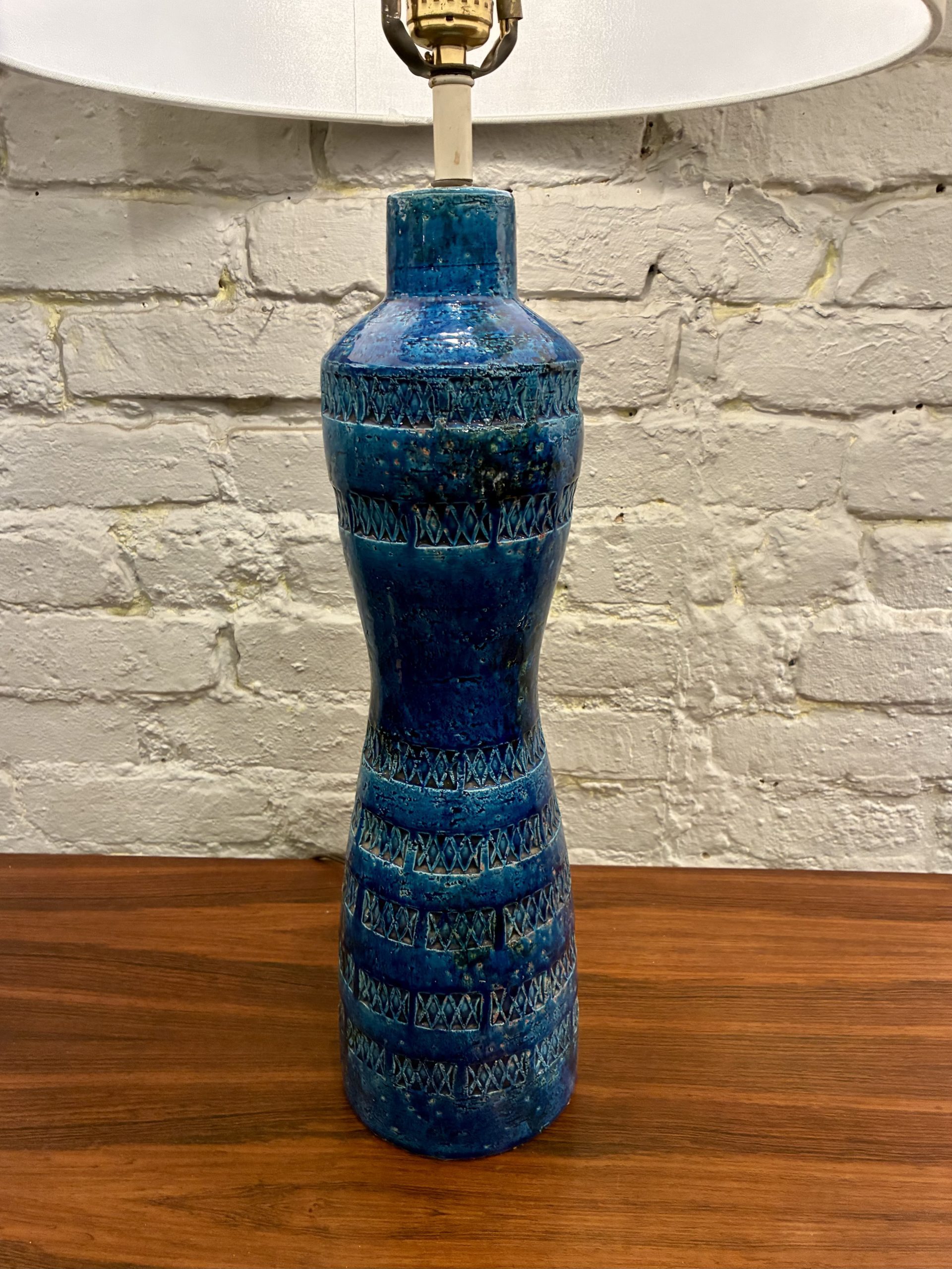 Aldo Londi Rimini Blue Bitossi Lamp from the 1950s, Itay. A beautiful example of Londi’s iconic work with a deep, rich glaze and impressed Xs. It has a chip at the bottom on the rear side as pictured.