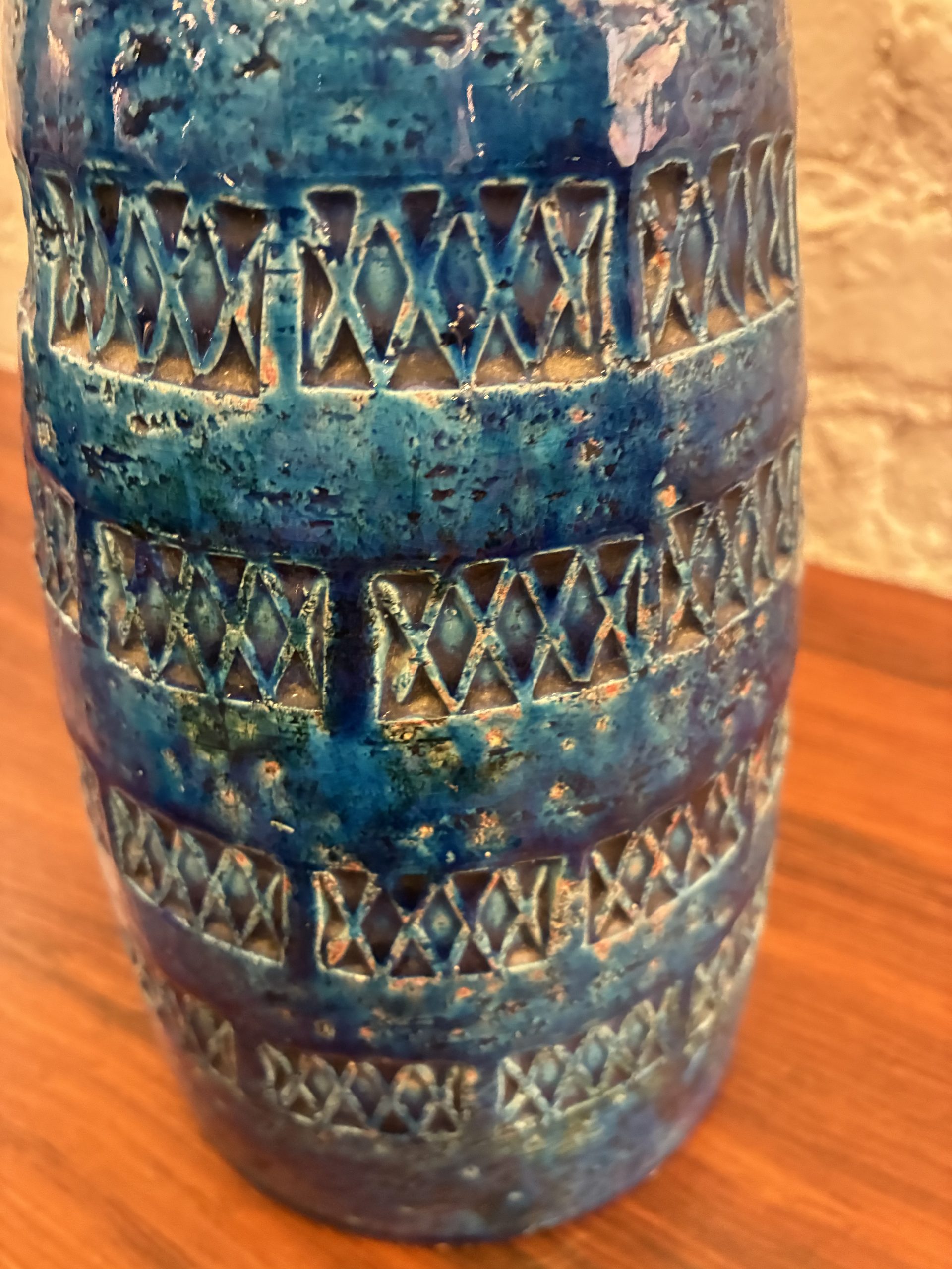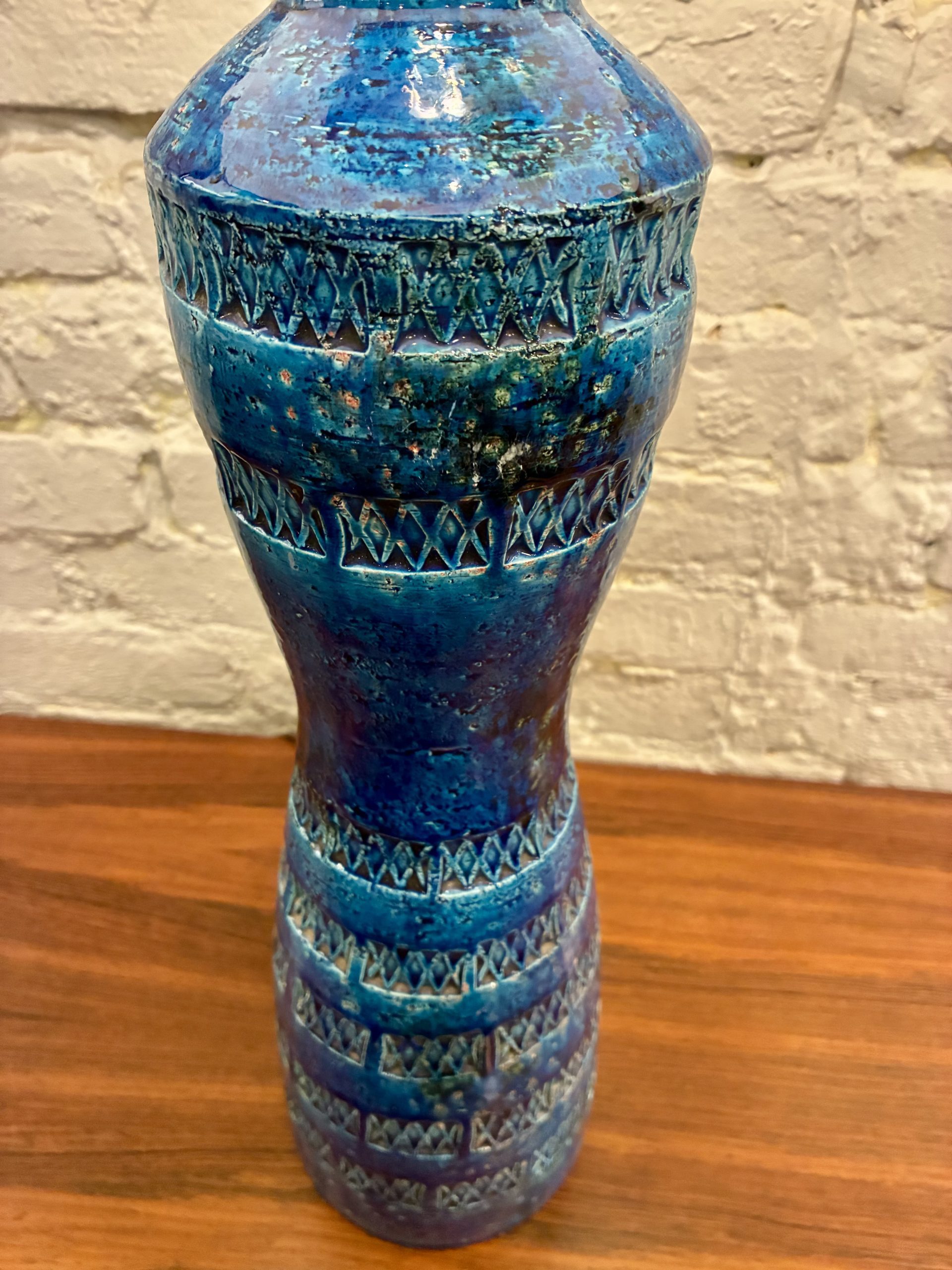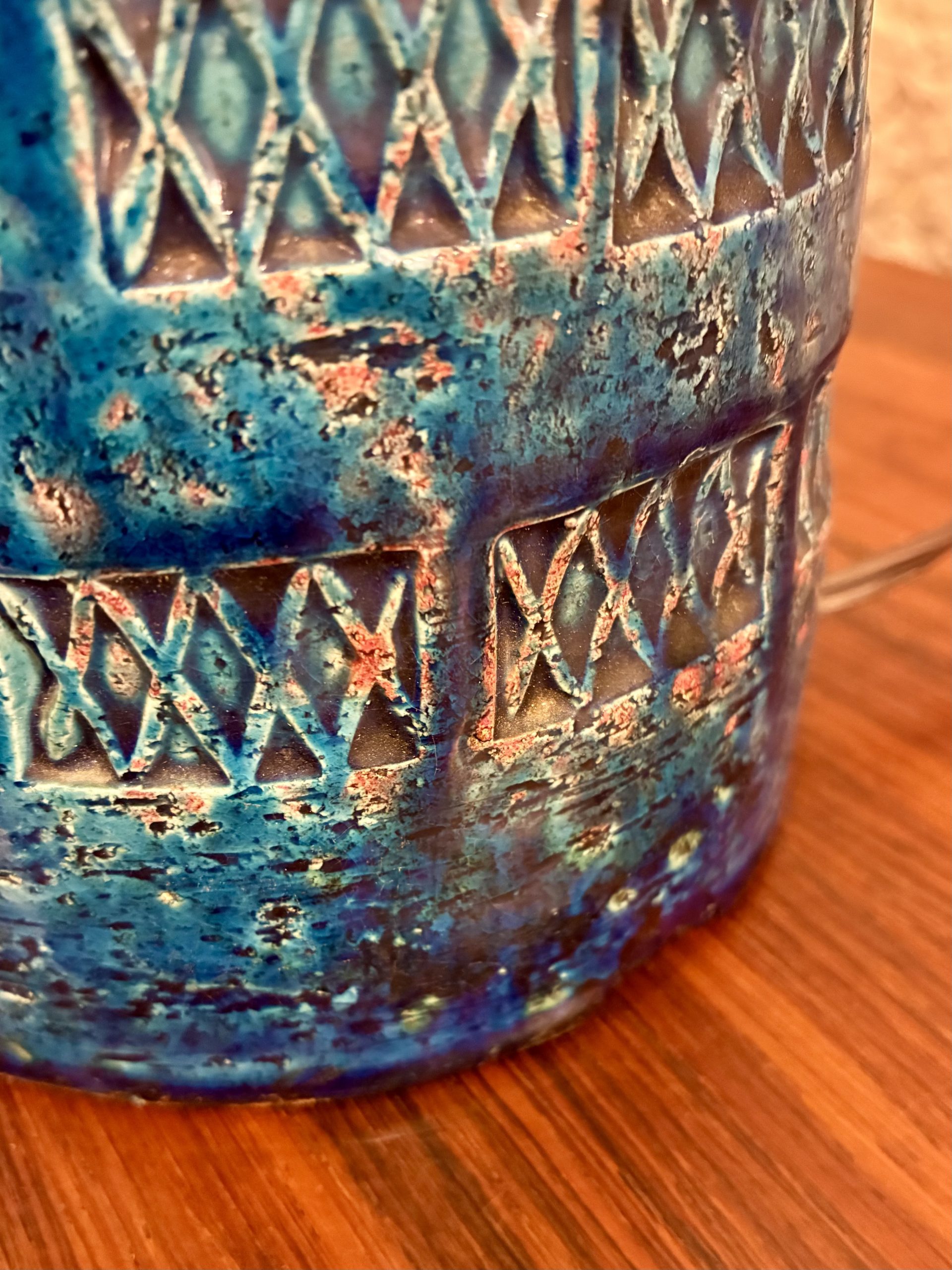 Aldo Londi Rimini Blue Bitossi Lamp from the 1950s, Itay. A beautiful example of Londi’s iconic work with a deep, rich glaze and impressed Xs. It has a chip at the bottom on the rear side as pictured.