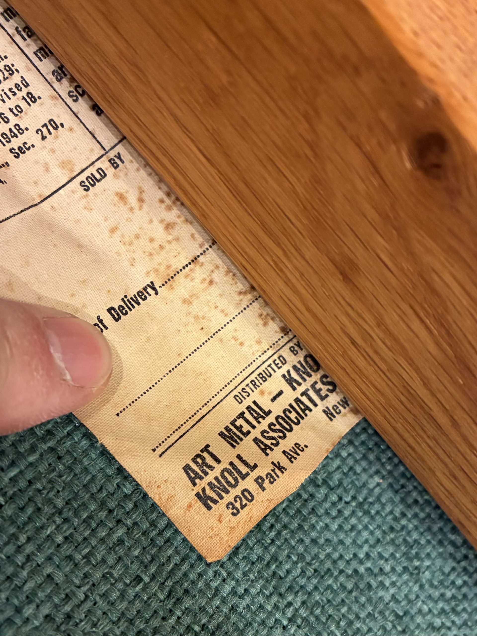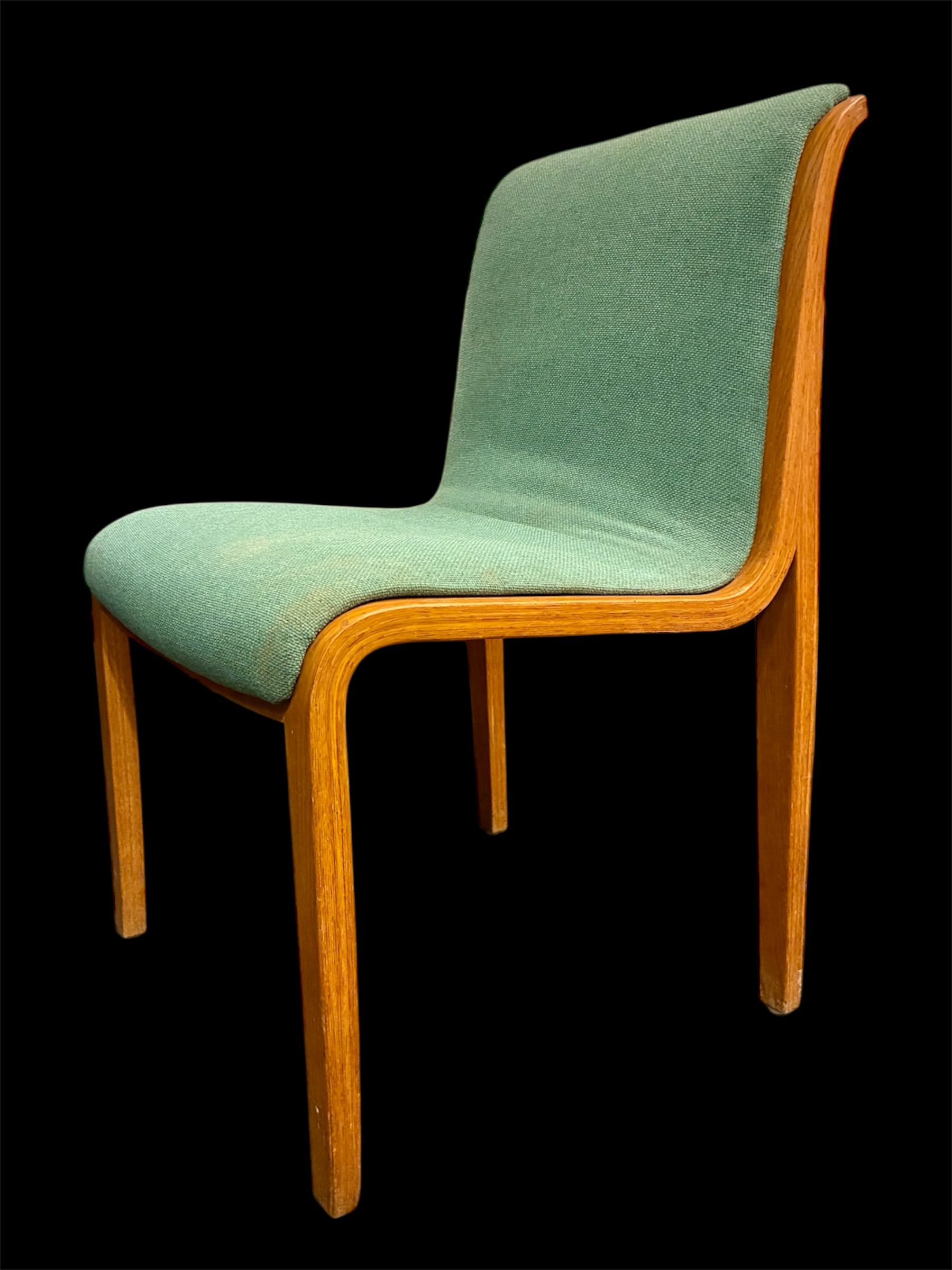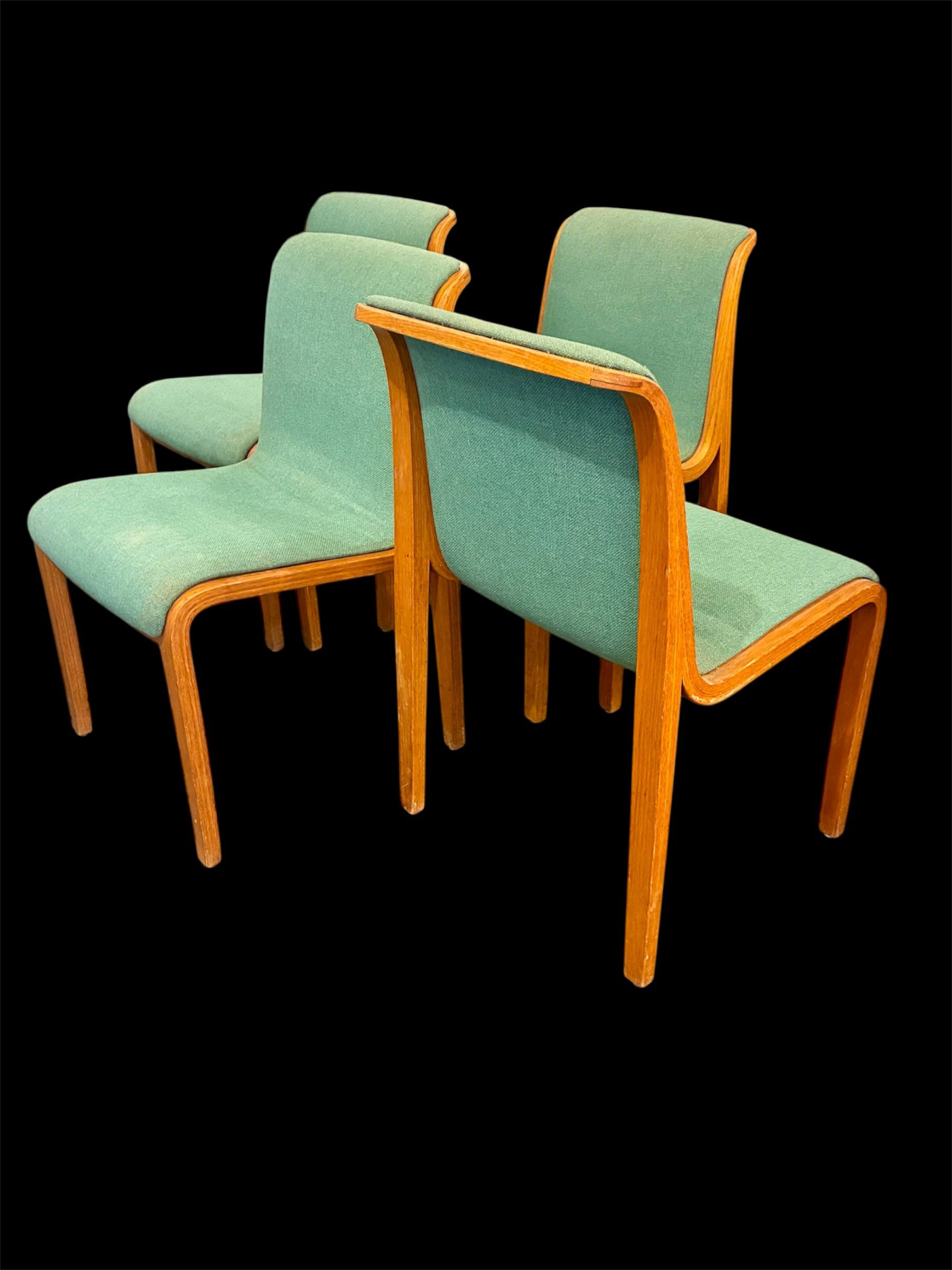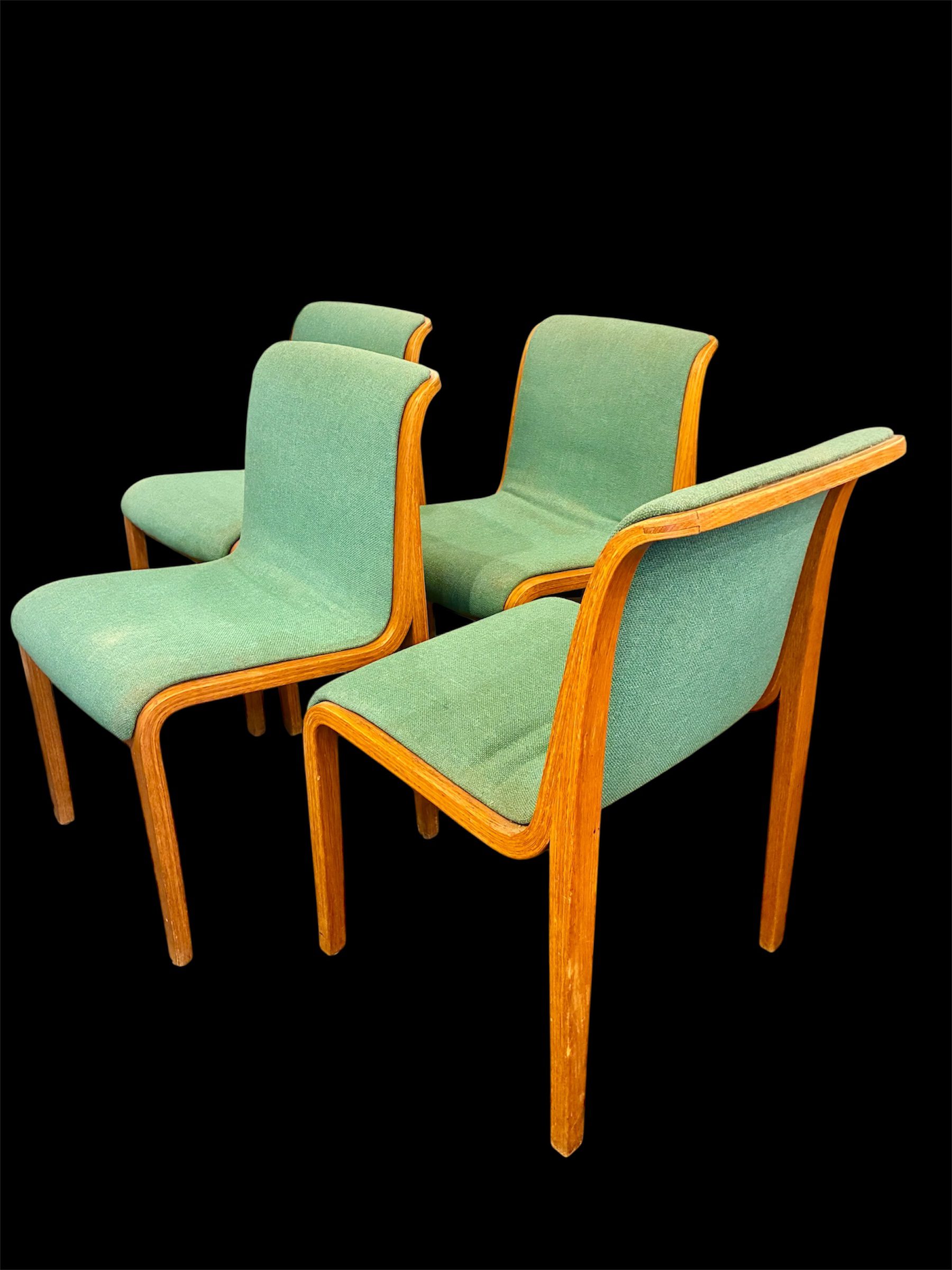 These four Bill Stephens Series 1300 Side Chairs for Knoll from the 1960s have a distinctly authentic midcentury feel. They were made in the mid 60’s and retain their original turquoise?, aqua?, sea foam? knoll wool hopstitch fabric. In good condition, one chair has a very forgivable water stain at rear where the seat meets the back. Marked with Art Metal-Knoll, Park Ave label. 19 3/4″w X 19″d X 32″h. $795 set