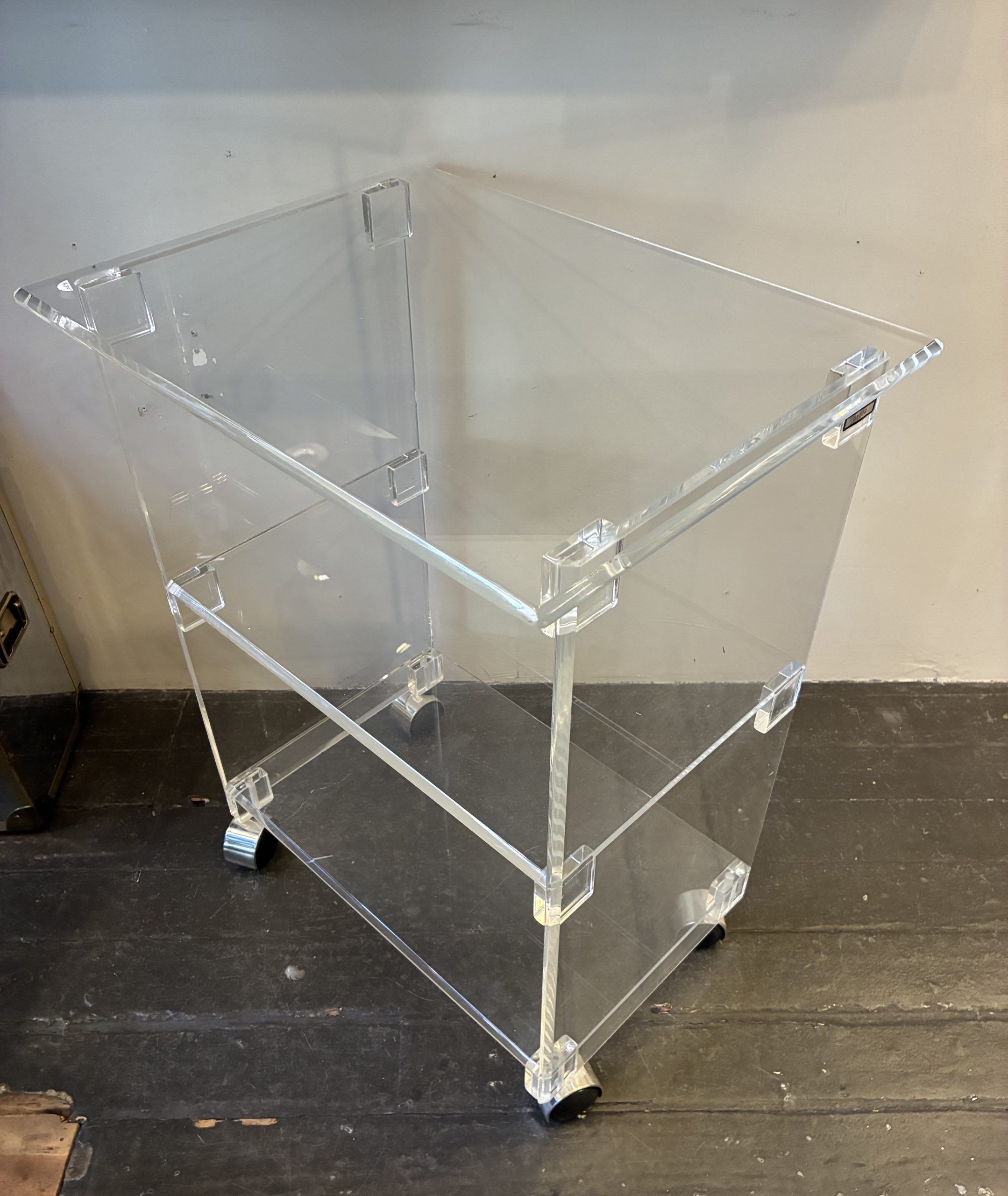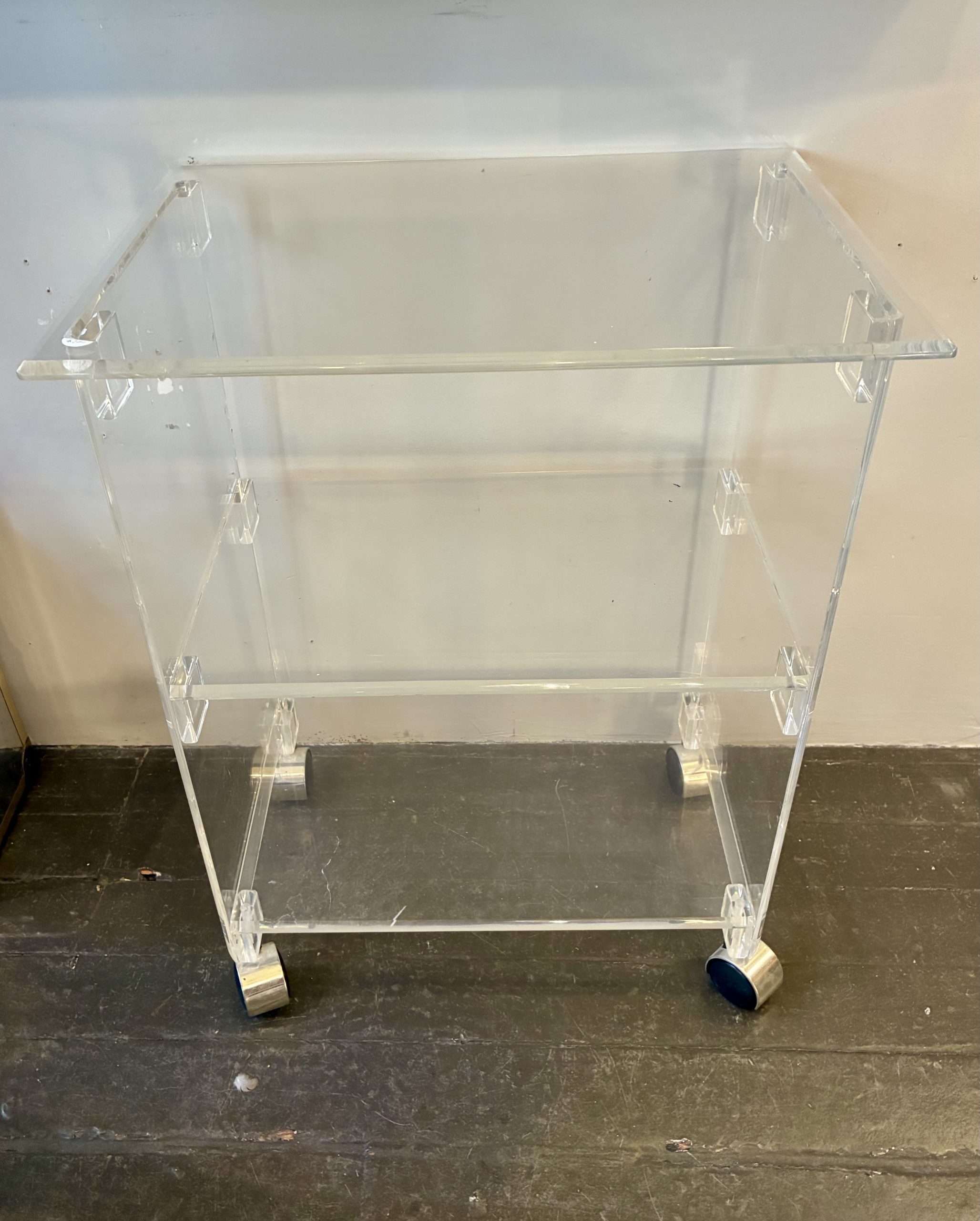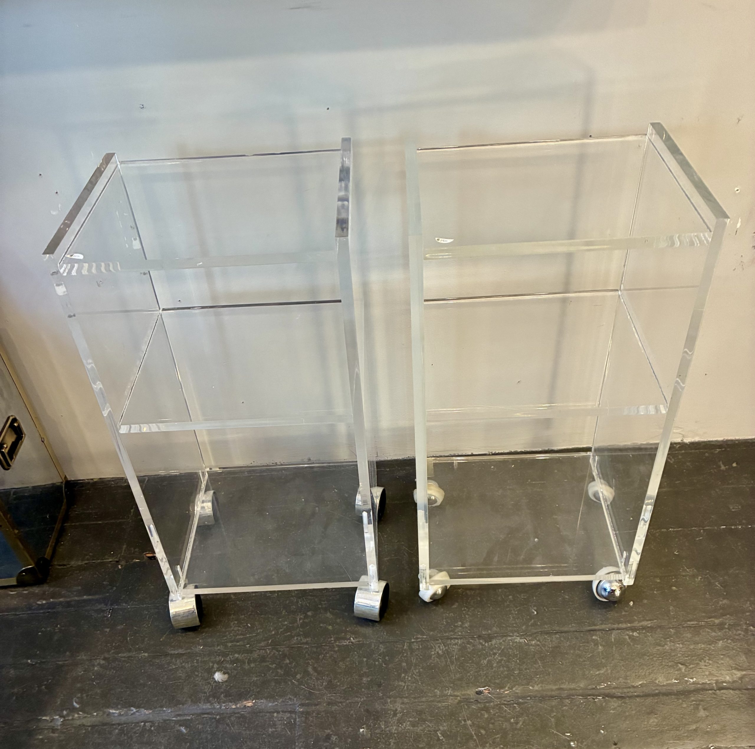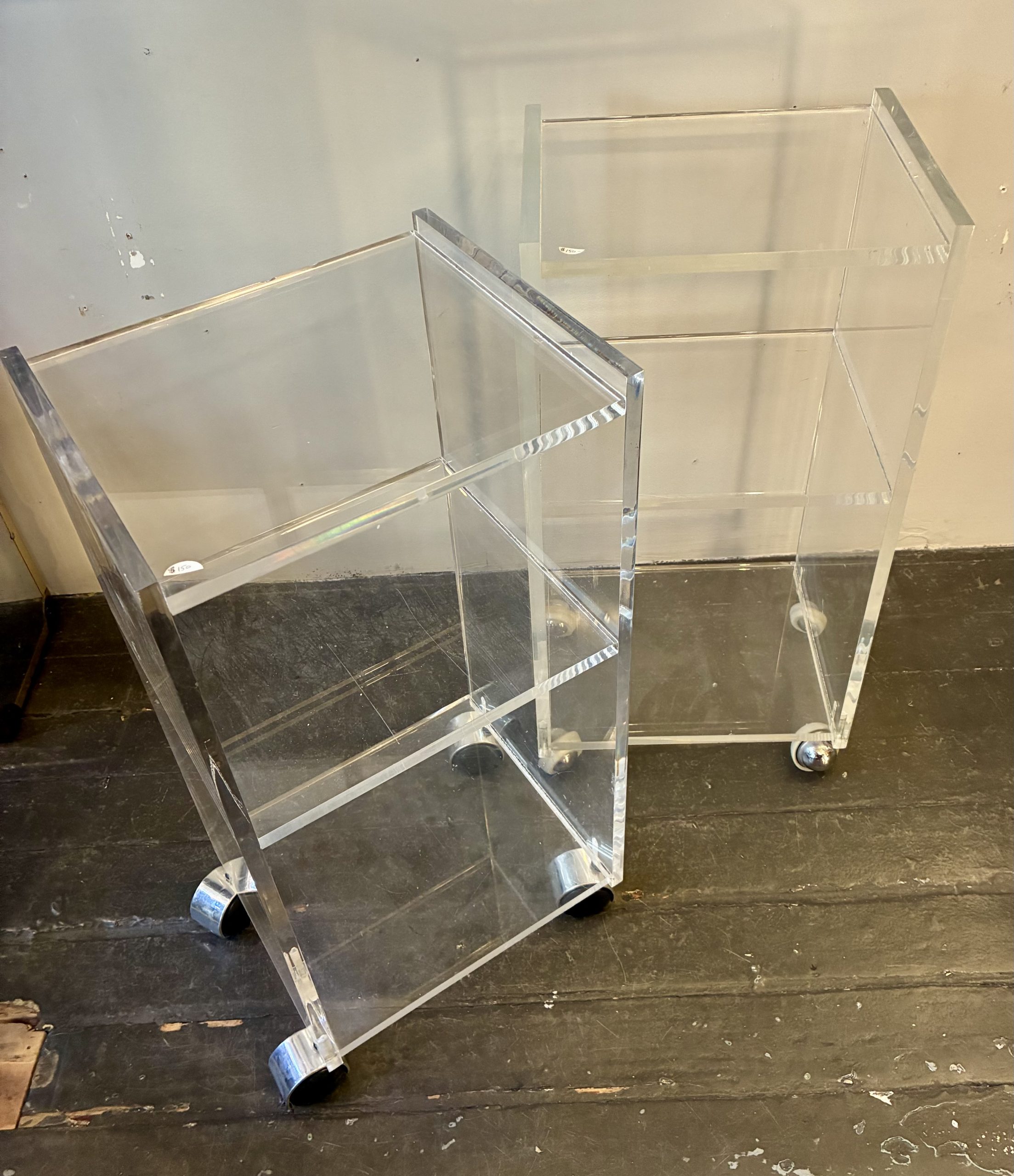 Custom Lucite Rolling Utility Carts. Each have three shelves and two measure 12 X 10 X 25″h and one measures 20 X 15 X 26″h. $150 small/ $195 large.