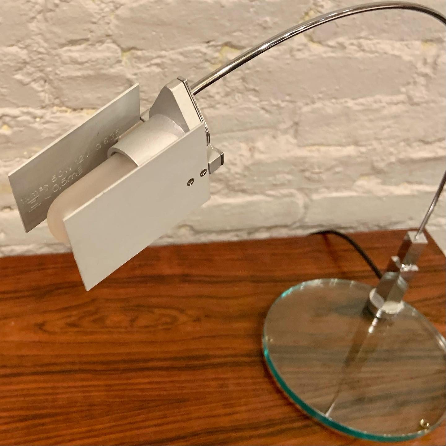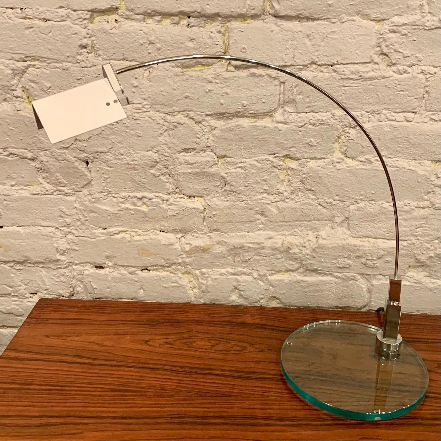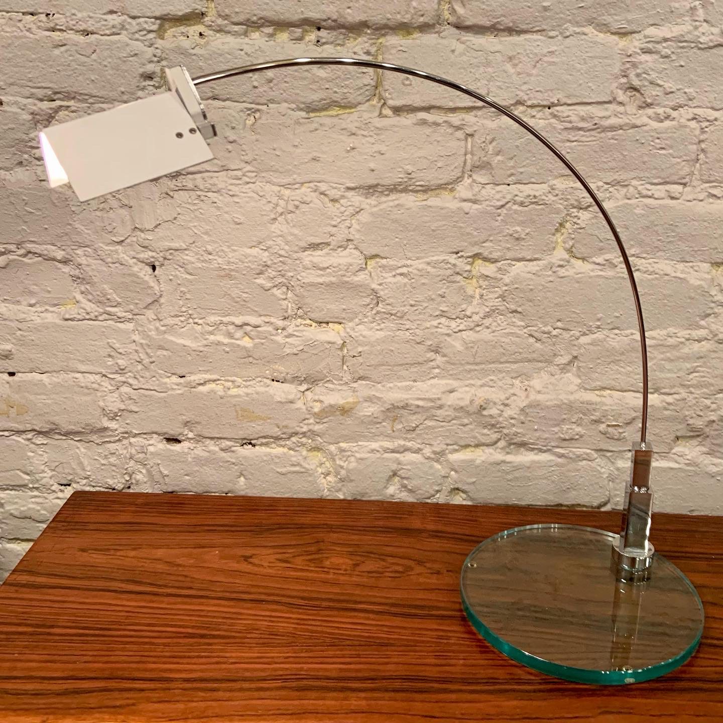 Designed by Alvaro Siza and manufactured by Fontana Arte, the Falena Table Lamp comes in chromed metal, designed in 1994. It is a representation of lightness and elegance for this family of lamps designed by Alvaro Siza and available in floor, table and wall versions. Adjustable body and diffuser wings for complete management of light. This low-voltage table lamp has an electronic plug-in transformer with a cable switch for dual light intensity. The base is in cut float glass with a chromed metal body with 360° horizontal rotation and pivoting anodized aluminum diffuser fins. It has a very cool guitar/mic style jack connection from base to body with a black power cable and plug and switch. In excellent condition, it measures 17 1/2h X 17 1/2d X 7 1/2″w.