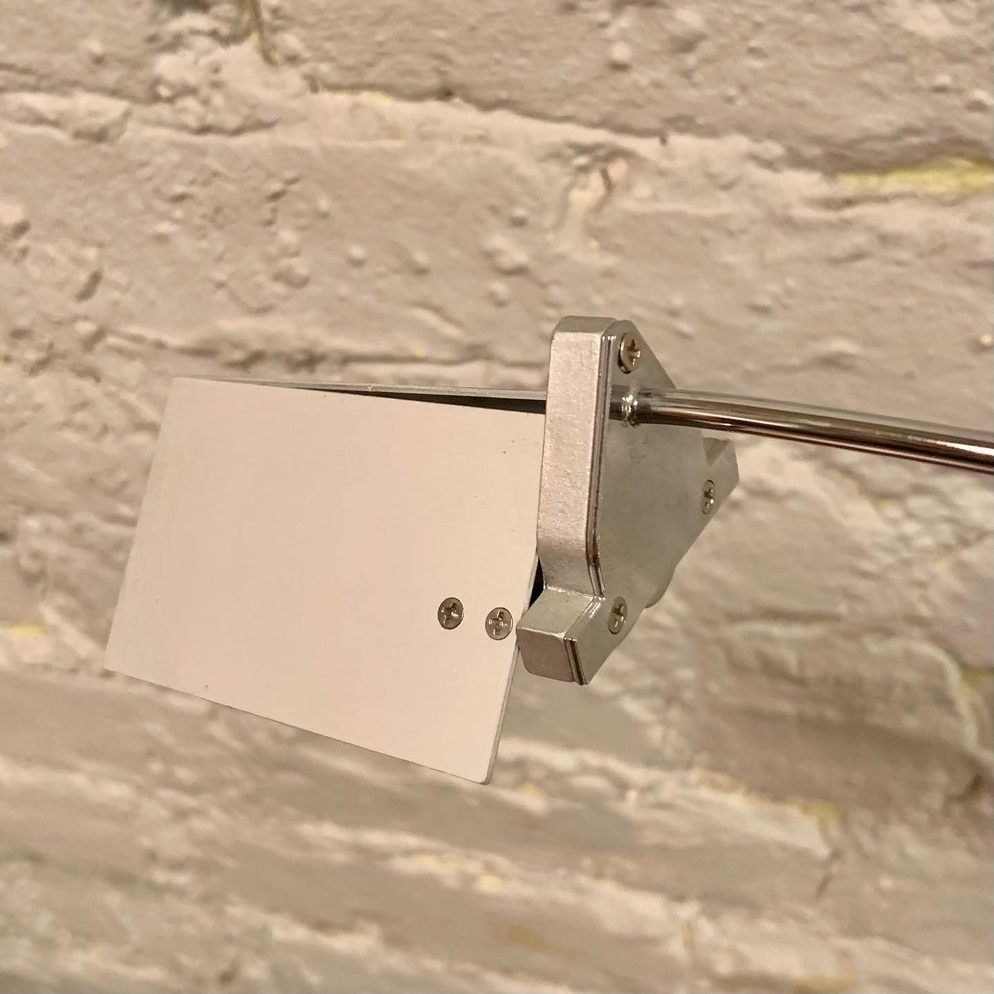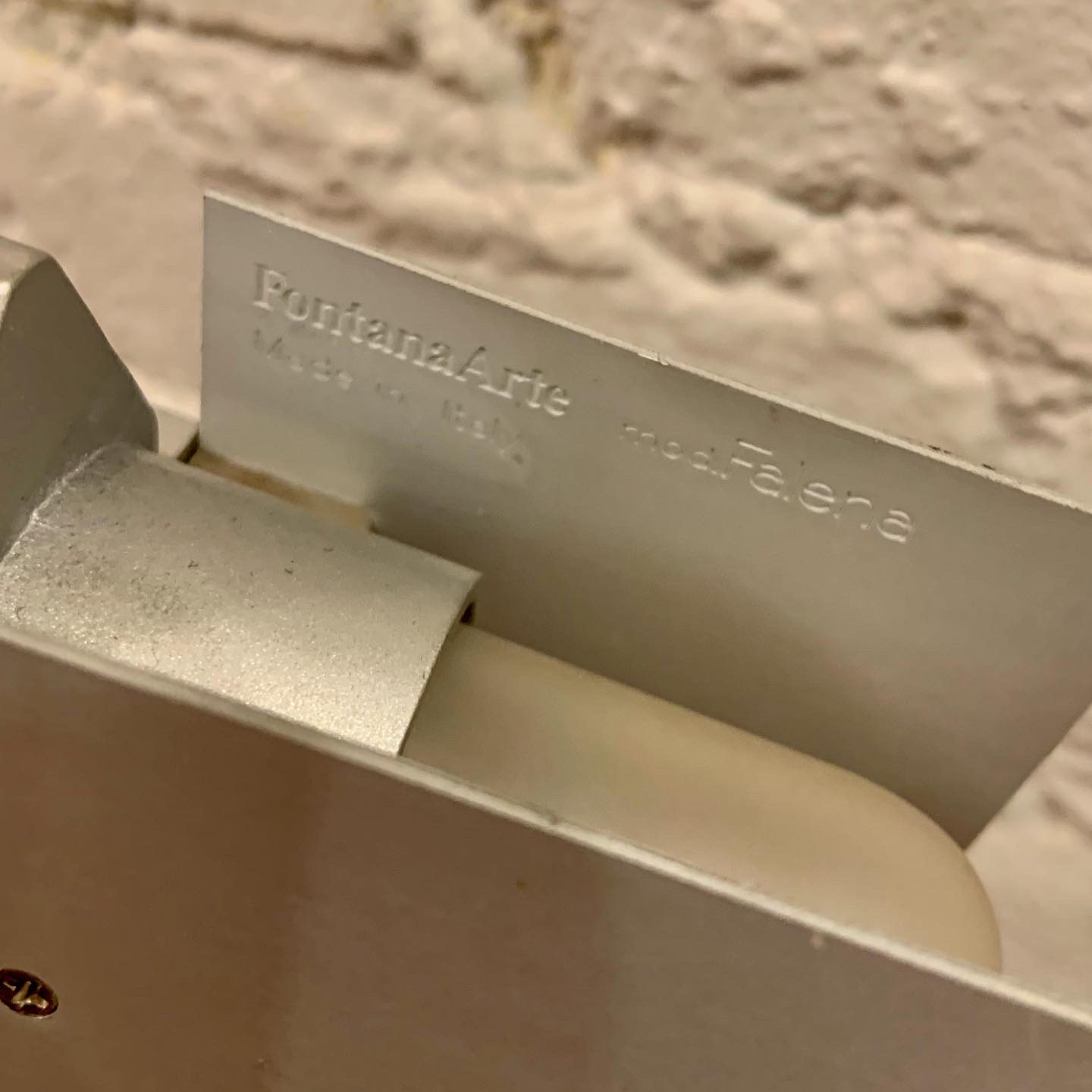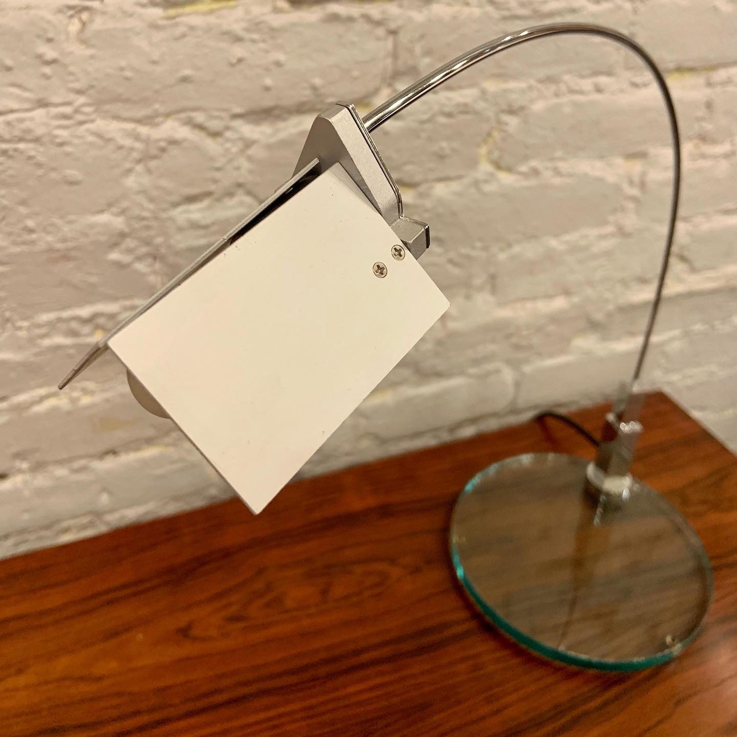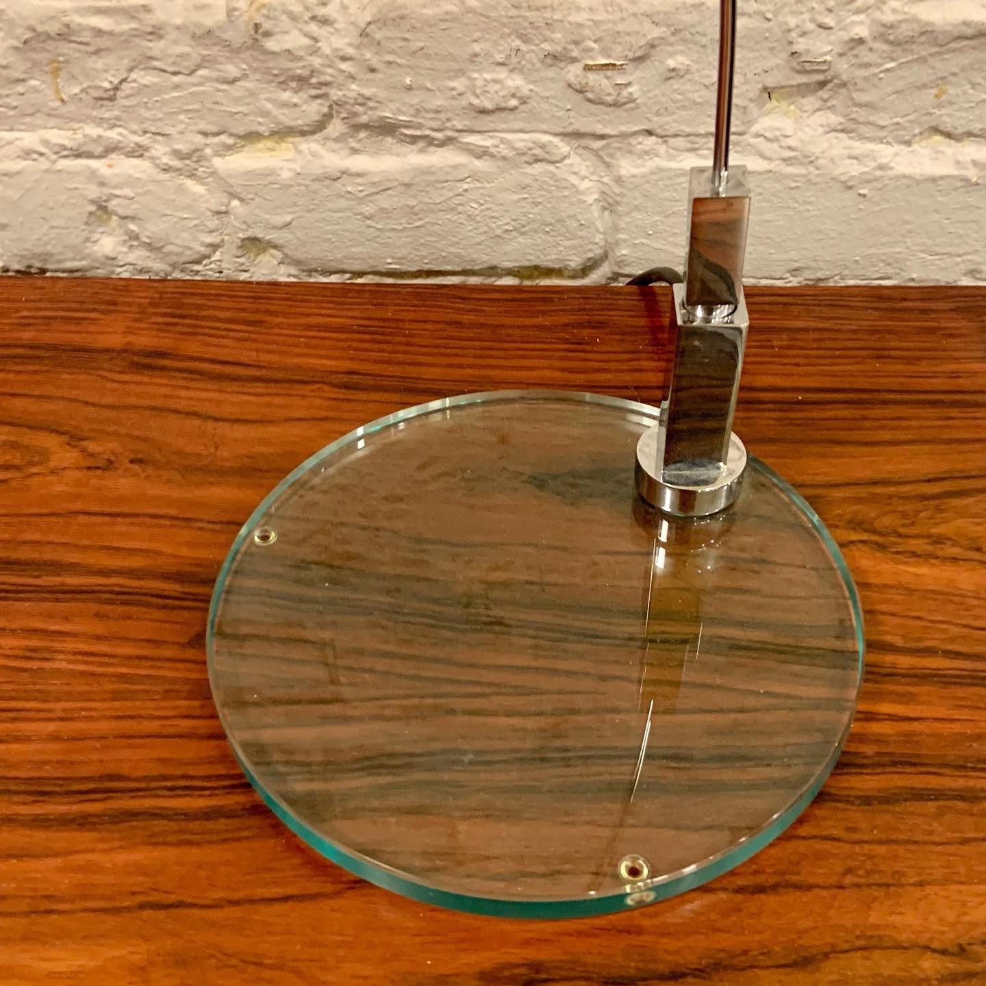 Designed by Alvaro Siza and manufactured by Fontana Arte, the Falena Table Lamp comes in chromed metal, designed in 1994. It is a representation of lightness and elegance for this family of lamps designed by Alvaro Siza and available in floor, table and wall versions. Adjustable body and diffuser wings for complete management of light. This low-voltage table lamp has an electronic plug-in transformer with a cable switch for dual light intensity. The base is in cut float glass with a chromed metal body with 360° horizontal rotation and pivoting anodized aluminum diffuser fins. It has a very cool guitar/mic style jack connection from base to body with a black power cable and plug and switch. In excellent condition, it measures 17 1/2h X 17 1/2d X 7 1/2″w.