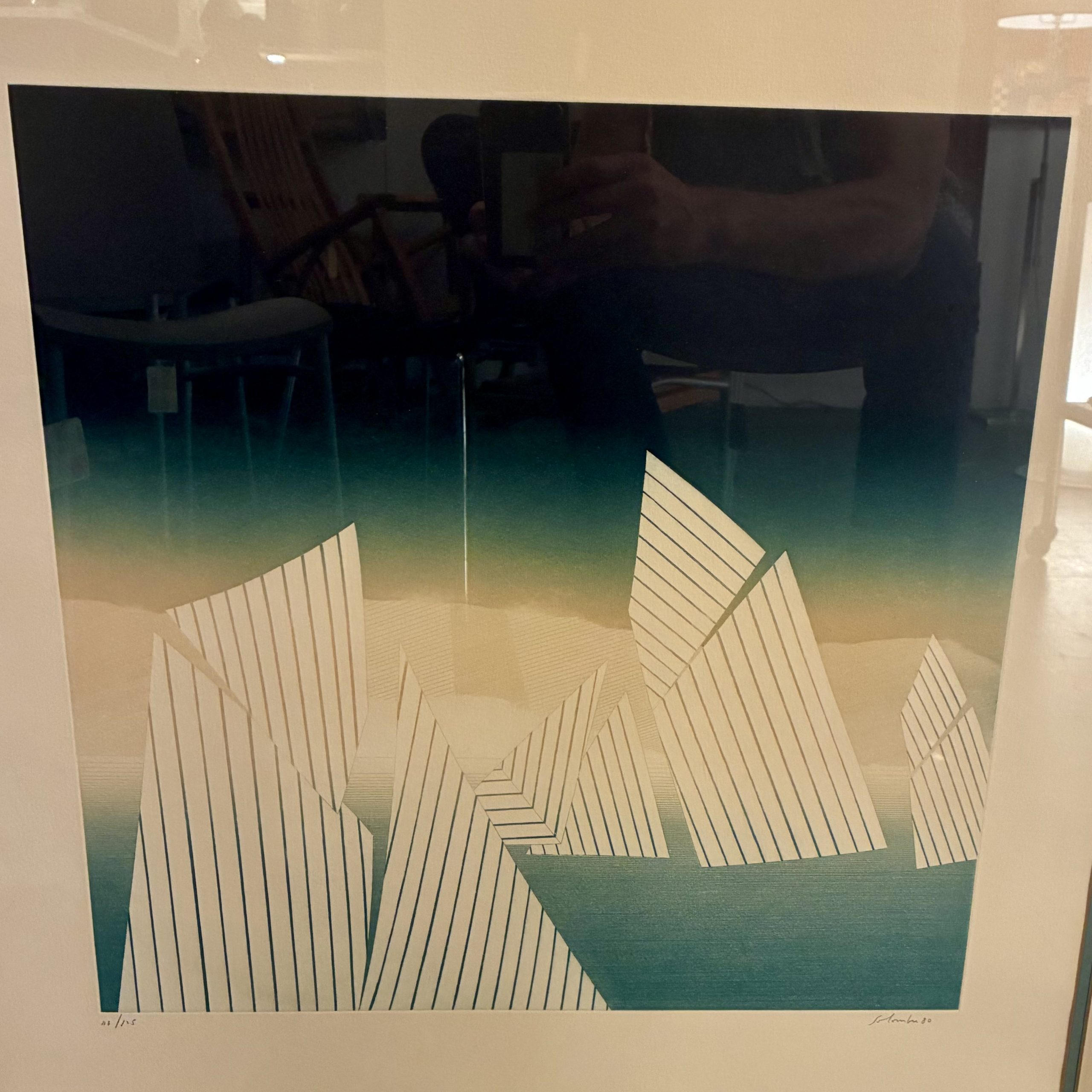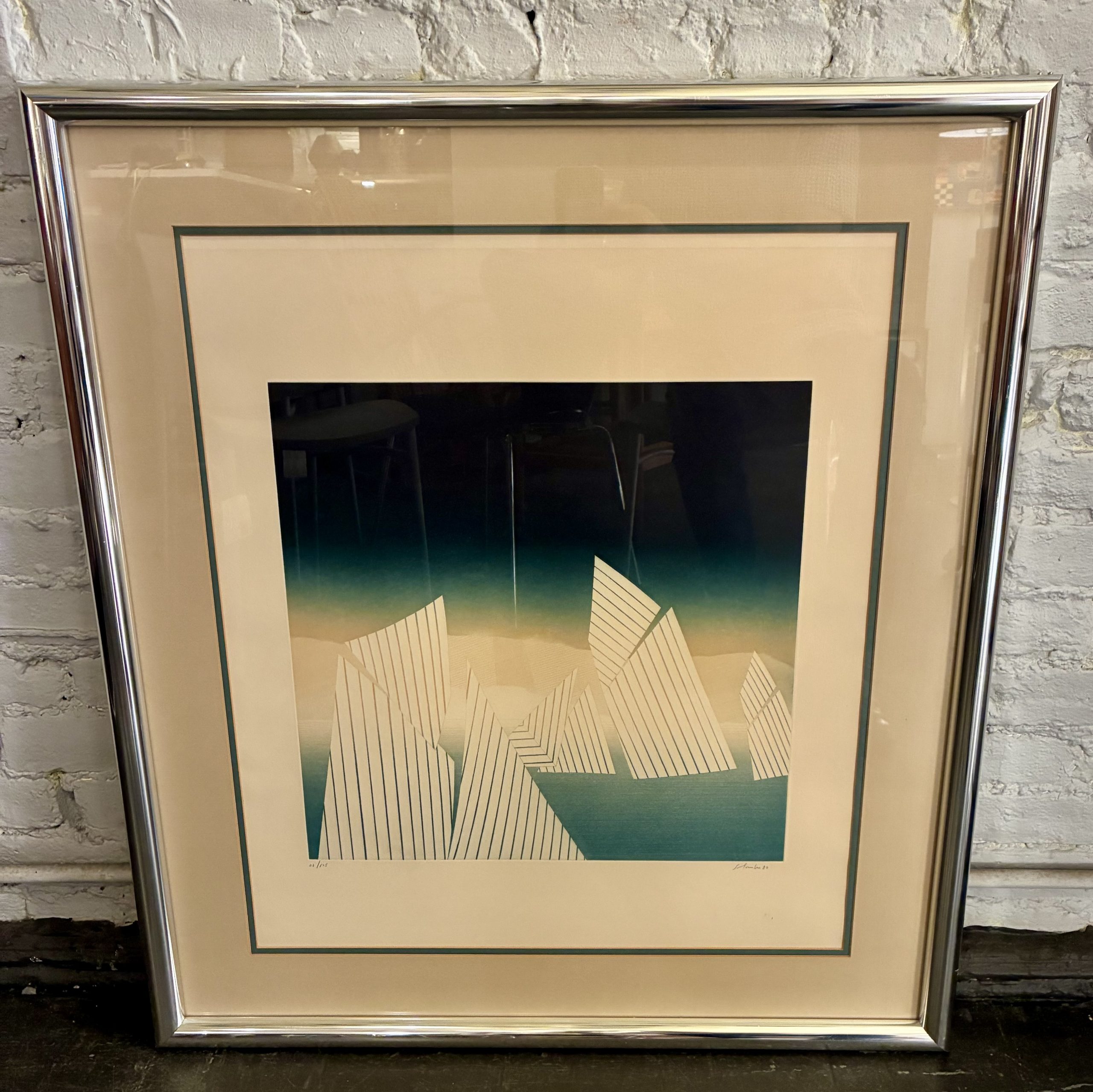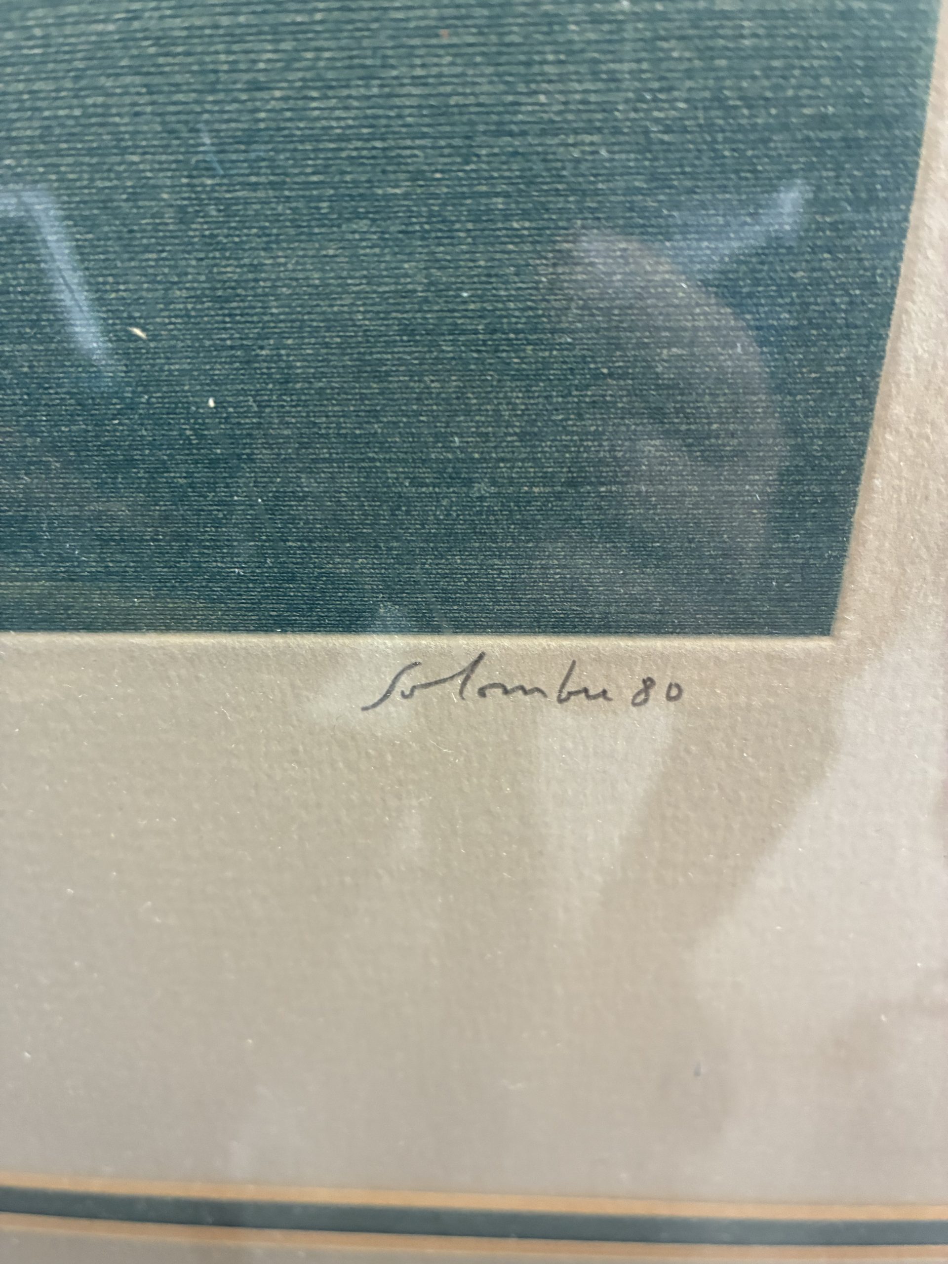 Untitled Aquatint Etching by the modern surrealist, french artist Jean Solombre, ca 1980 beautifully framed in a chrome 1 1/4″ 1/2 round with double matting. In excellent condition, it is signed and dated and measures 33 3/4 X 29 3/4 X 1 1/4″d.