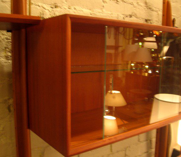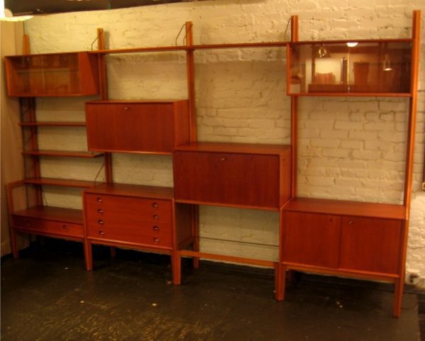 This Four Bay Freestanding Norwegian Wall Unit is made of Honey Teak, from the 1950’s by Gustav Bahus, and is loaded with cabinetry and shelves. It is fully modular, so the pieces may be put anywhere on the frame, and it comes apart and assembles easily and into surprisingly spare pieces. Equipped with a two door cabinet, two drop-front cabinets, two curio cabinets with glass shelves and doors, a four drawer cabinet, a two door cabinet and five 8″ shelves, The five Beech upright supports are thin and sculptural resembling the work of Gio Ponti. The unit has modest minimal quality. It is in very good condition with all locks working, and some deep scratches to the side of the larger drop-front cabinet. Measures 16″d X 79″h X 130″w.