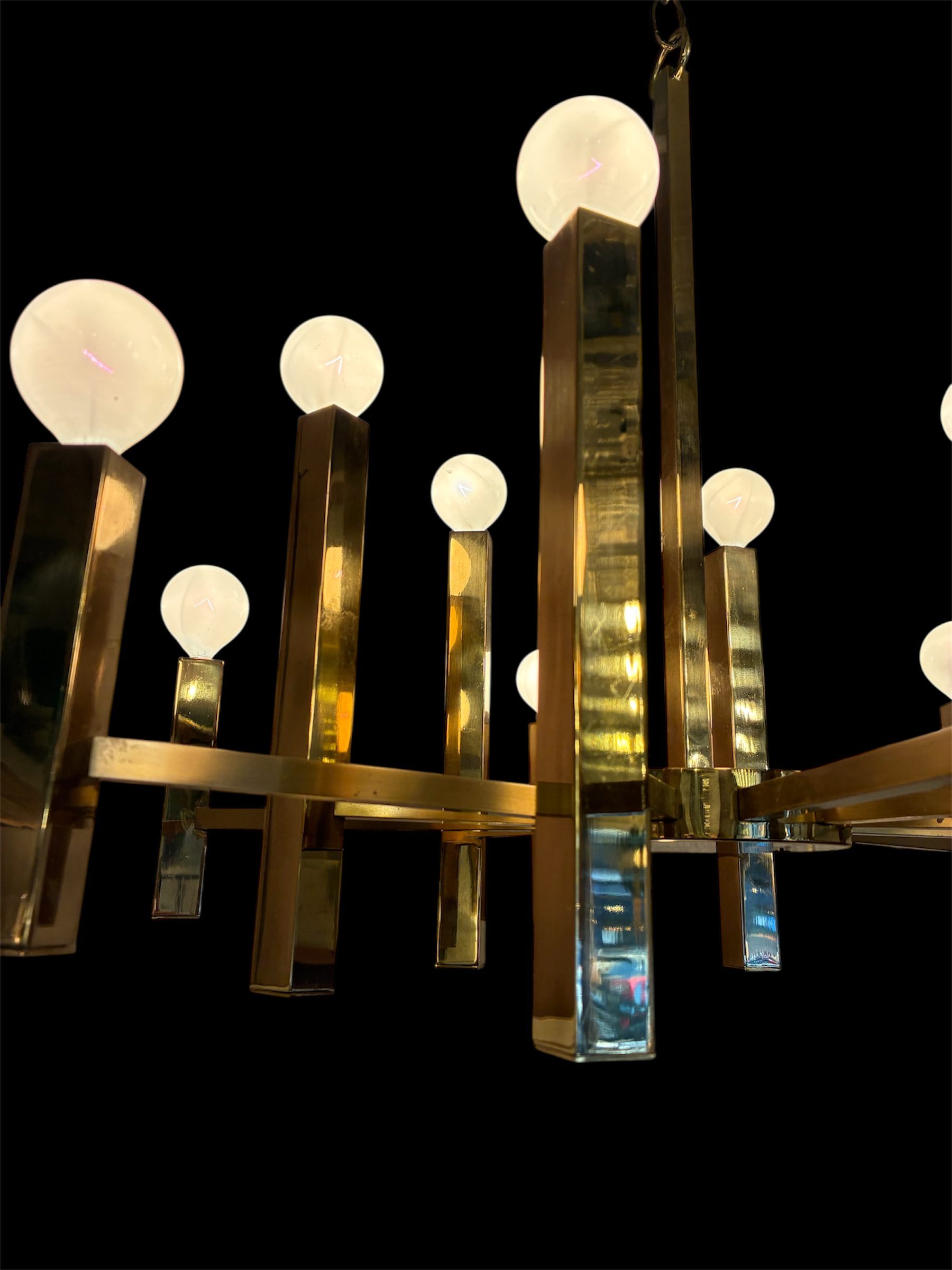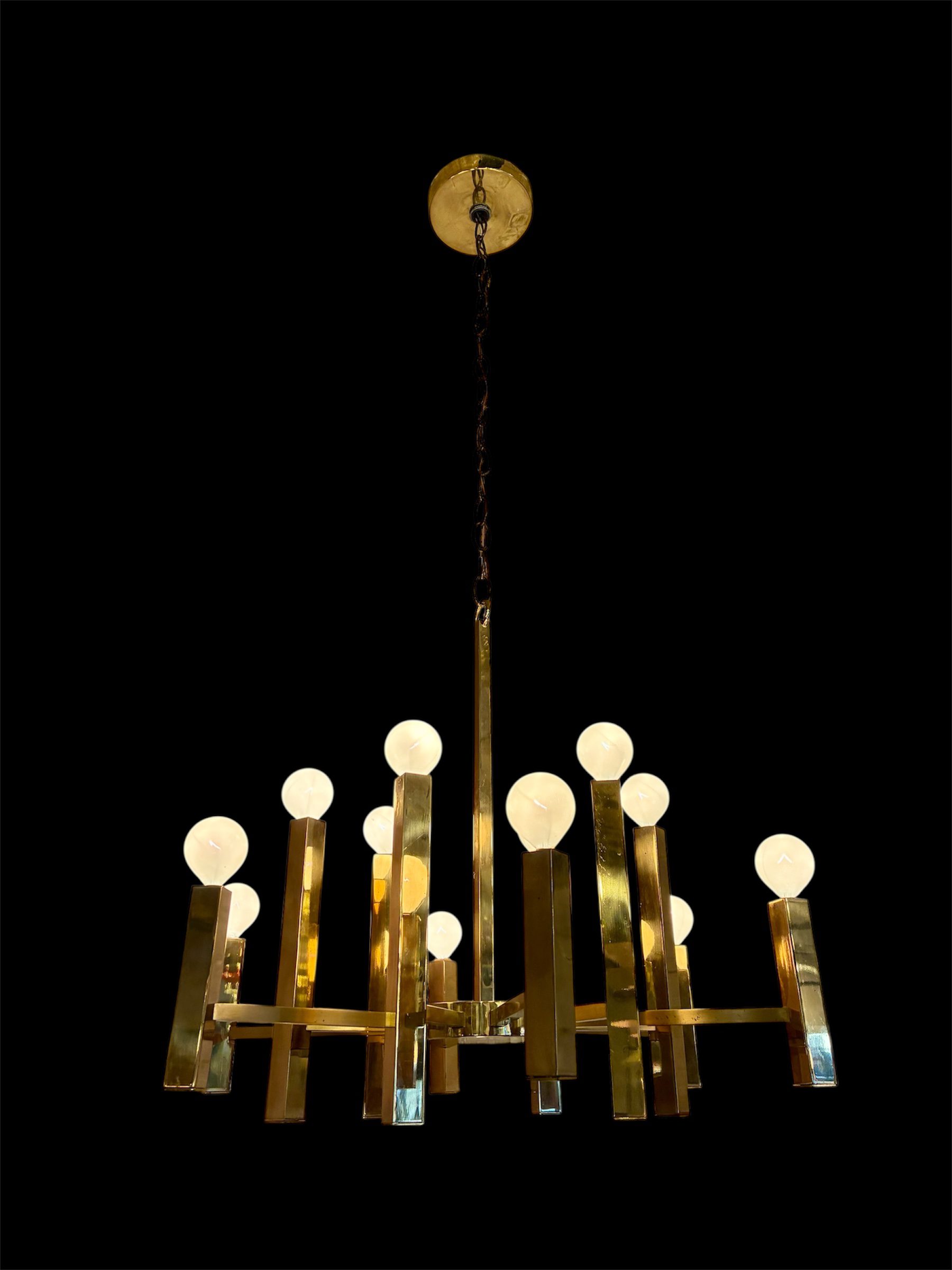 Gaetano Sciolari Brass Twelve Arm Chandelier from the 1970s. The solid brass square stock gives it a slightly more stout feel than other Sciolari lamps and its integration with the center disc is handsome contrast. In excellent condition, it measures 23 3/4 X 23 3/4 X 21 (to top of stem) or 12 (to top of tall candlestick). $995