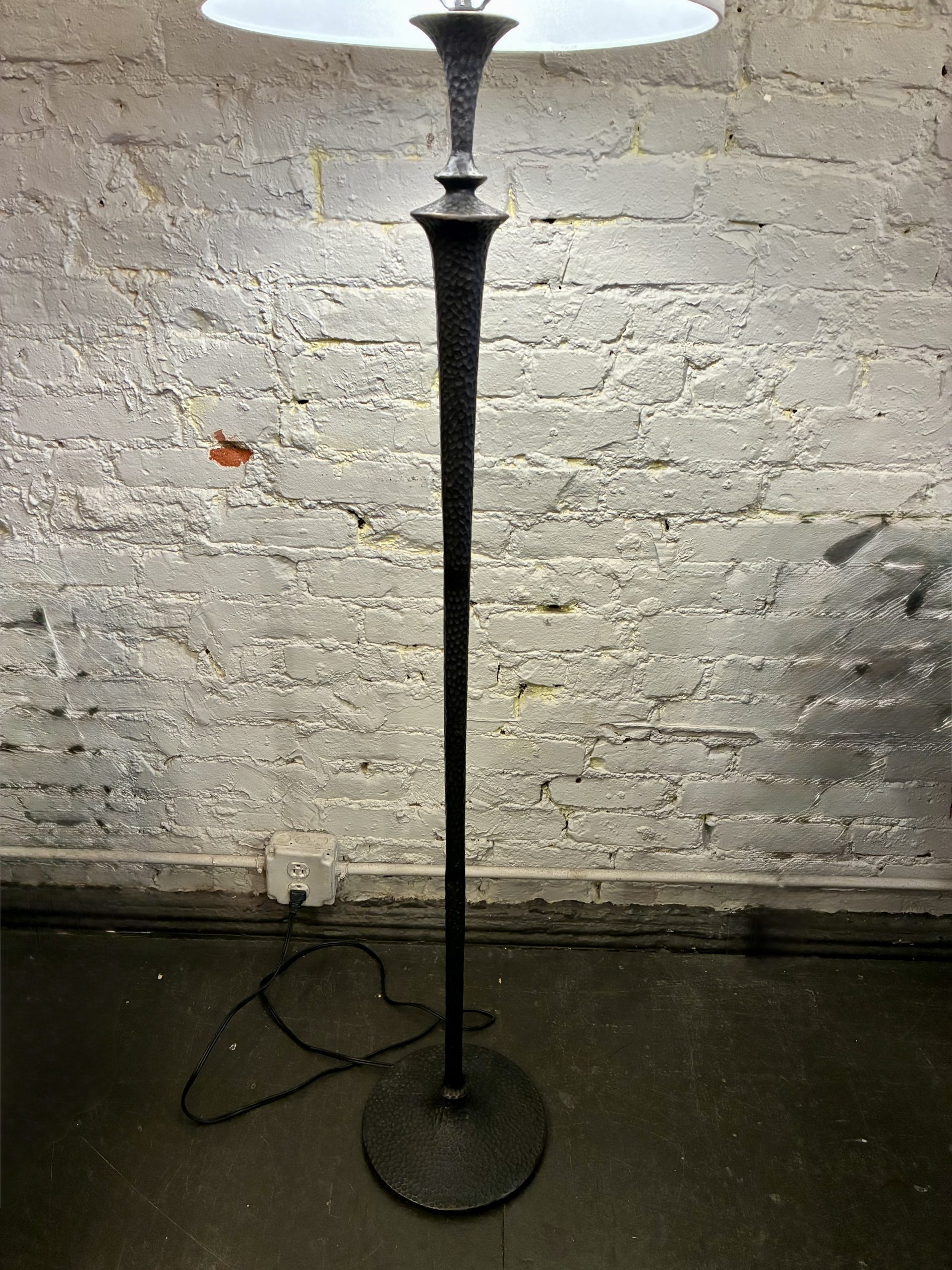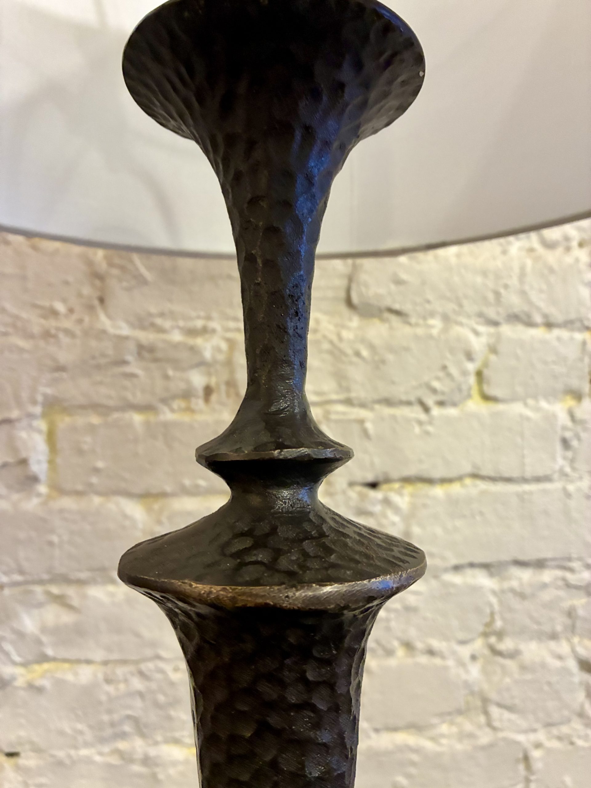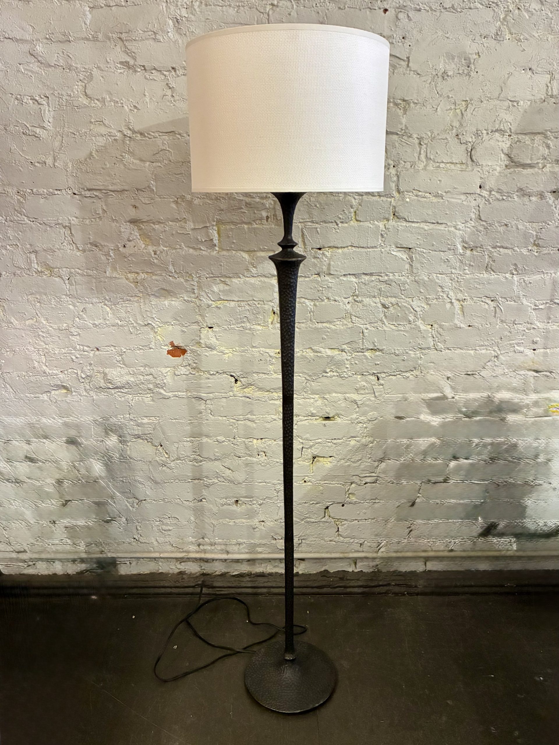 Hammered Bronze Floor Lamp, 1990. It’s not often we get solid bronze objects, and this one really makes its mark-warm, statuesque and hand crafted. Stands 58″ high with a 15″d white linen shade. $895.
