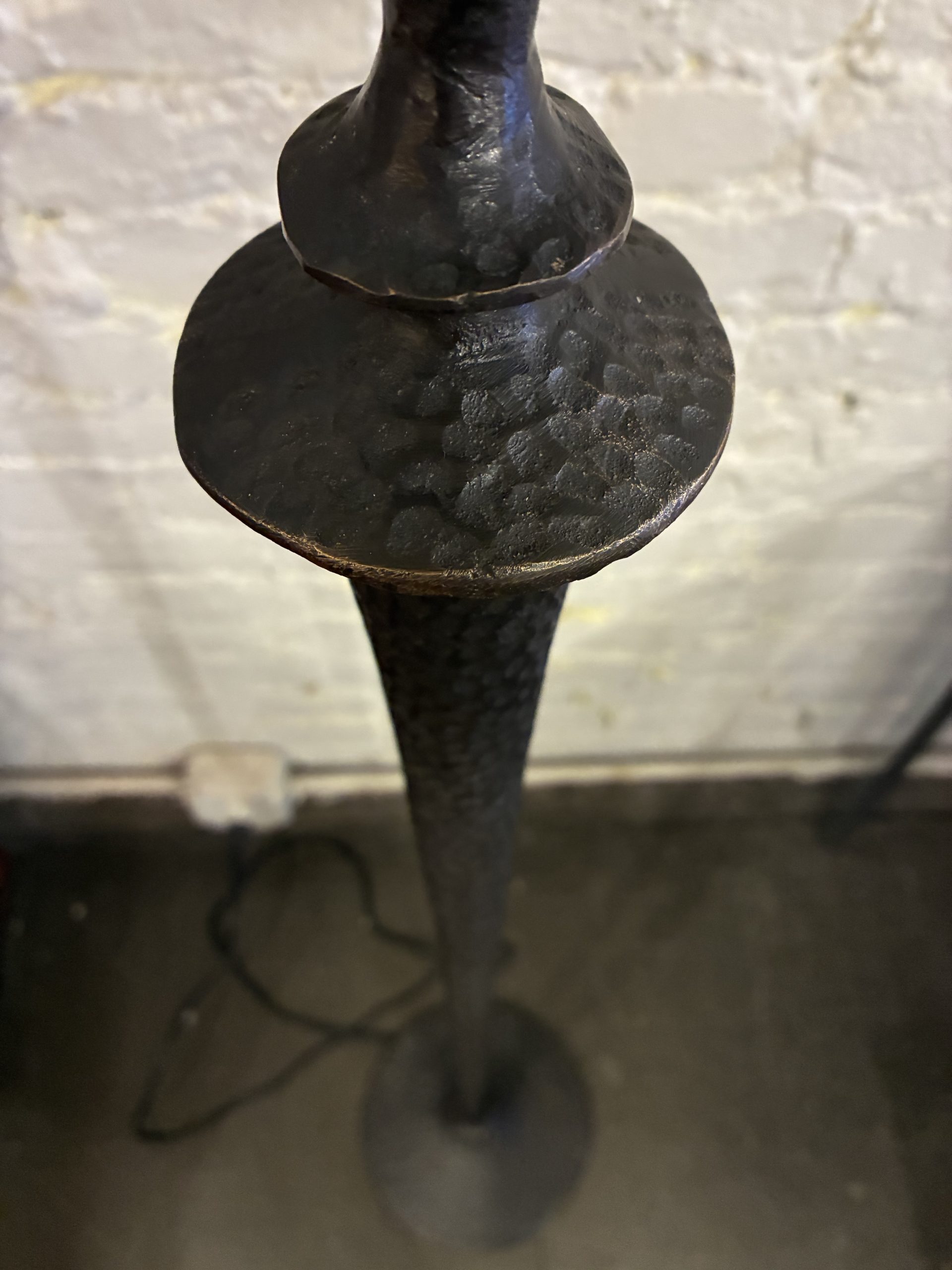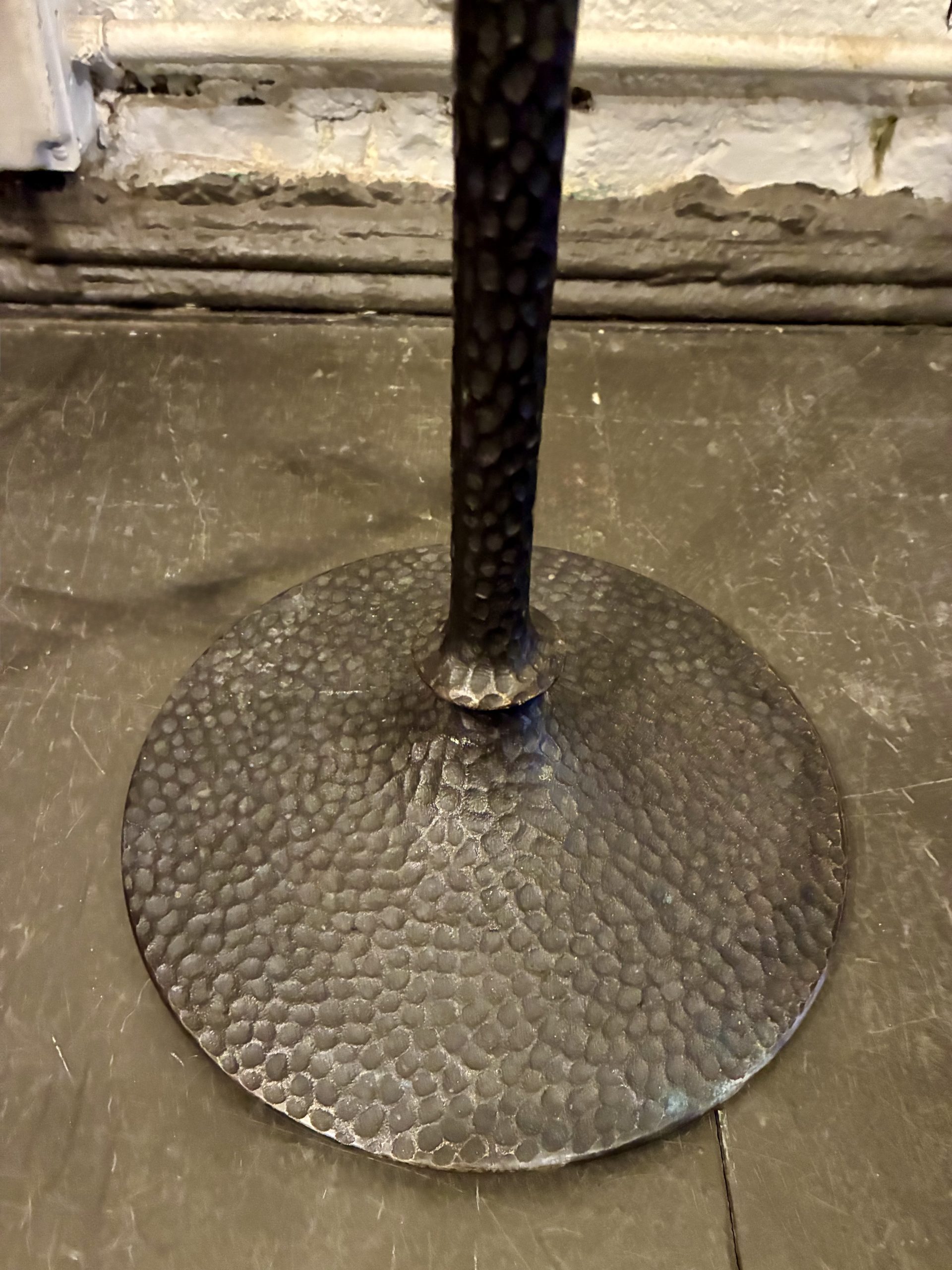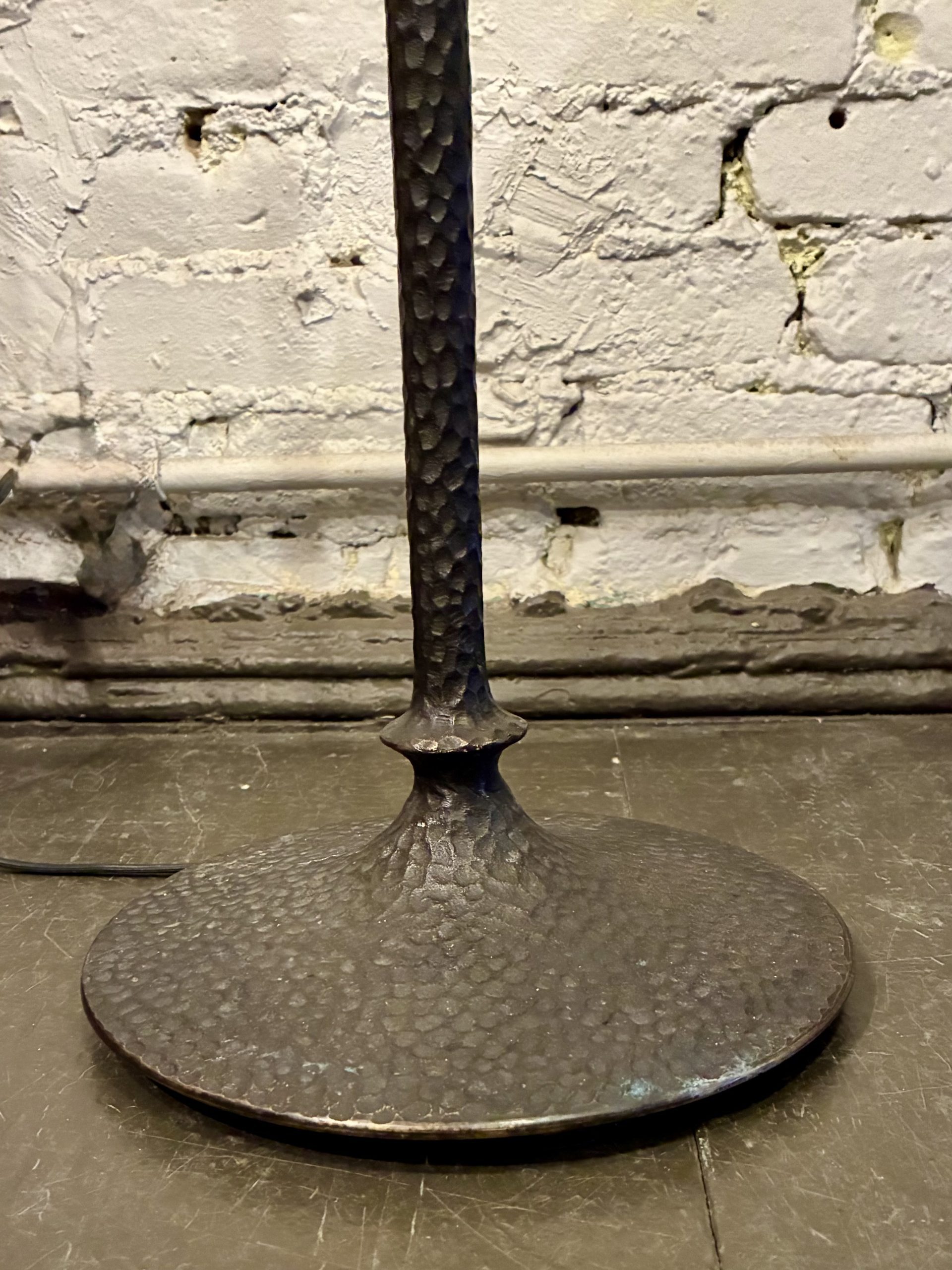 Hammered Bronze Floor Lamp, 1990. It’s not often we get solid bronze objects, and this one really makes its mark-warm, statuesque and hand crafted. Stands 58″ high with a 15″d white linen shade. $895.