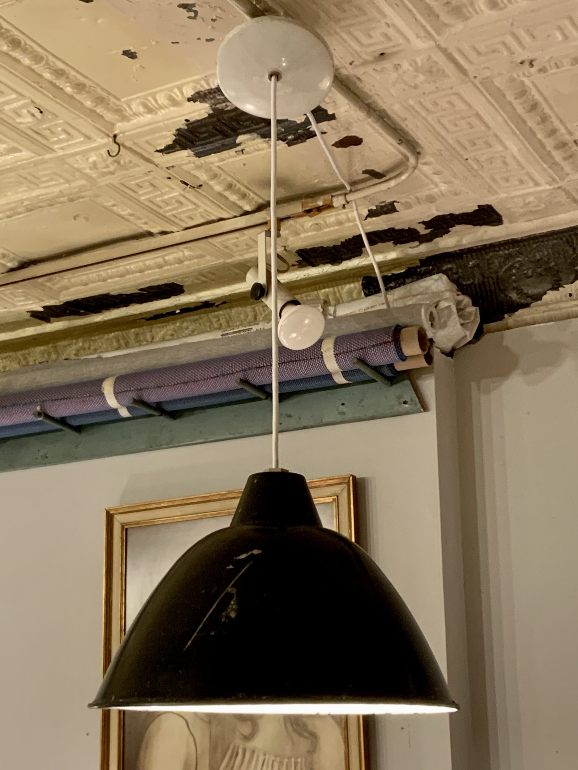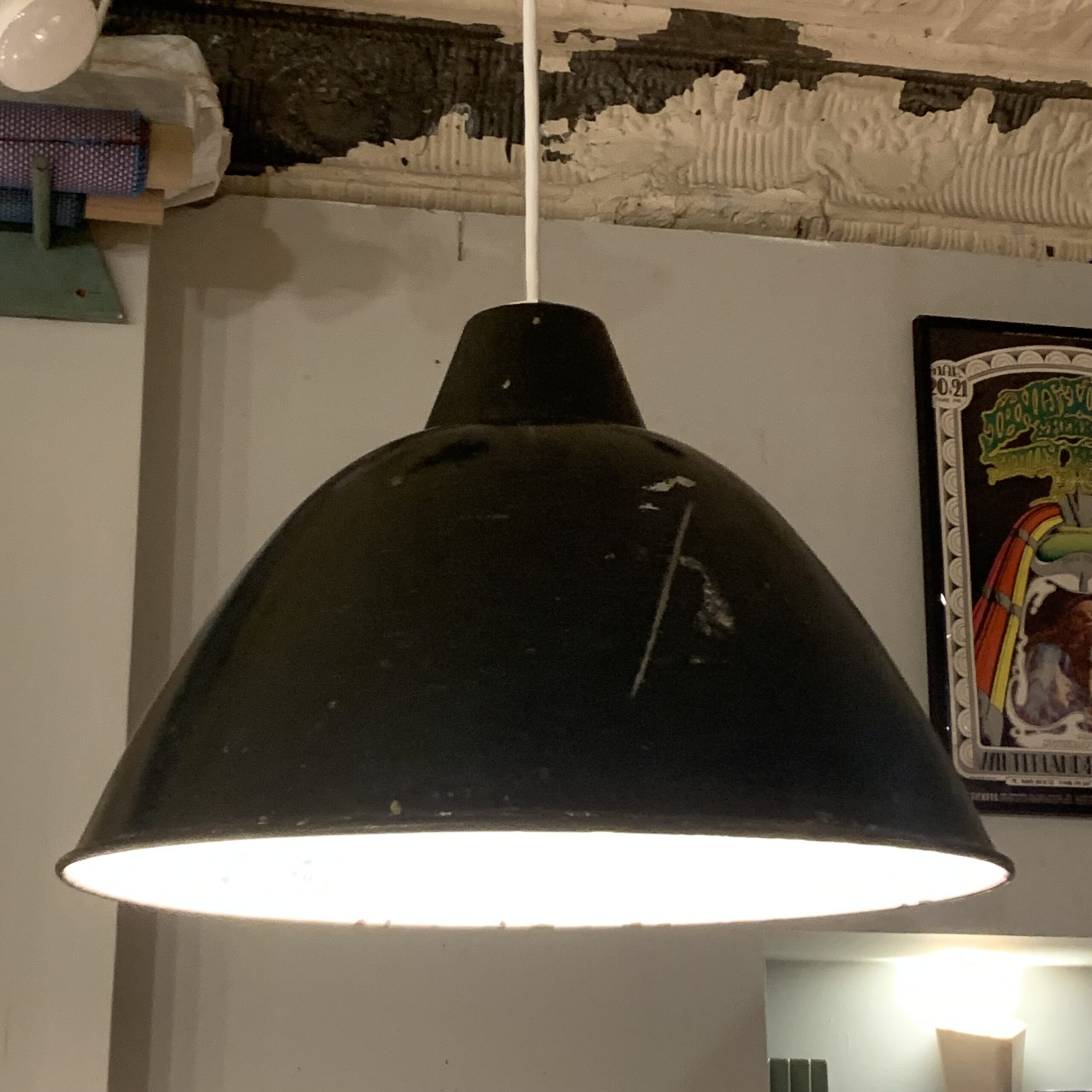 Nicely shaped and large in scale Industrial Enameled Pendant Lamp with a white interior and a black exterior. Heavy duty gauge metal with lots of patina, it measures 18″d X 13″h.