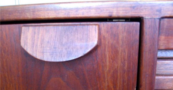 This Jens Risom Walnut Credenza was made in the 1950s and has a large vertically moving tambour door on the right with a single adjustable shelf, and a swinging door on the left with another adjustable shelf. It is in good condition with some wear to the finish. A perfect candidate for a media stand, as it is stout and will store great amounts, but is not overwhelmingly large. Marked with Risom label, measures 21 1/2″d X 32″h X 54″L.