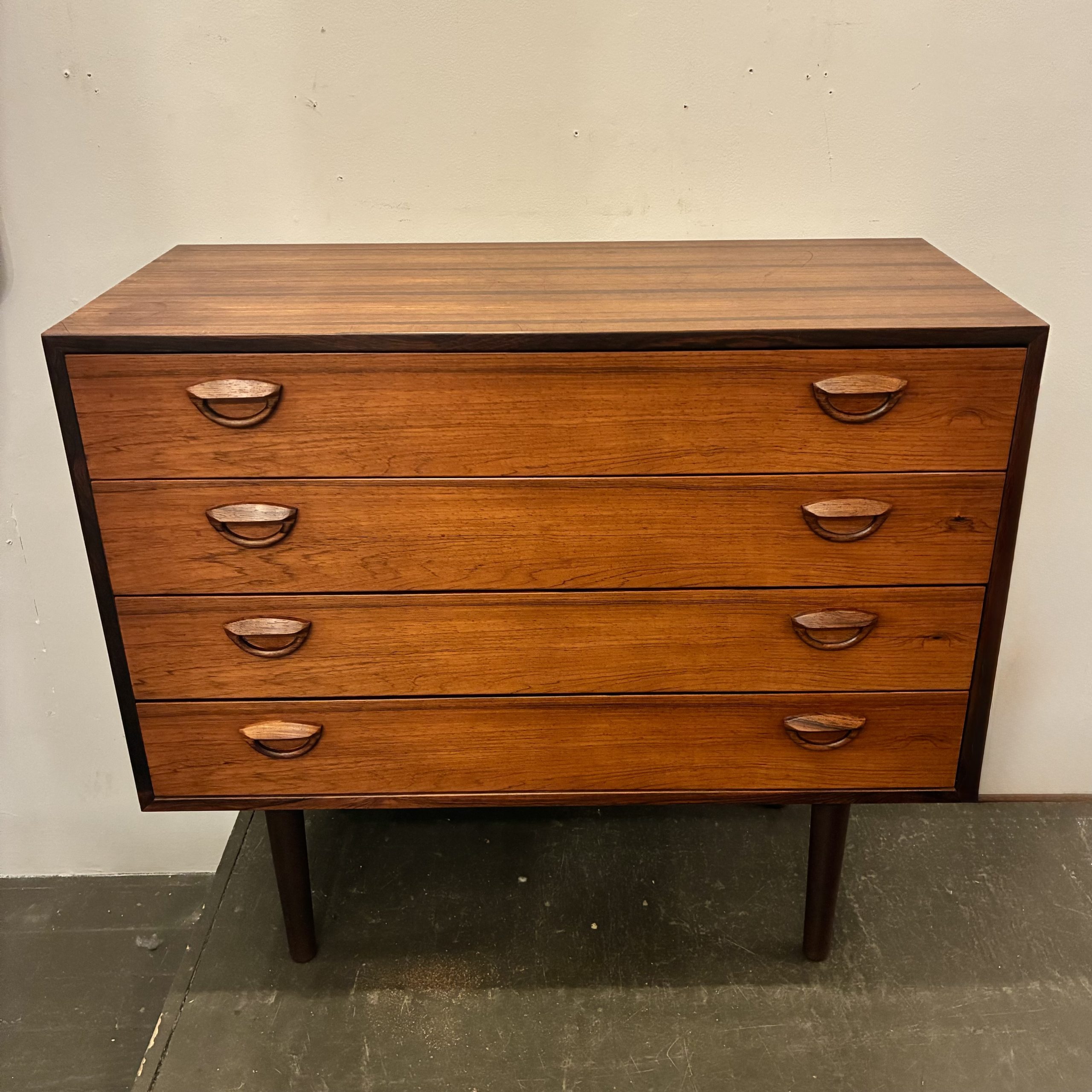 Kai Kristiansen Brazilian Rosewood Four Drawer Dresser by FM Mobler, Denmark, CA 1960. In very good original condition with light wear on top. Measures 33 1/2 X 16 X 30″h. $1,650
