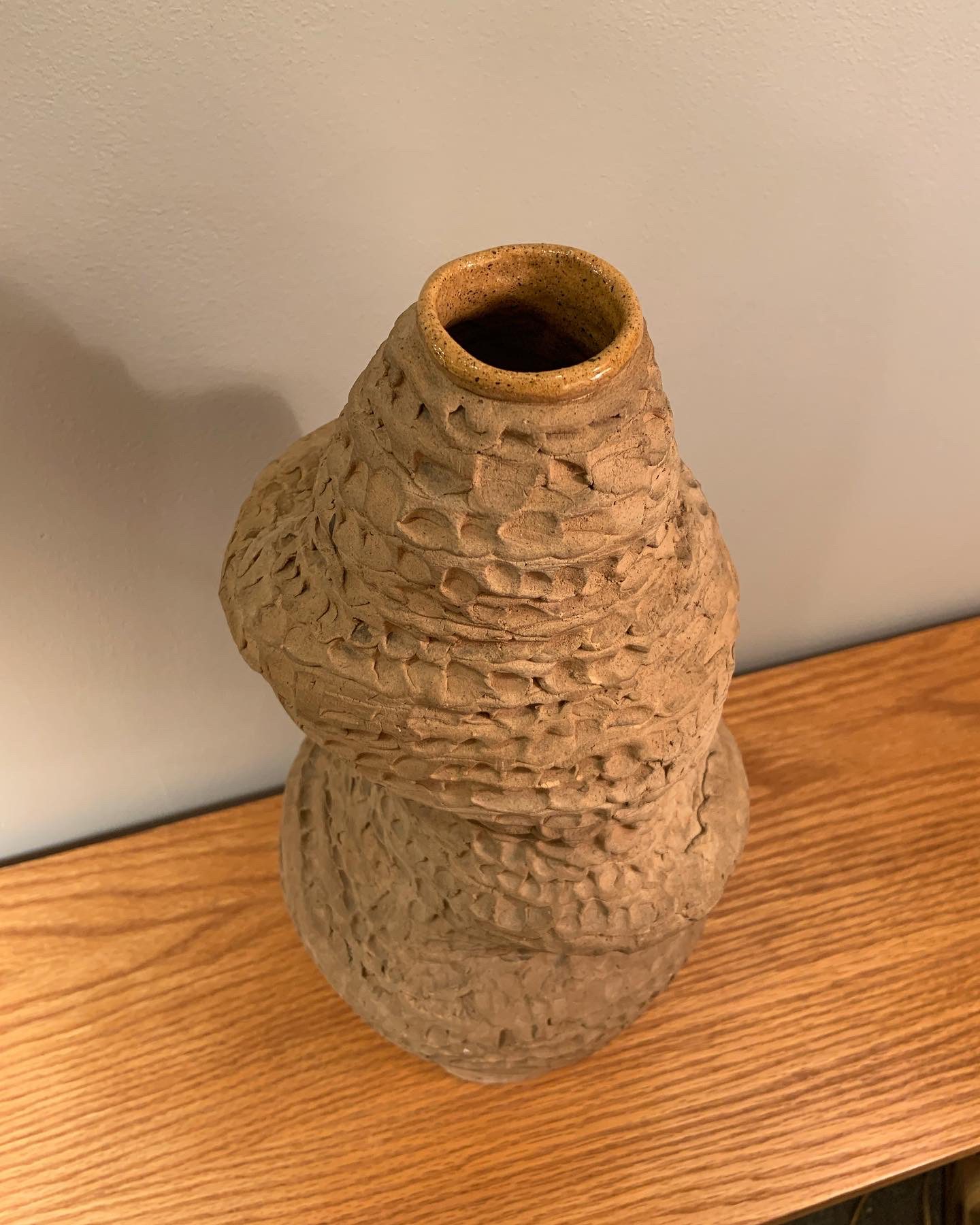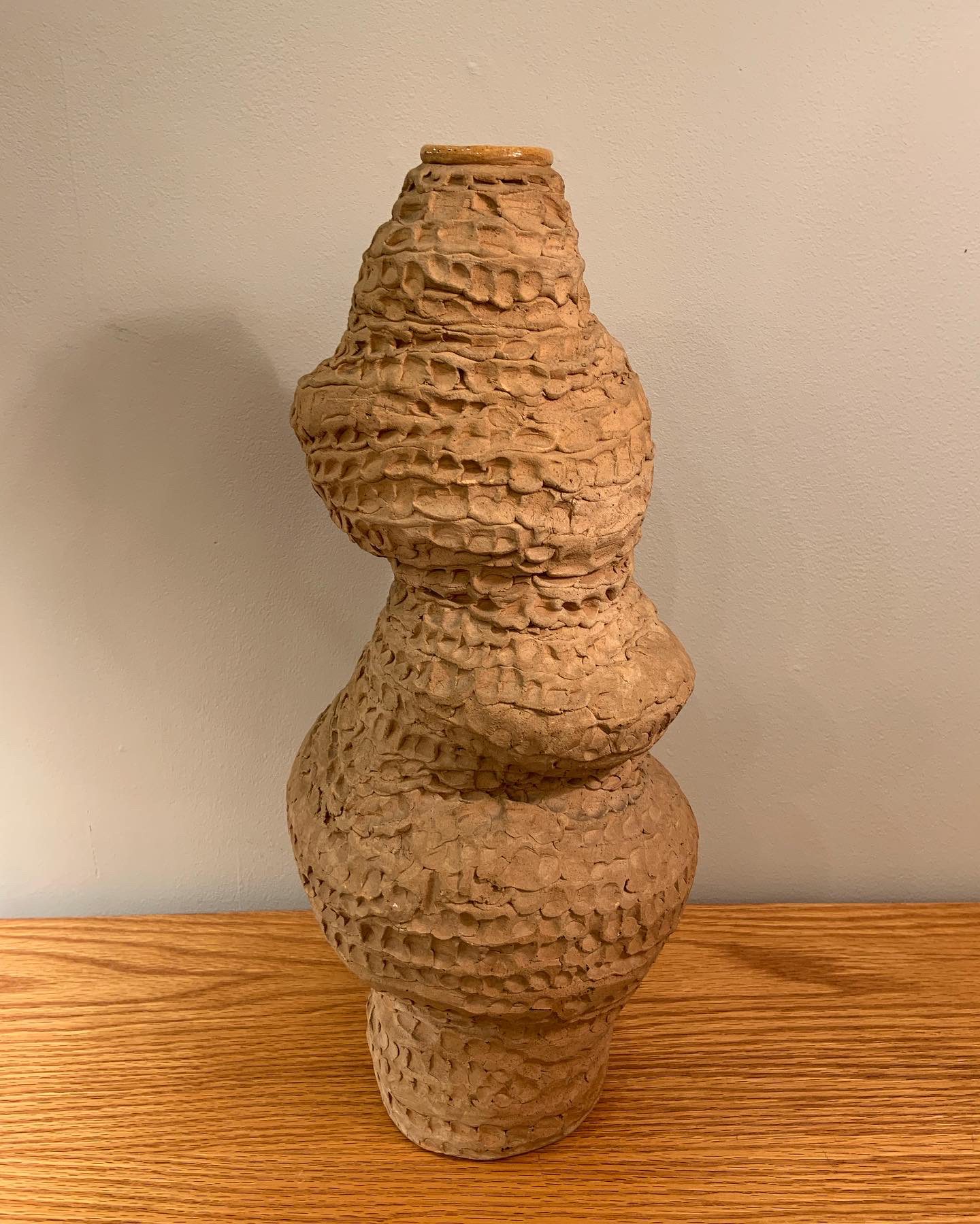 Large Studio Vase with Pinch Decor by Miriam Hirshboum in 1984. Measures 6 1/2 X 7 X 16 1/2″h.