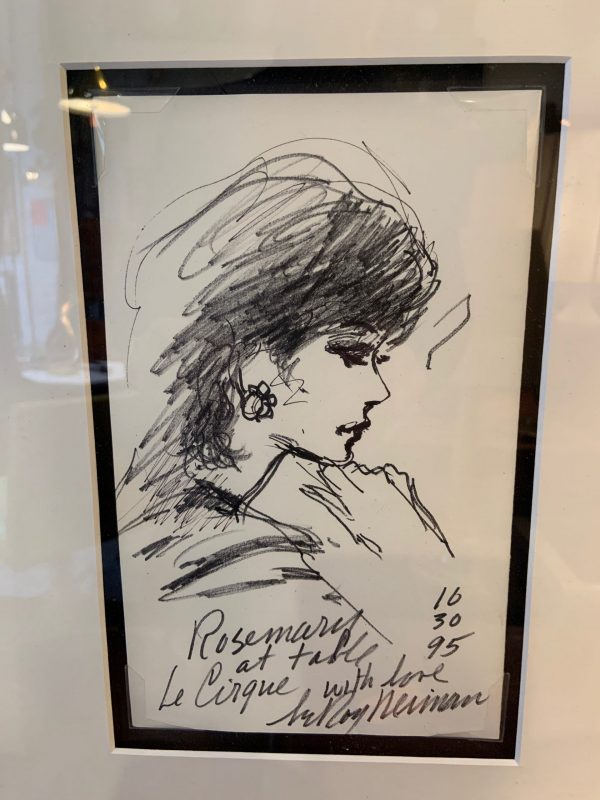 A wonderful Leroy Neiman Original Table Side Sketch done at Le Cirque circa 1995 depicting a glamorous Rosemary in a pensive pose. A highly evocative rendering, with a lovely pathos for the subject and place. Measures 14 1/2 X 18.