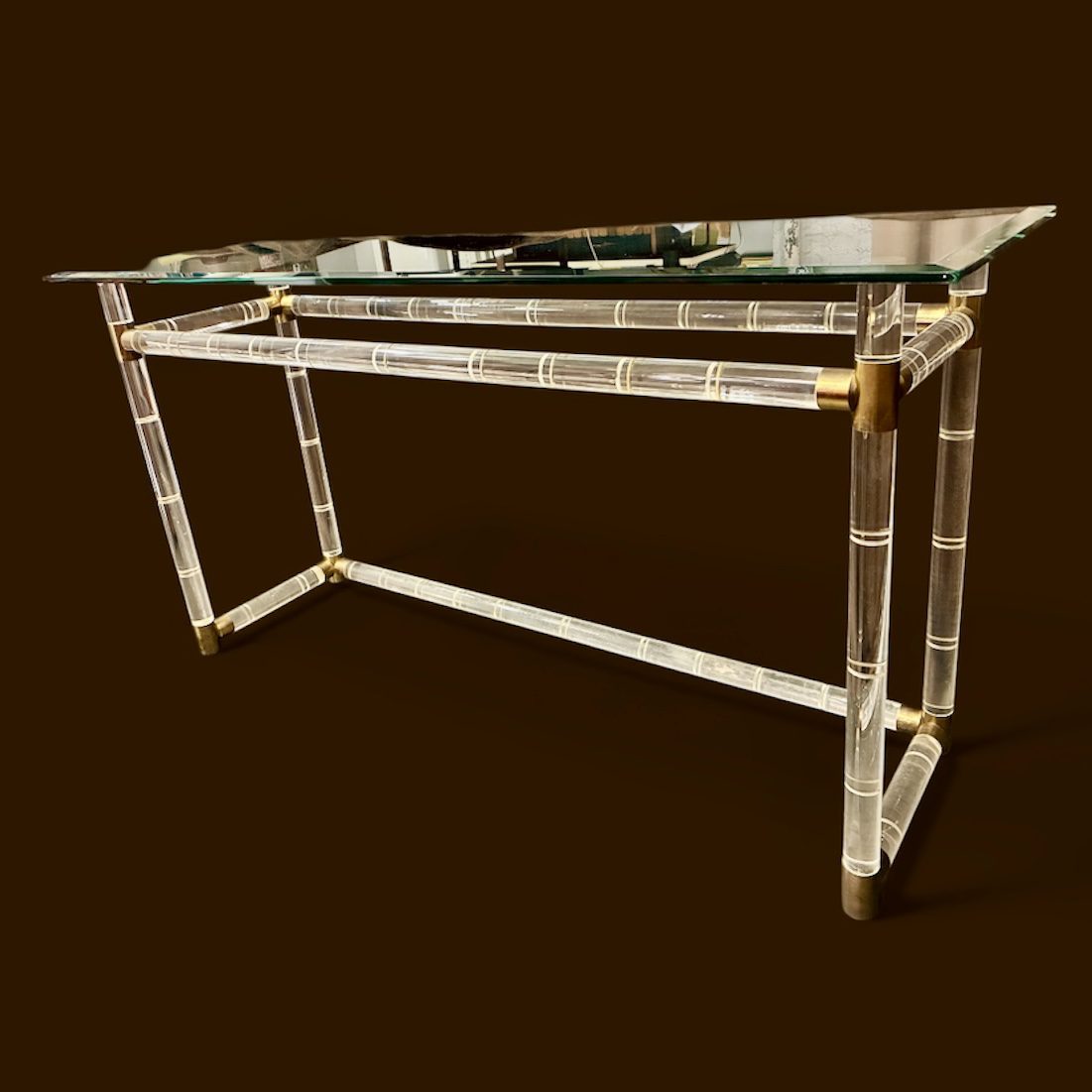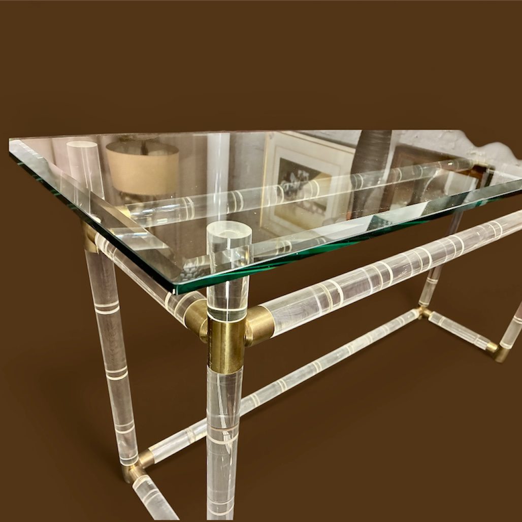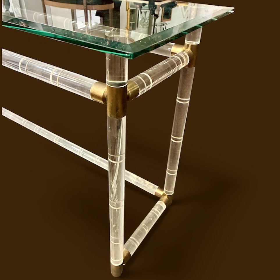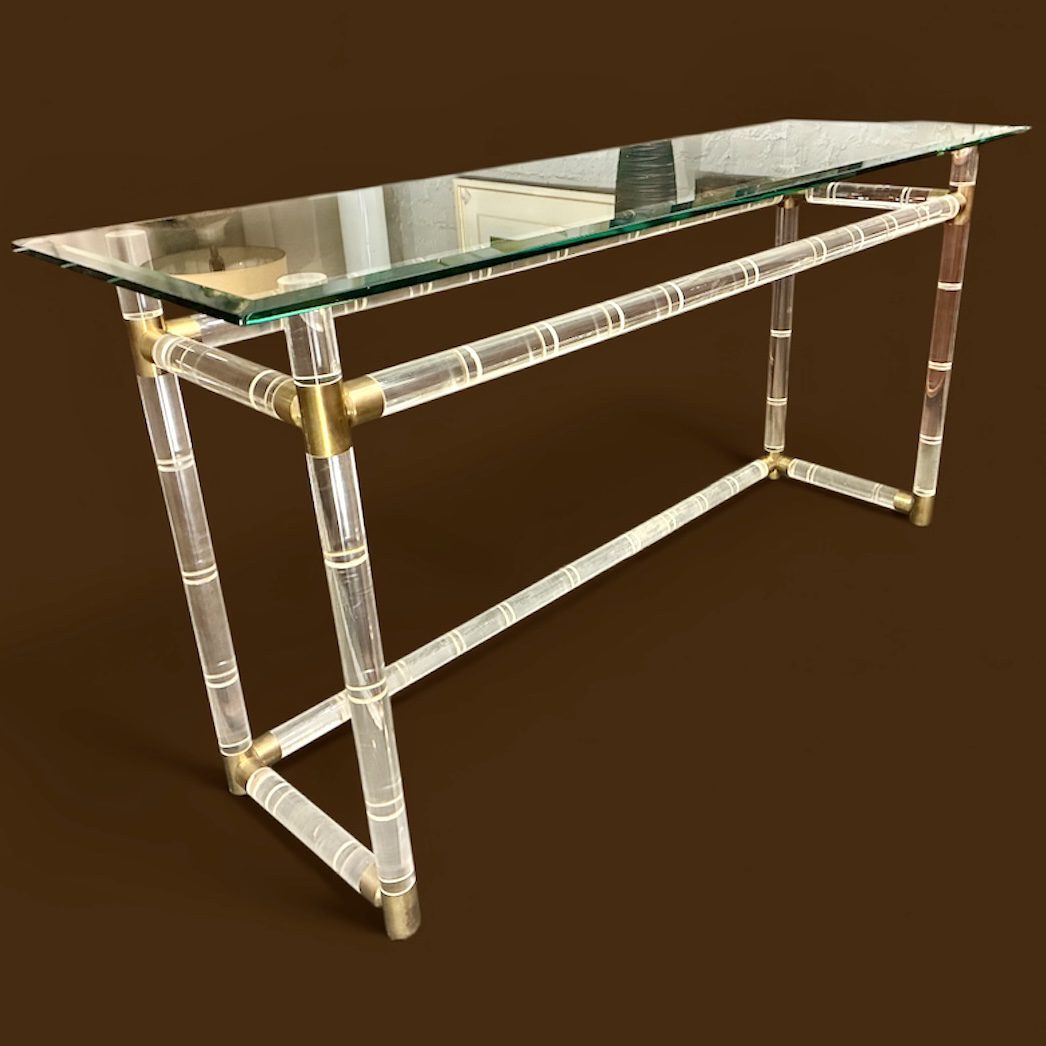 Lucite & Brass “Bamboo” Console Table attr. to Charles Hollis Jones, with original beveled glass top. In very good condition, it measures 18 X 56 X 28 1/2″h. $995
