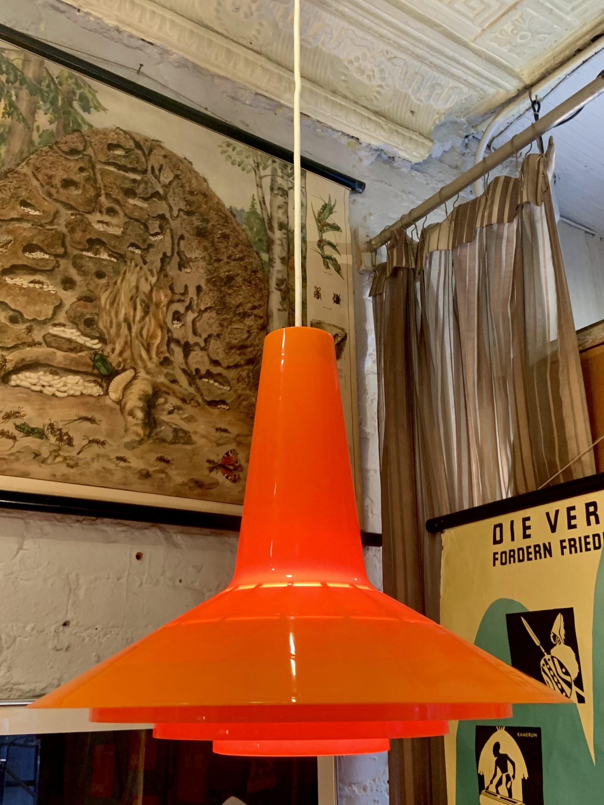 Molded plastic Orange Pendant Lamp by Bent Karlby for A. Schroder Kemi, Denmark, 1970s. Measures 14 X 11 1/2″h with a 4ft + drop. White lamp also available.