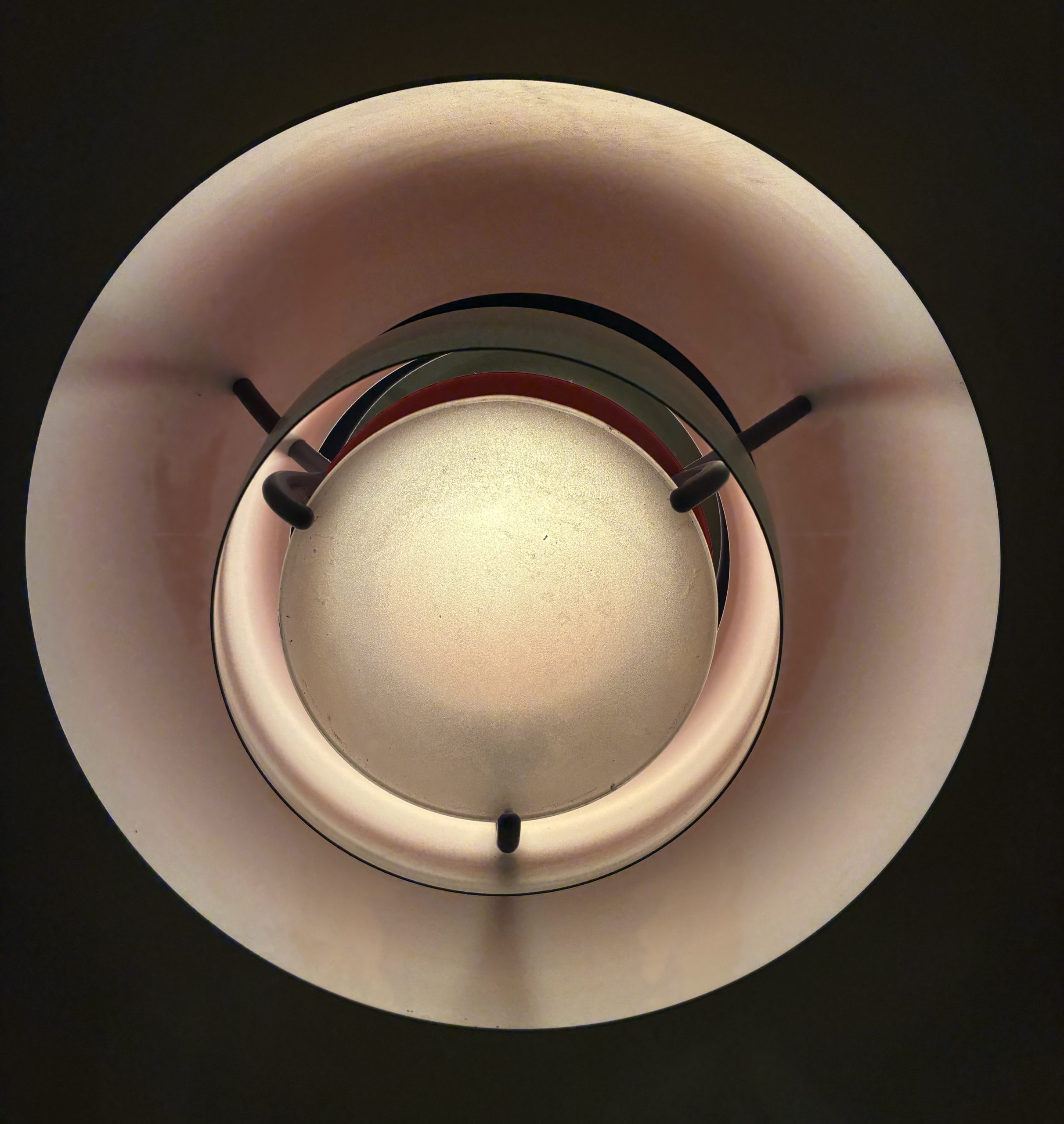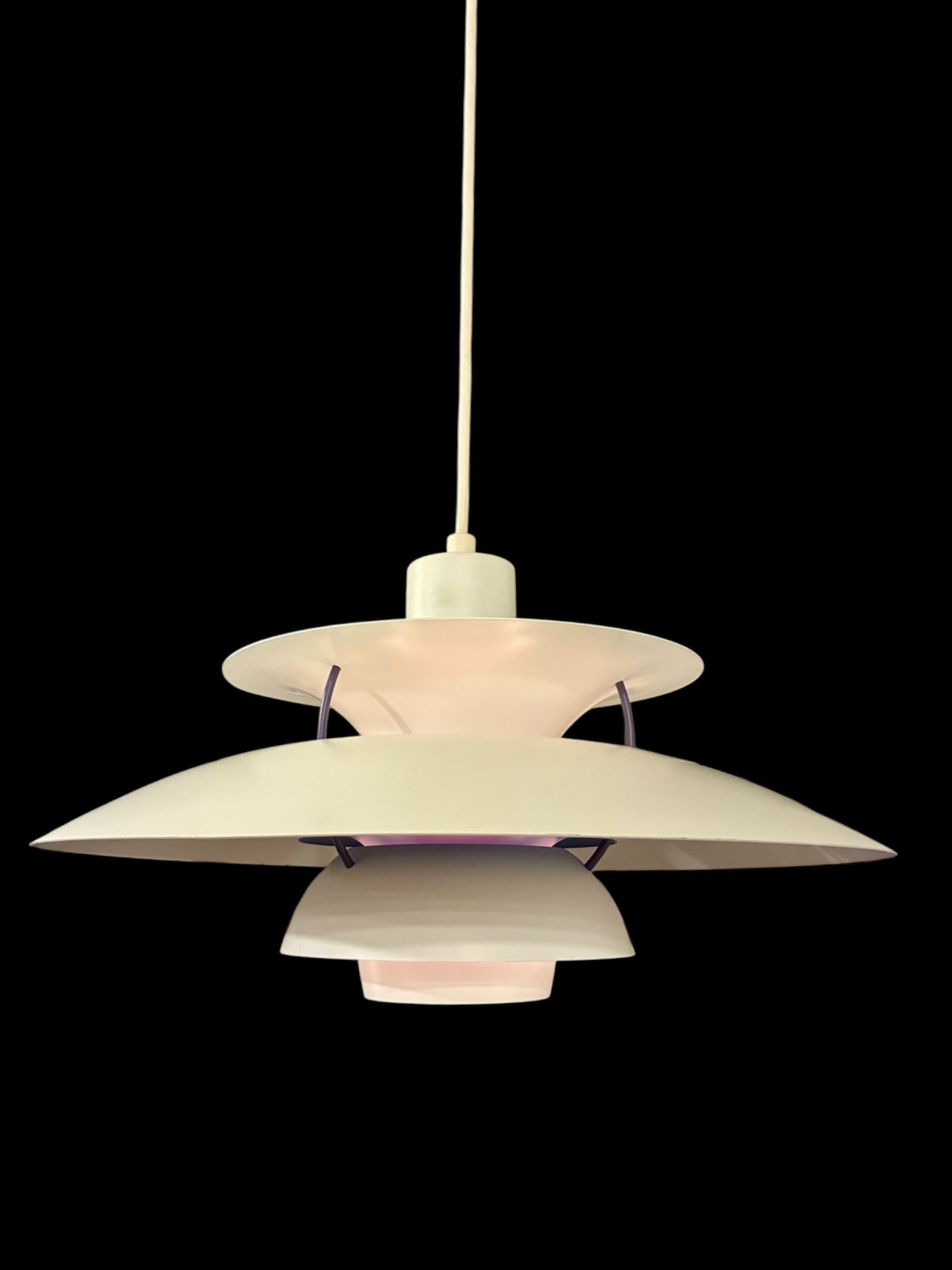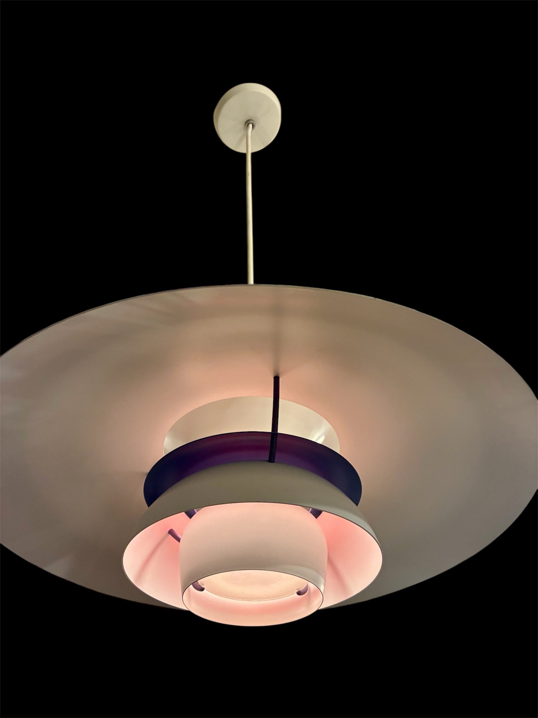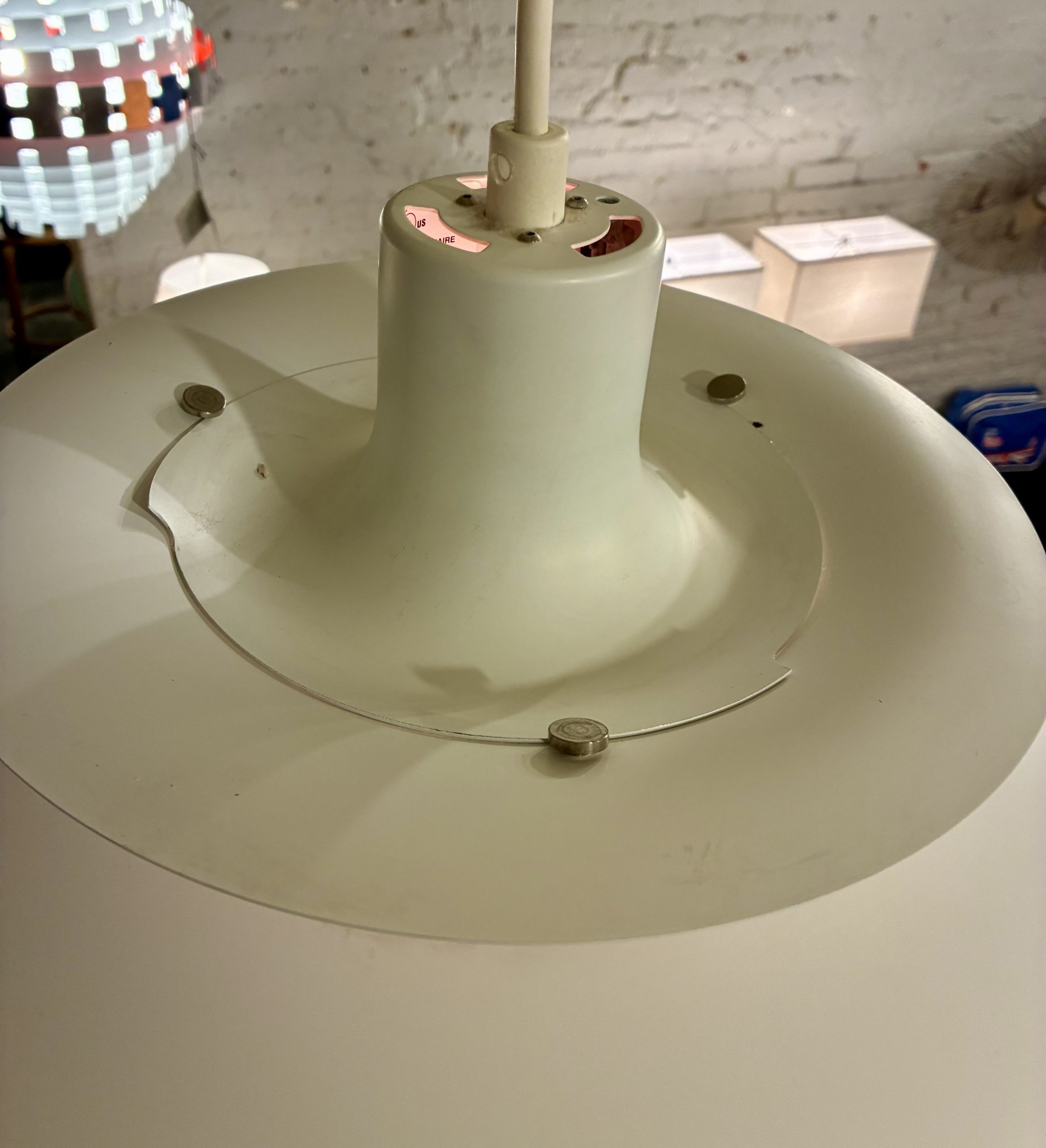 Pair of Poul Heningsen White and Blue PH5 Pendant Lamps by Louis Poulsen, well marked and dated 1987, with an opaque glass diffuser. In very good condition they measure 19 3/8″d and are wired for up to a 3 foot drop. $1,250 pair.