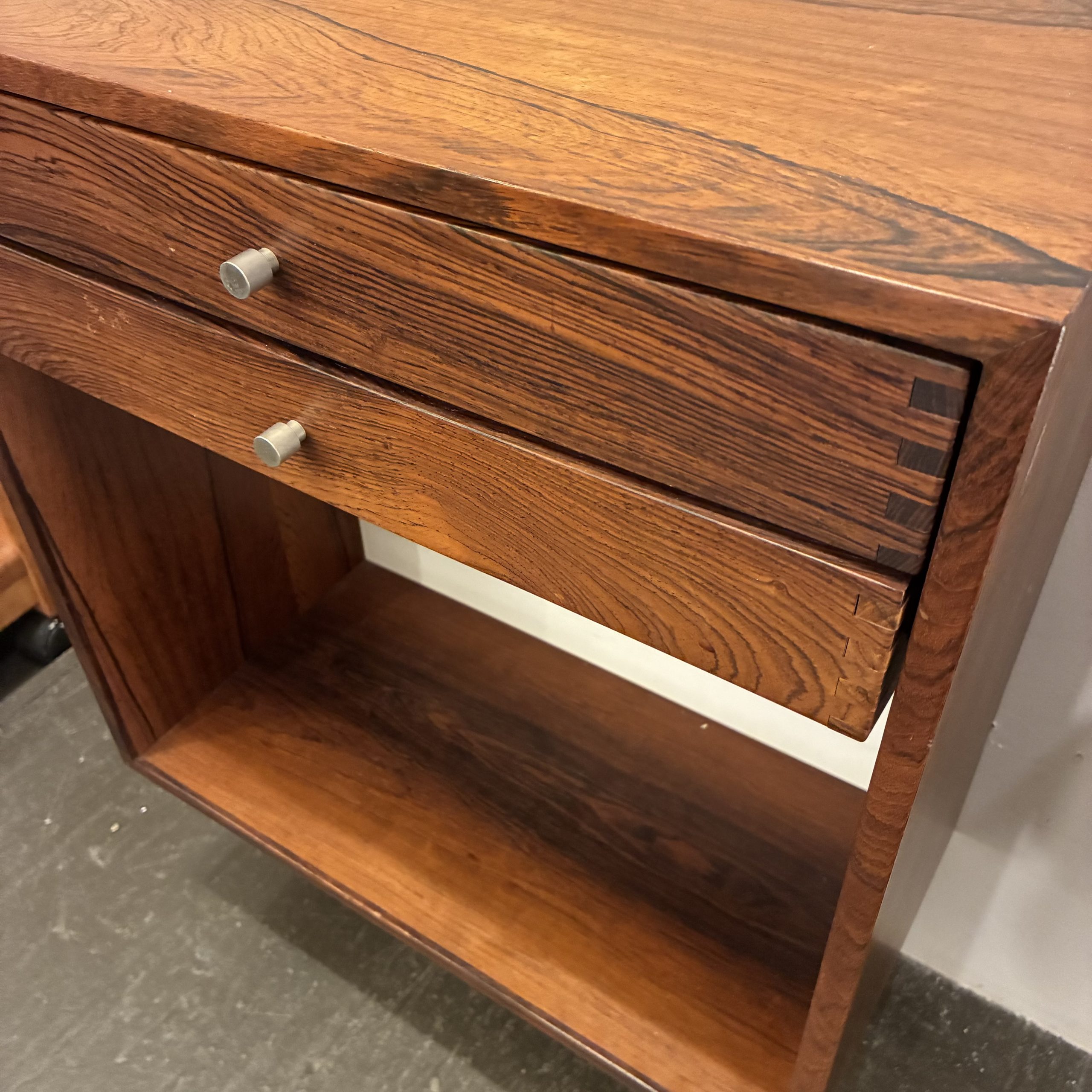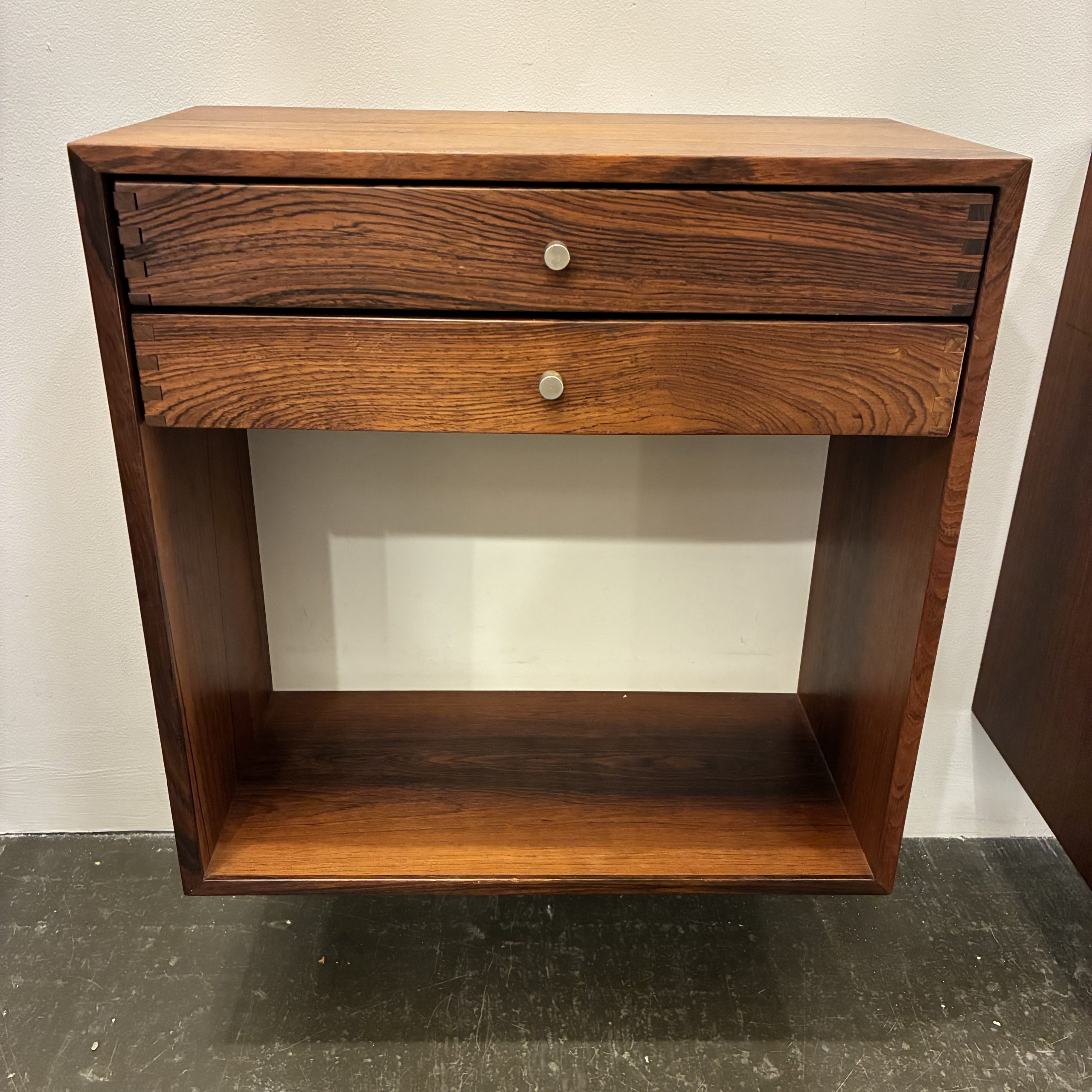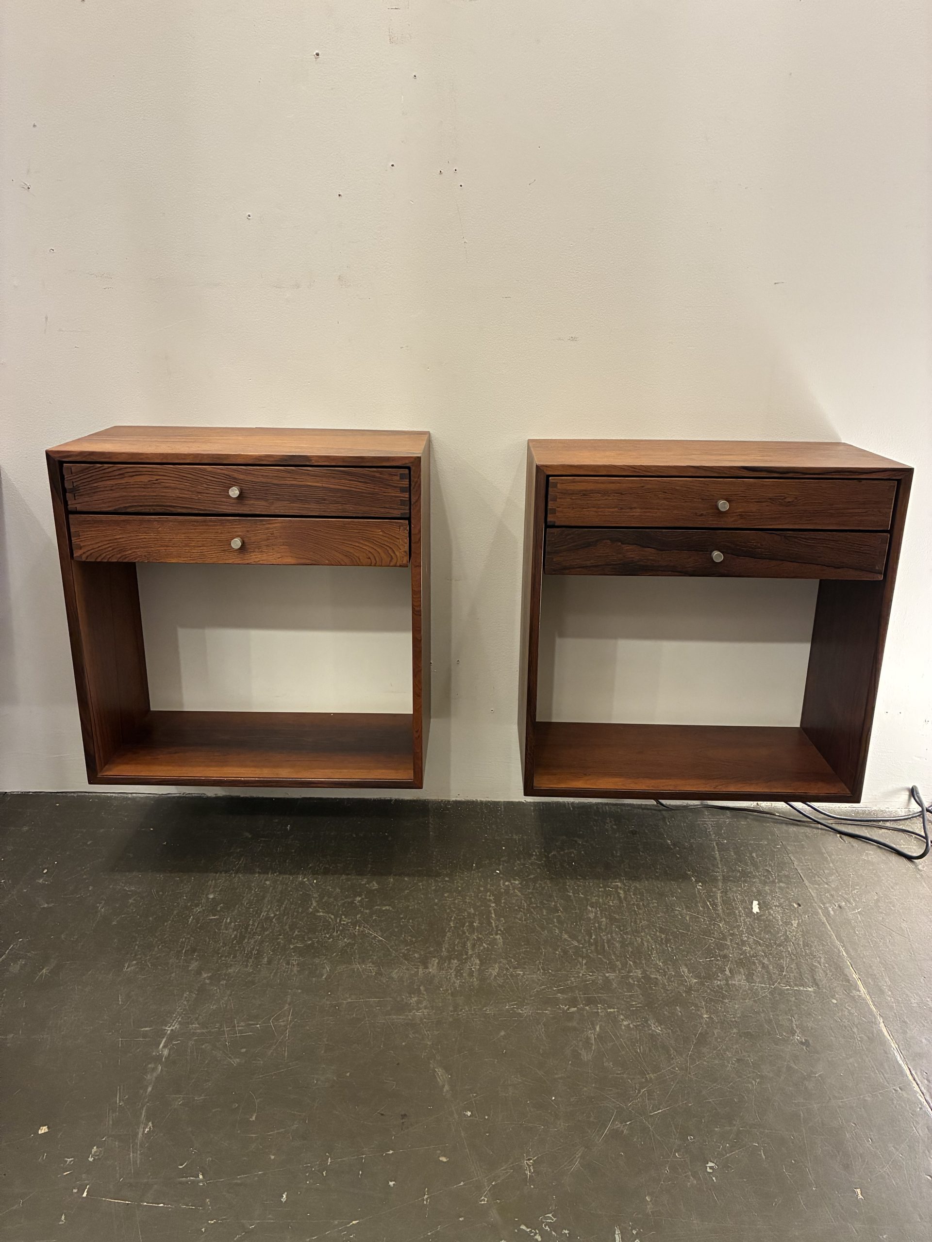 Pair of Wall Mounted Rosewood Nightstands by Kai Kristiansen for Aksel Kjersgaard, each with two dovetailed drawers and a white masonite back. They are at once modest yet impressive. Denmark, 1960s. They measure 17 3/4 Sq. X 9″d. $2,750.