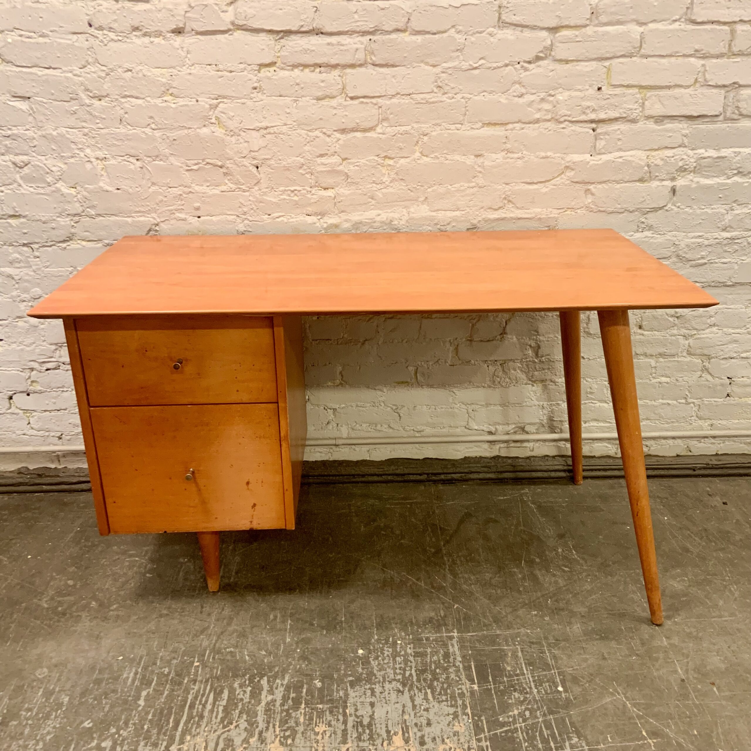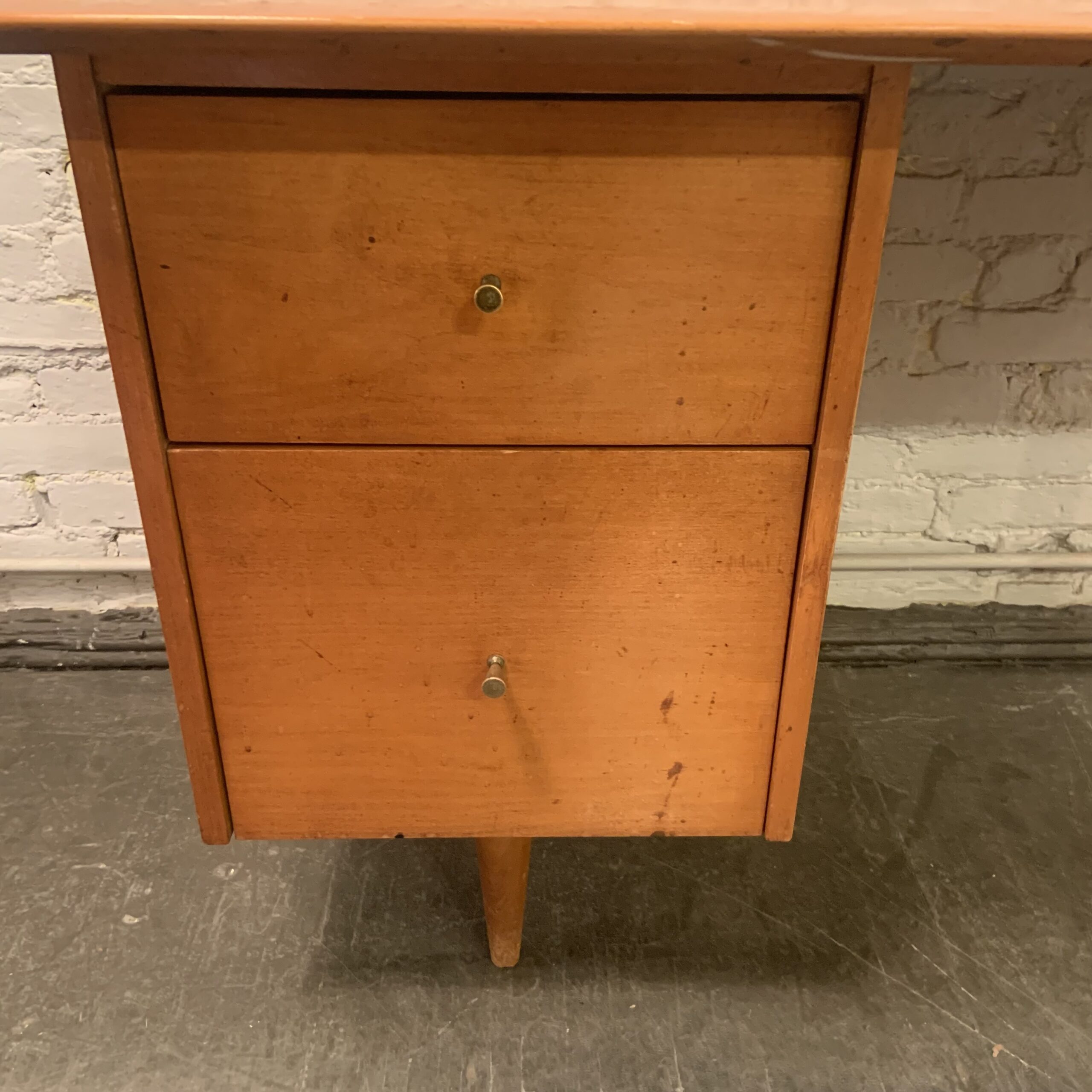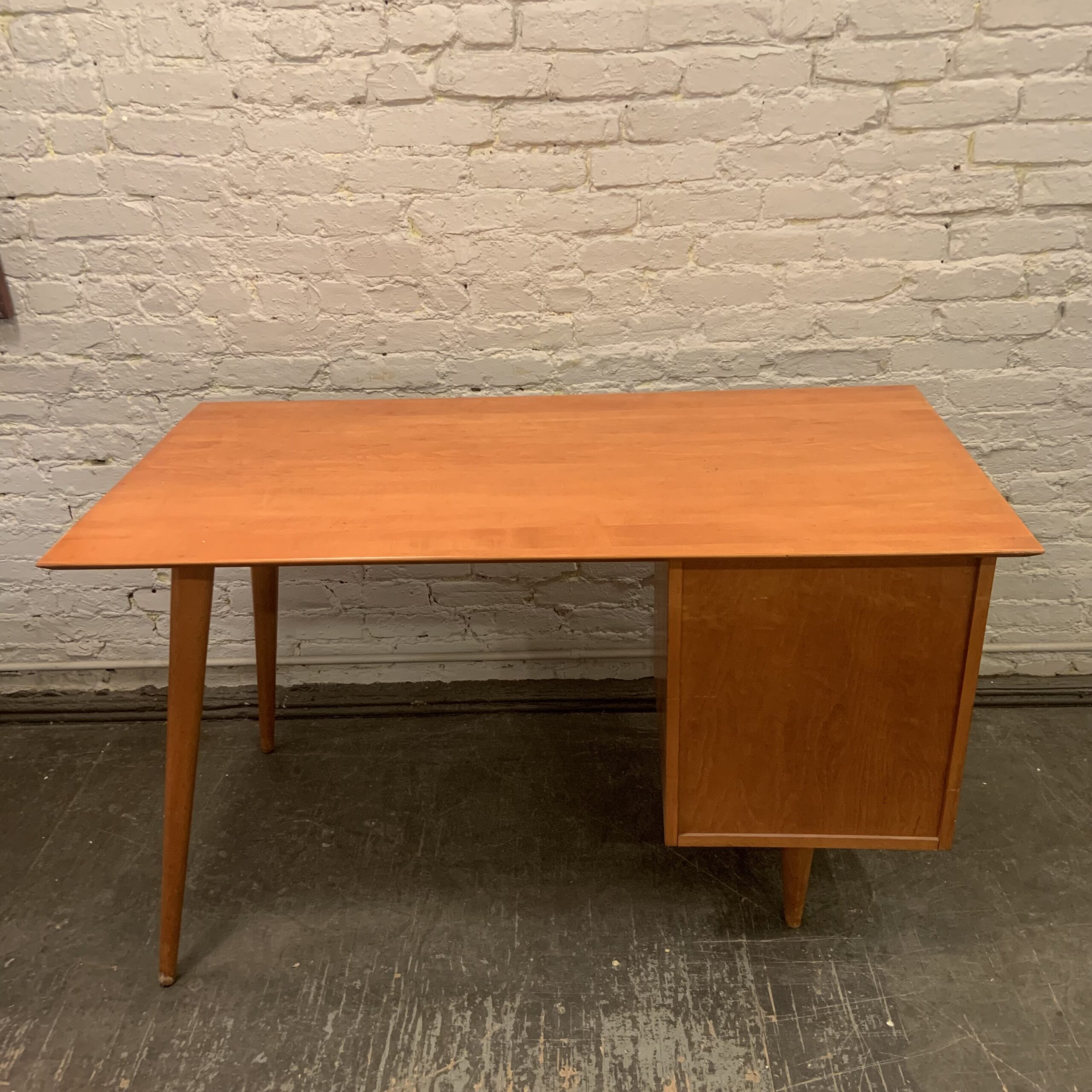 It’s easy to see why this Paul McCobb Planner Group Desk from the 1950s has become such a sought after classic. Its plain design, born from incorporating the tools used for the manufacture of reproduction colonial furniture, is a lesson in restrained modesty which yields a wonderful sense of loftiness while maintaining a no nonsense simplicity about it. Made by Winchedon Furniture and well marked with a Planner Group label in top drawer, it is in very good condition with some light wear to the drawer fronts. Measures 24 X 48 X 29 1/2″h.