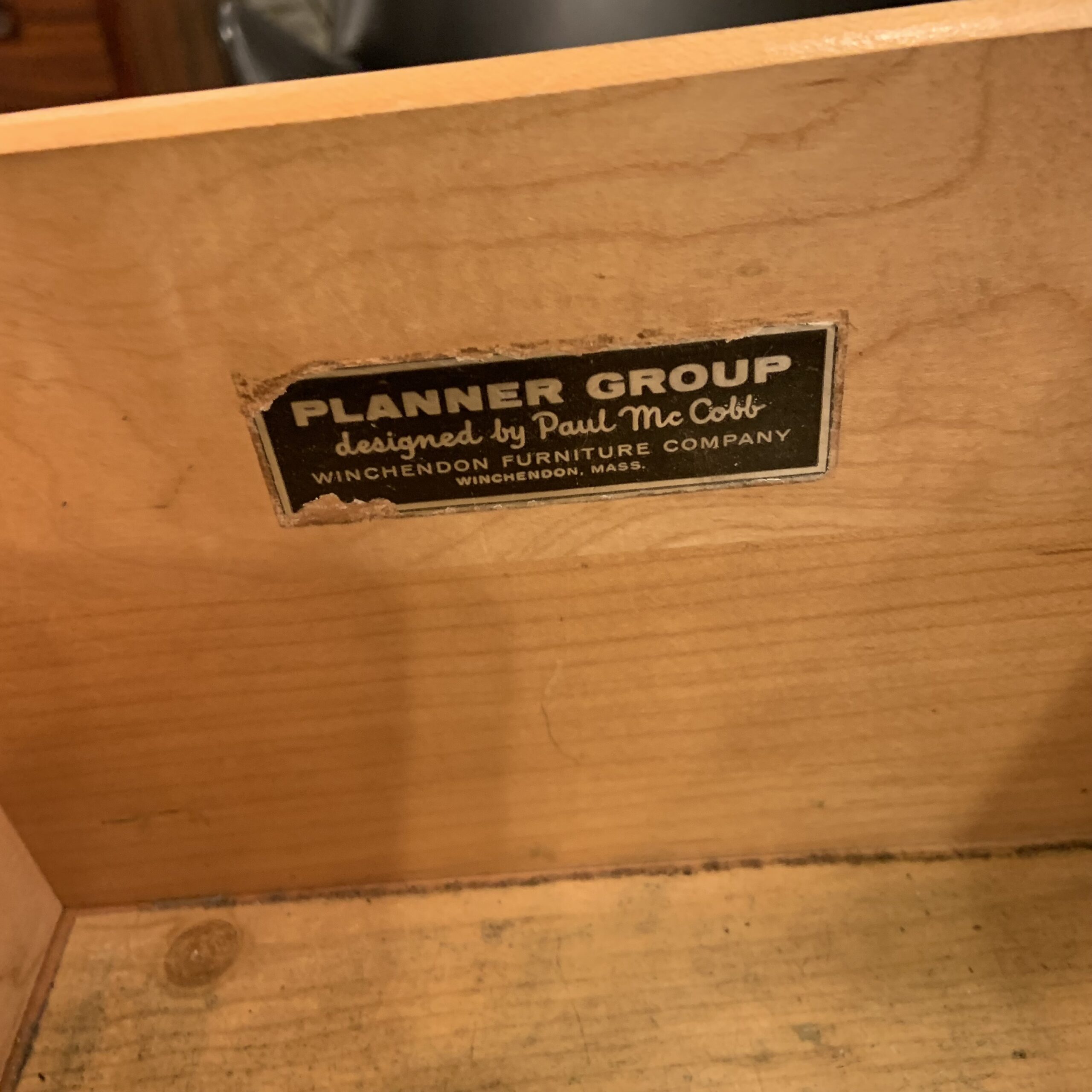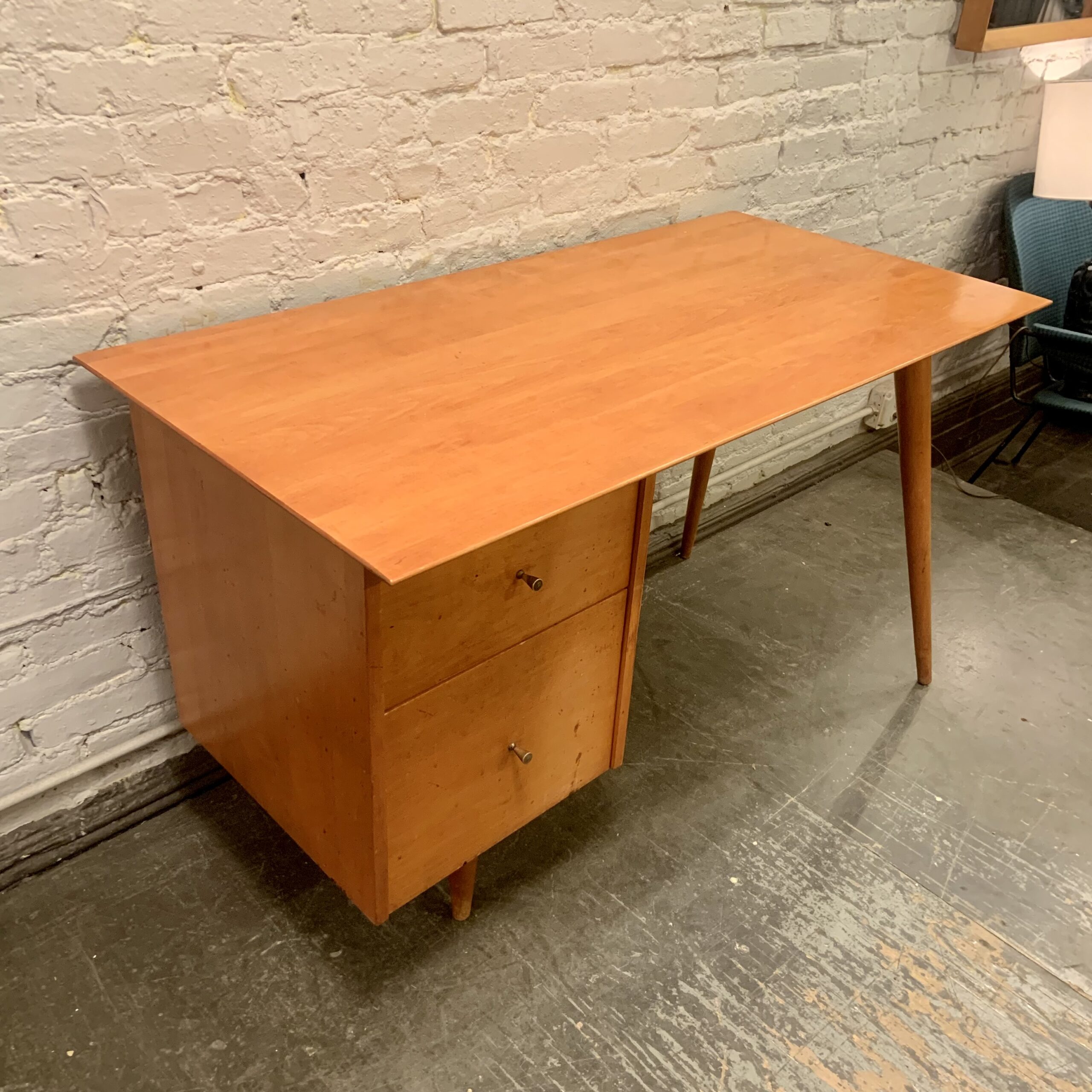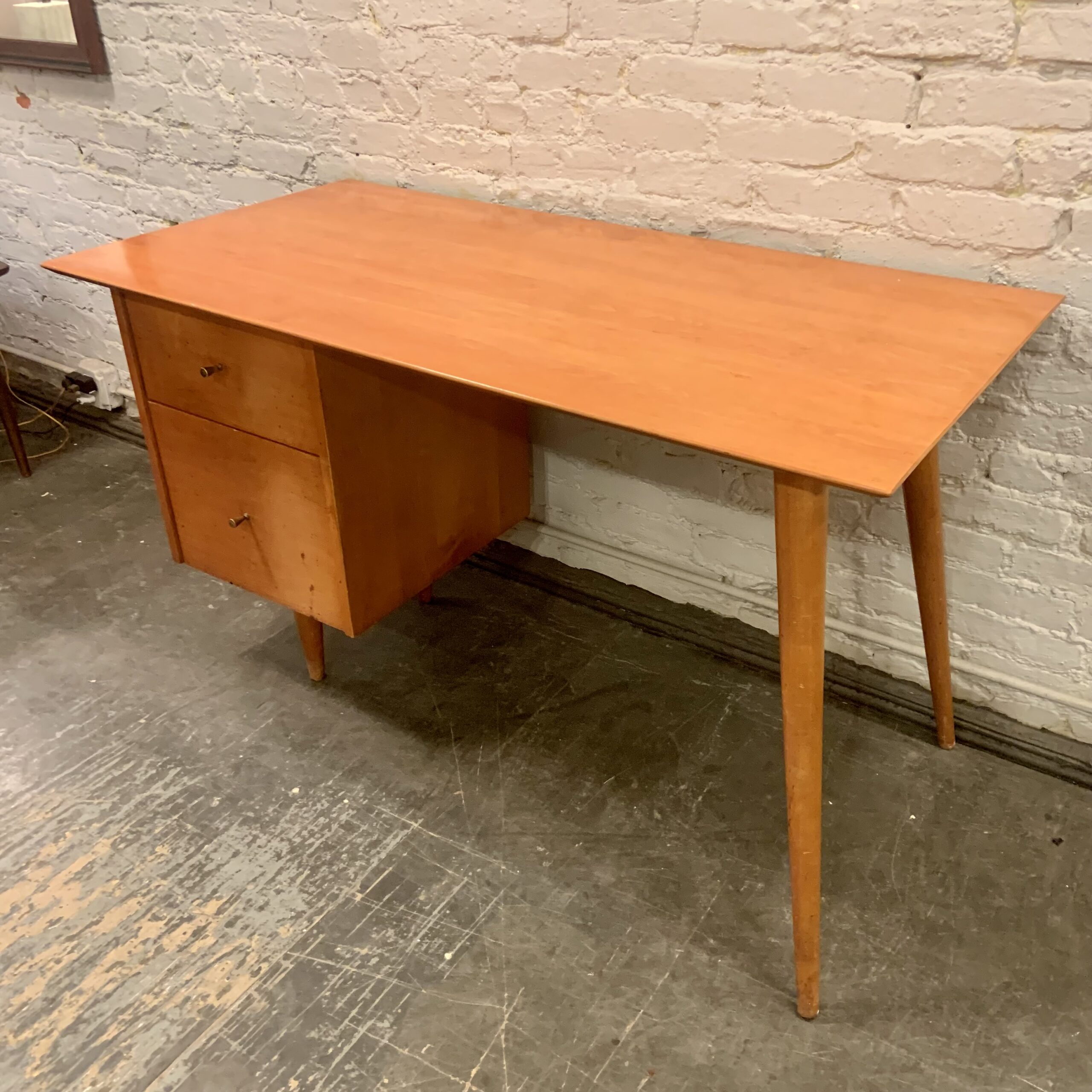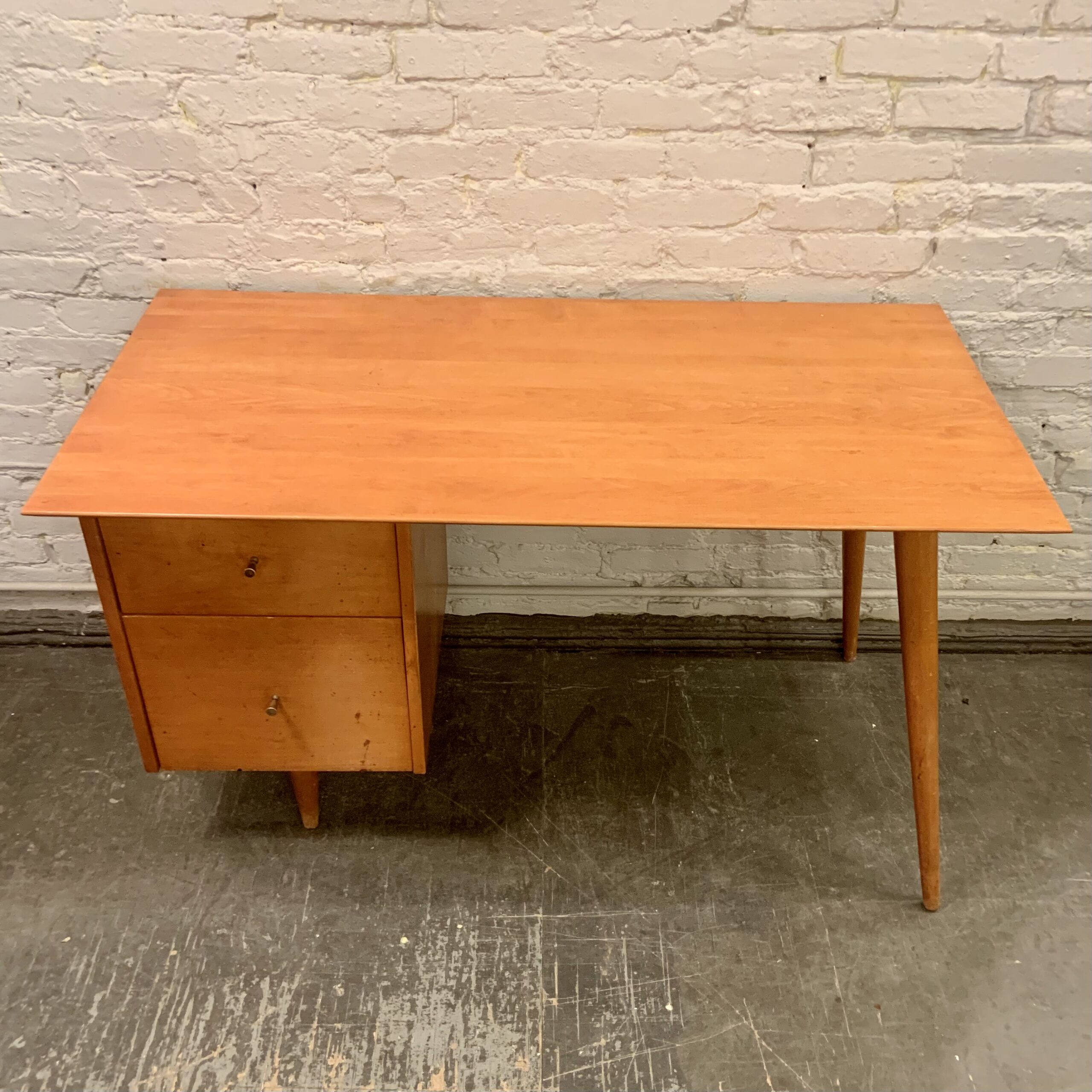 It’s easy to see why this Paul McCobb Planner Group Desk from the 1950s has become such a sought after classic. Its plain design, born from incorporating the tools used for the manufacture of reproduction colonial furniture, is a lesson in restrained modesty which yields a wonderful sense of loftiness while maintaining a no nonsense simplicity about it. Made by Winchedon Furniture and well marked with a Planner Group label in top drawer, it is in very good condition with some light wear to the drawer fronts. Measures 24 X 48 X 29 1/2″h.