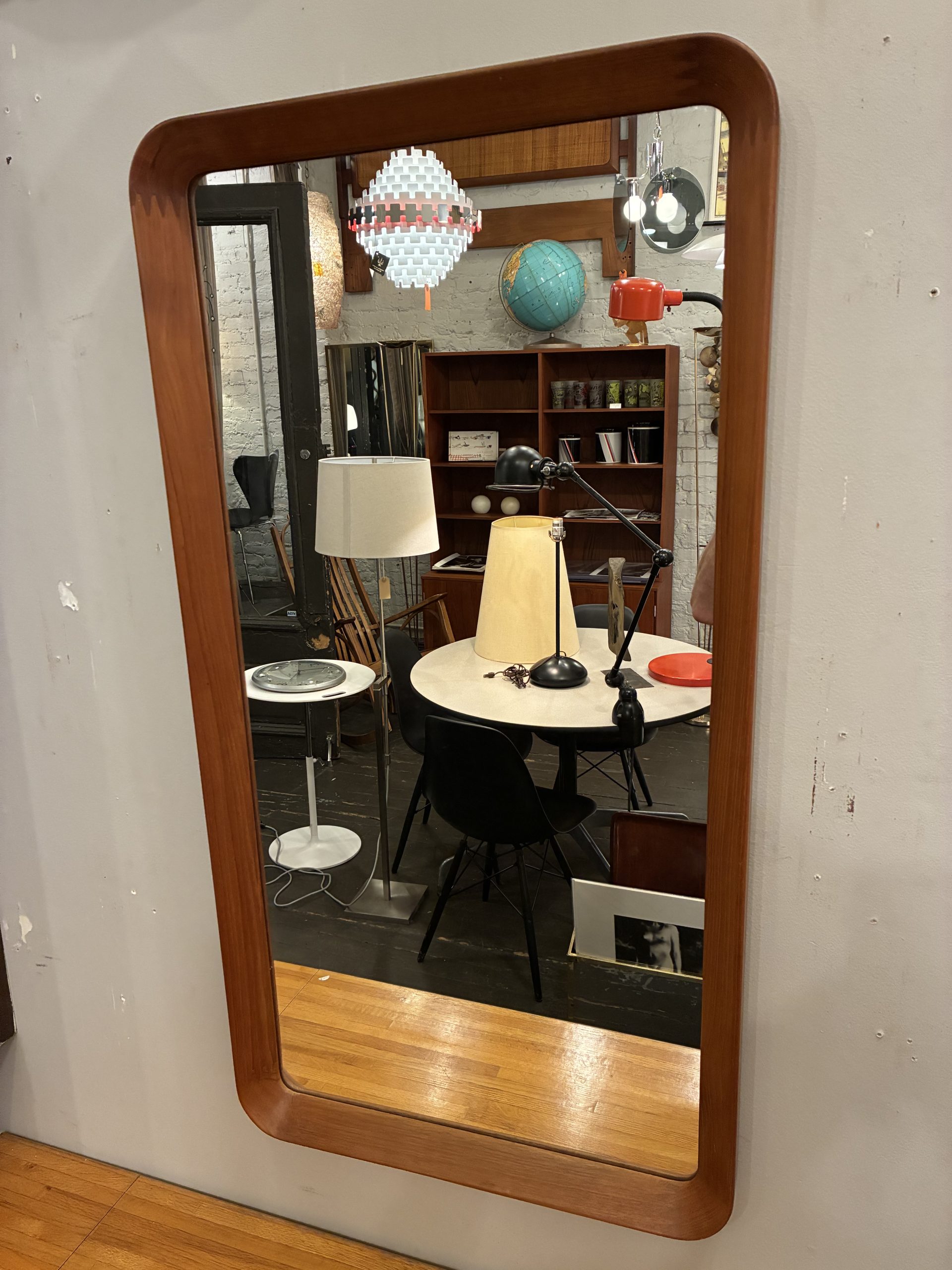 Pedersen & Hansen rare larger size teak wall mirror, Denmark. Impressive sculpted frame with finger joints at the corners and an inverted teak frame. Made in Denmark with high quality materials and cabinetry techniques. $850