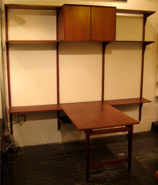This Poul Cadovius 3 Bay Cado System Wall Unit, made in Denmark in the 1960s, is constructed of american walnut and features a table, large two door cabinet, seven 12 inch shelves, one 18 inch shelf (not pictured), and one 15 inch shelf (not pictured). It is in very good condition and spans 95″. SOLD.