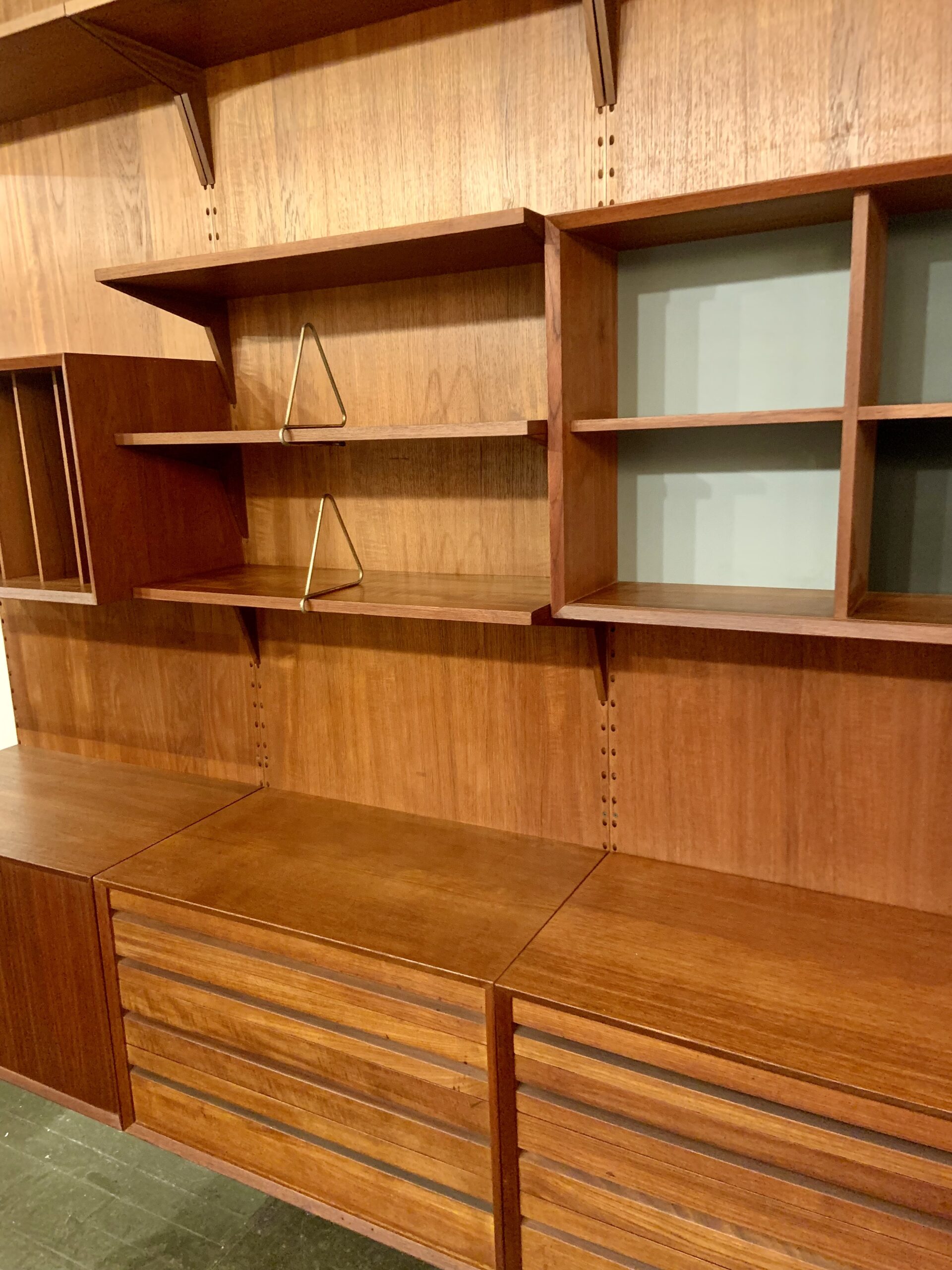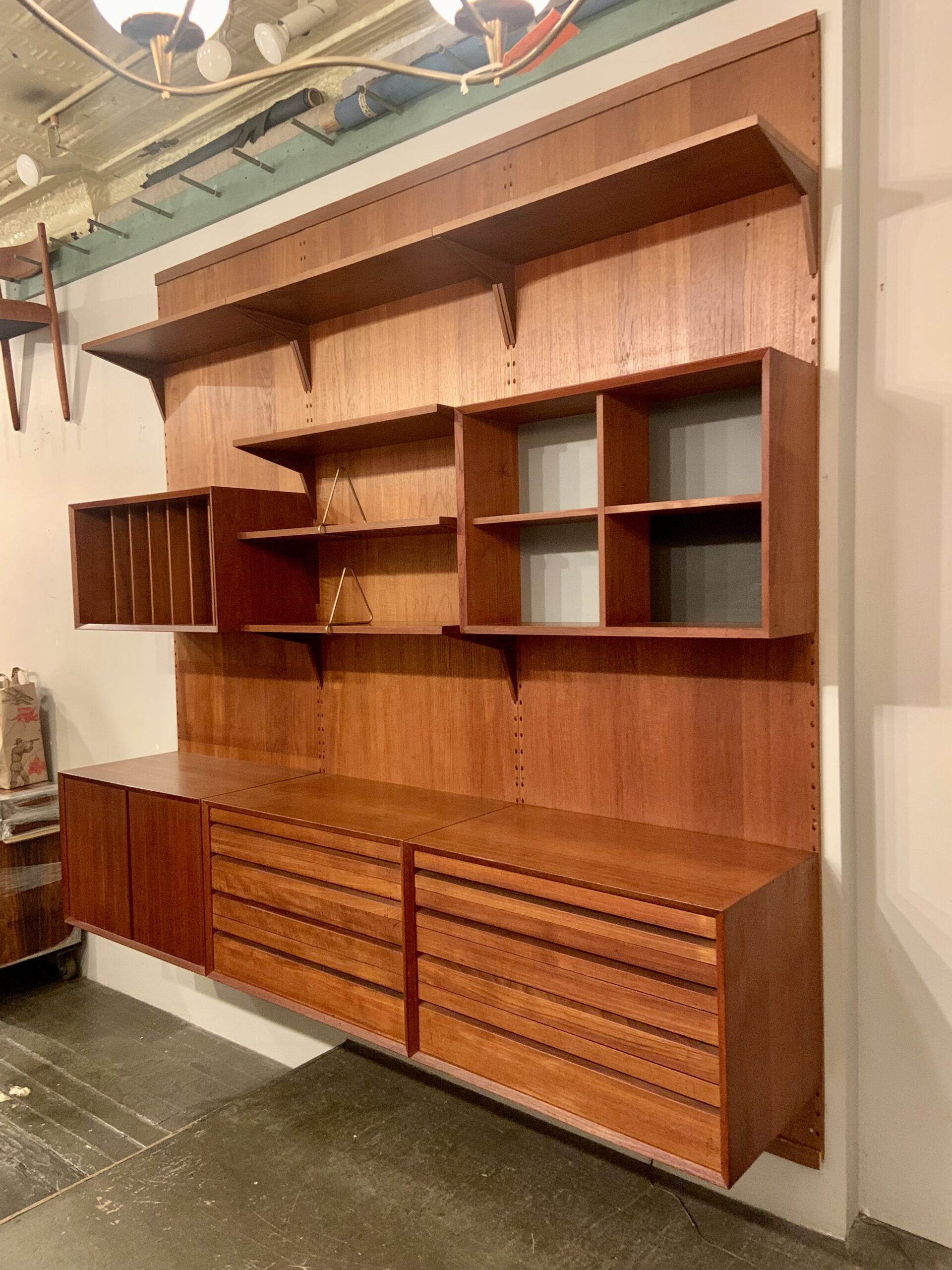 Poul Cadovius Three Bay Paneled Cado Wall System in Teak made in the mid 1960s in Denmark. This unit is chock full with two 18″ deep four drawer cabinets, an 18″ deep two door cabinet with two sliding shelves and two record cubbies, an open divided curio cabinet, a record cabinet and six 12″ deep shelves. All components are modular and can be placed anywhere along the impressive three teak wall panels. A wonderful way to create a vintage built-in look with the flexibility of easy future mobility. Extra panels available. It is in very good condition with some wear, scratches and veneer loss. Measures 94 1/2″w X 18 3/4″d x 96″h.
