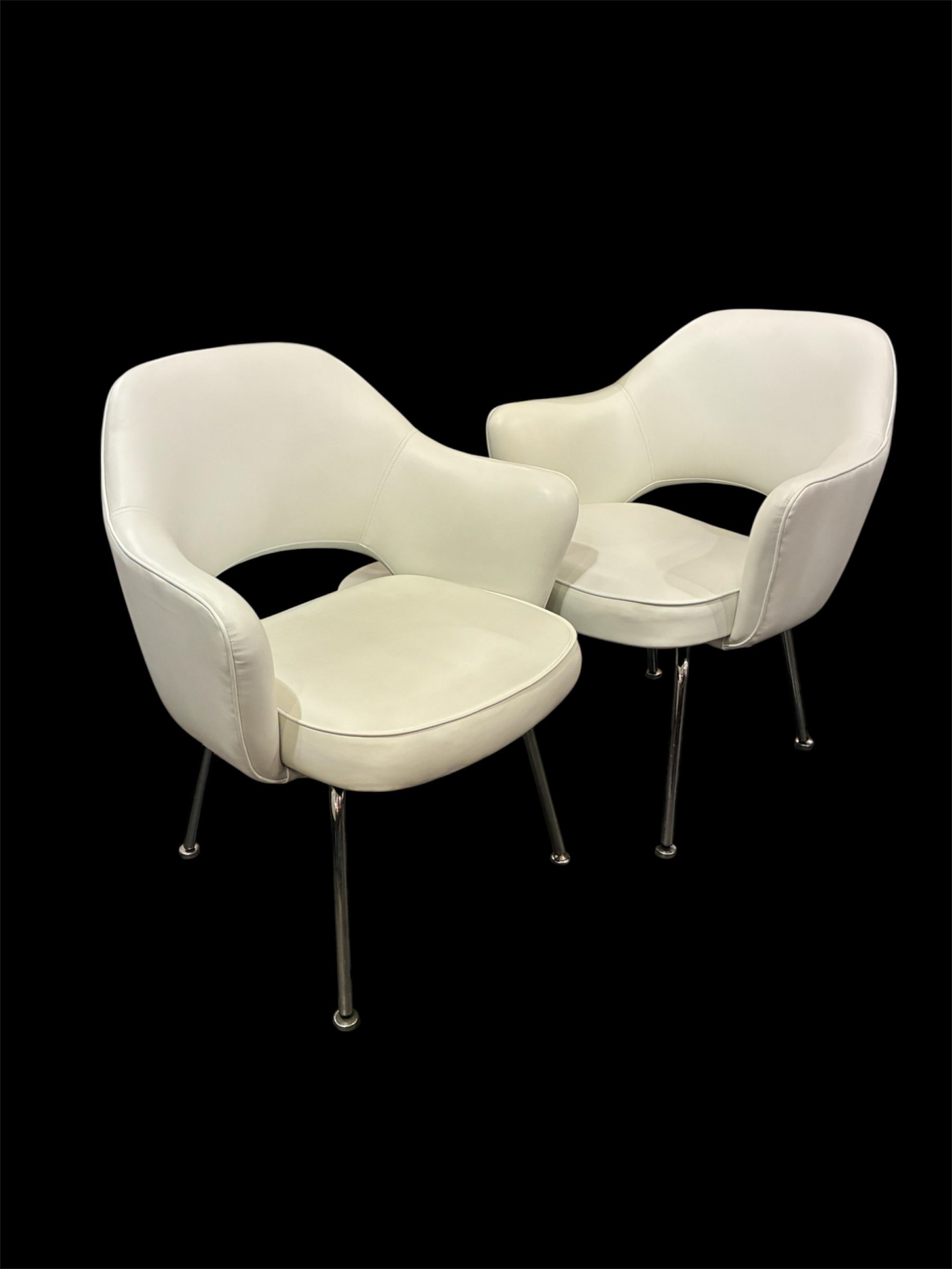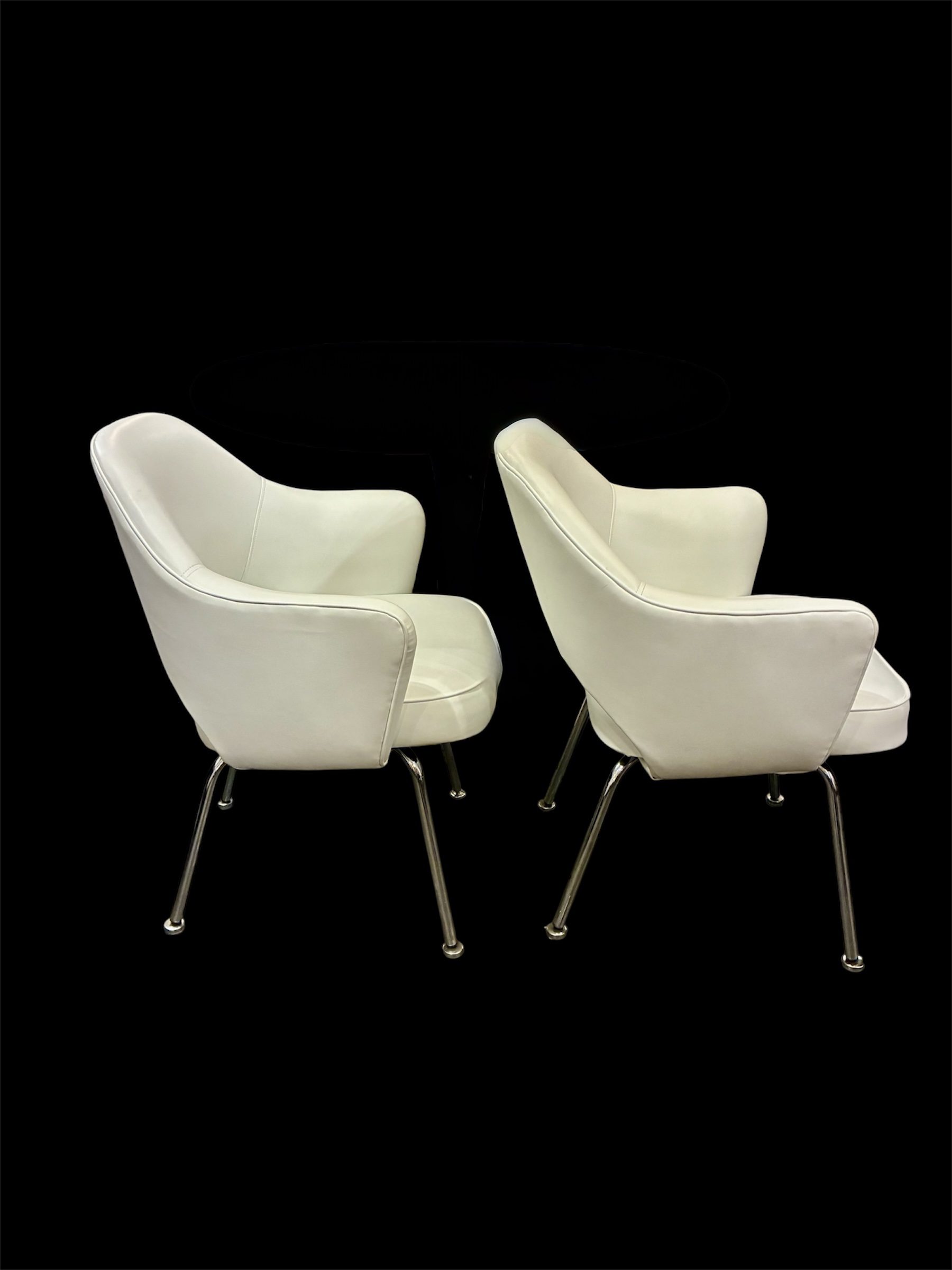 Saarinen Executive Arm Chairs, Knoll. In excellent condition they have been nicely reupholstered in a high quality matte white vinyl sometime in the recent past. Measure 26w X 24 3/4d X 31 1/2″h. $995/pair