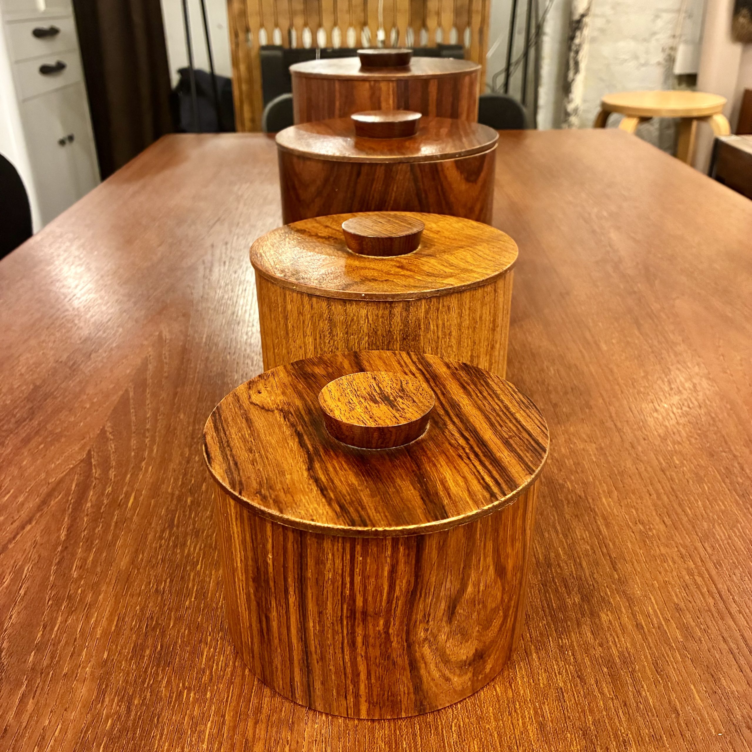 Set of Four Bent Teak Plywood Canisters from Japan in descending order, with lids. A very nice example of these cans, complete with plastic liners and unusually vibrant teakwood veneer. $150 set