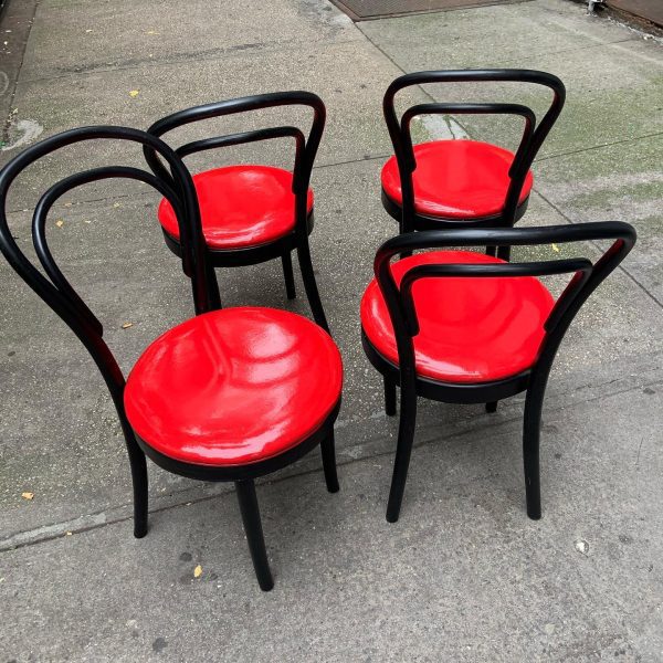 Set of Four Bentwood Cafe Chairs in the style of Thonet with bright red vinyl upholstered seats. In excellent condition, they measure 16 1/2 X 21 1/2 X 33″h.