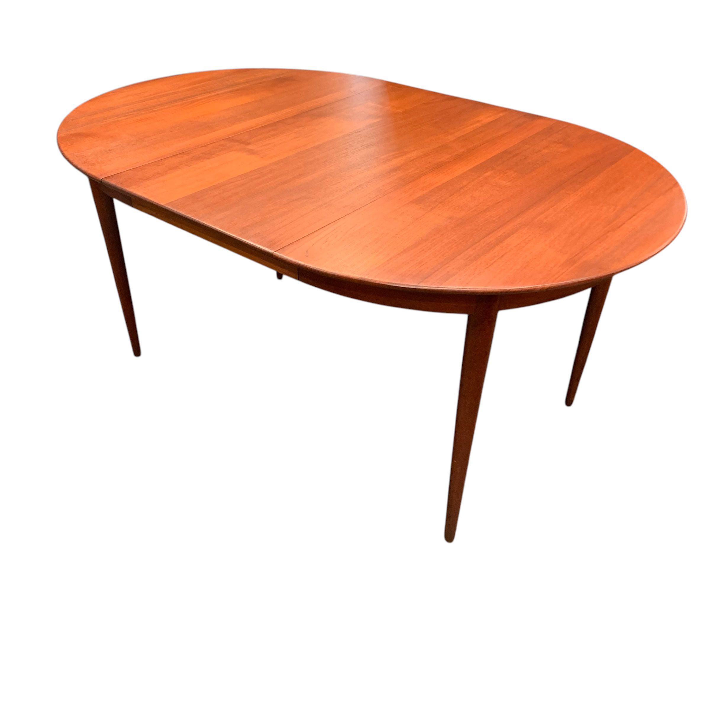 Solid Teak Extension Table imported in the mid 60s by Leo Spivak Furniture NYC, most likely imported from Denmark. Solid teak makes this table quite unusual as most midcentury modern furniture of this ilk was made with veneers. They were easier to work with, cheaper and were conducive to the straight lines of modern design. This table has a deeply beveled, rounded edge which displays the end grain of the solid teak beautifully. It’s 42″ round with 2 X 19 3/4″ leaves, making it 82″ long fully extended. In excellent condition, it has been recently re-oiled.