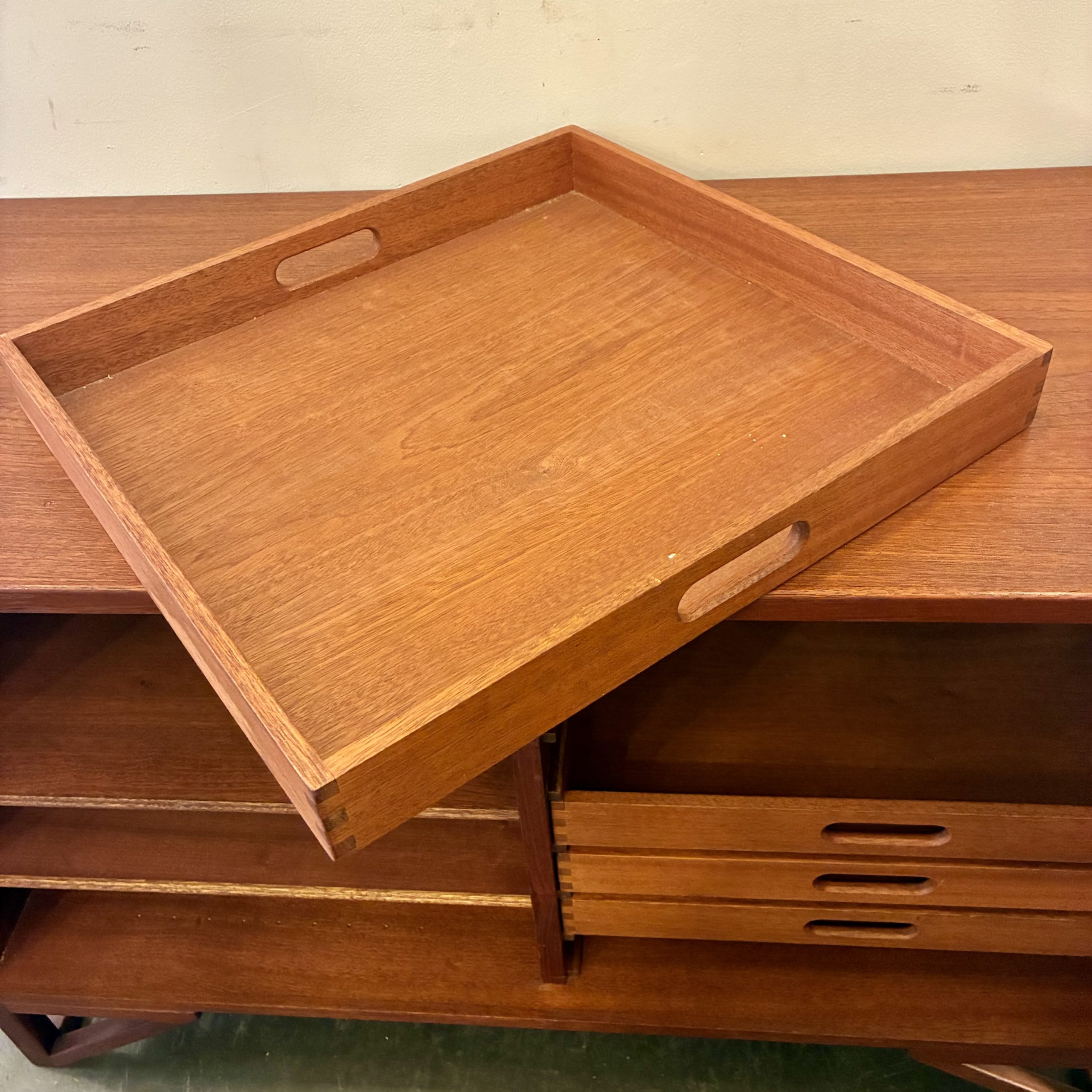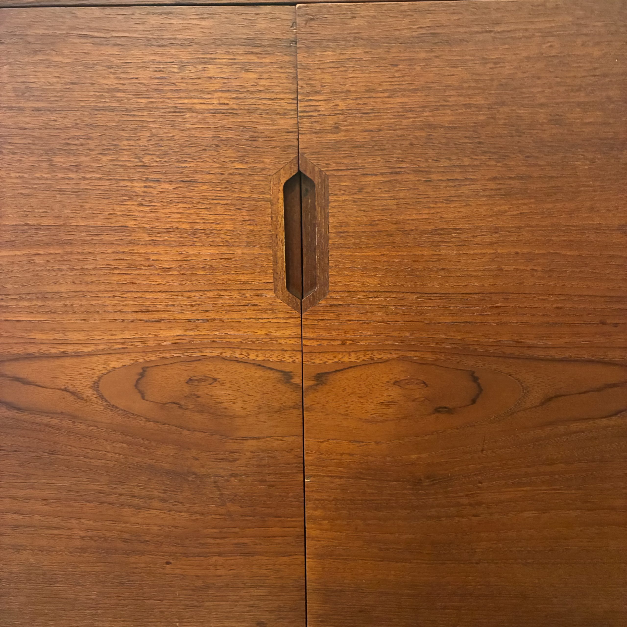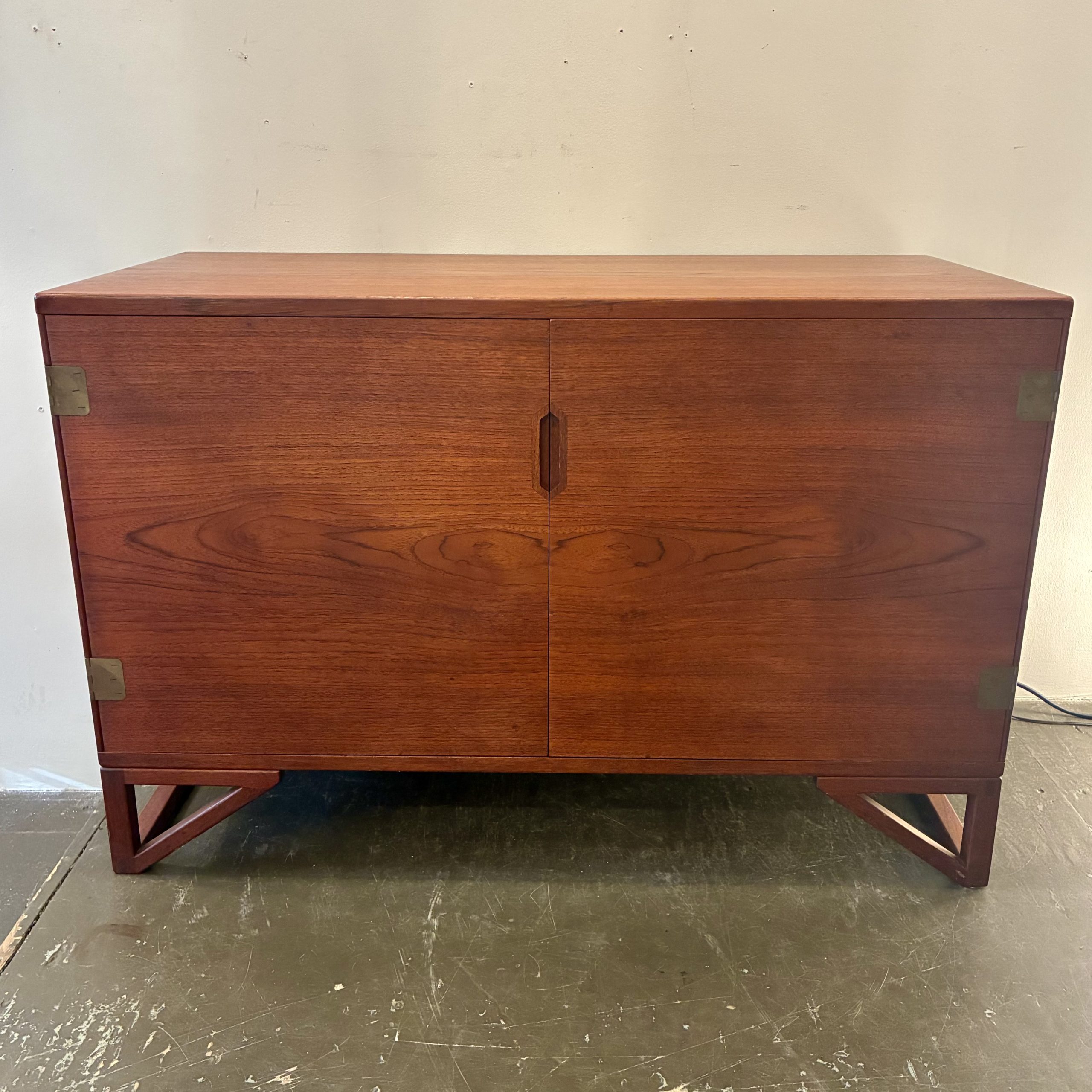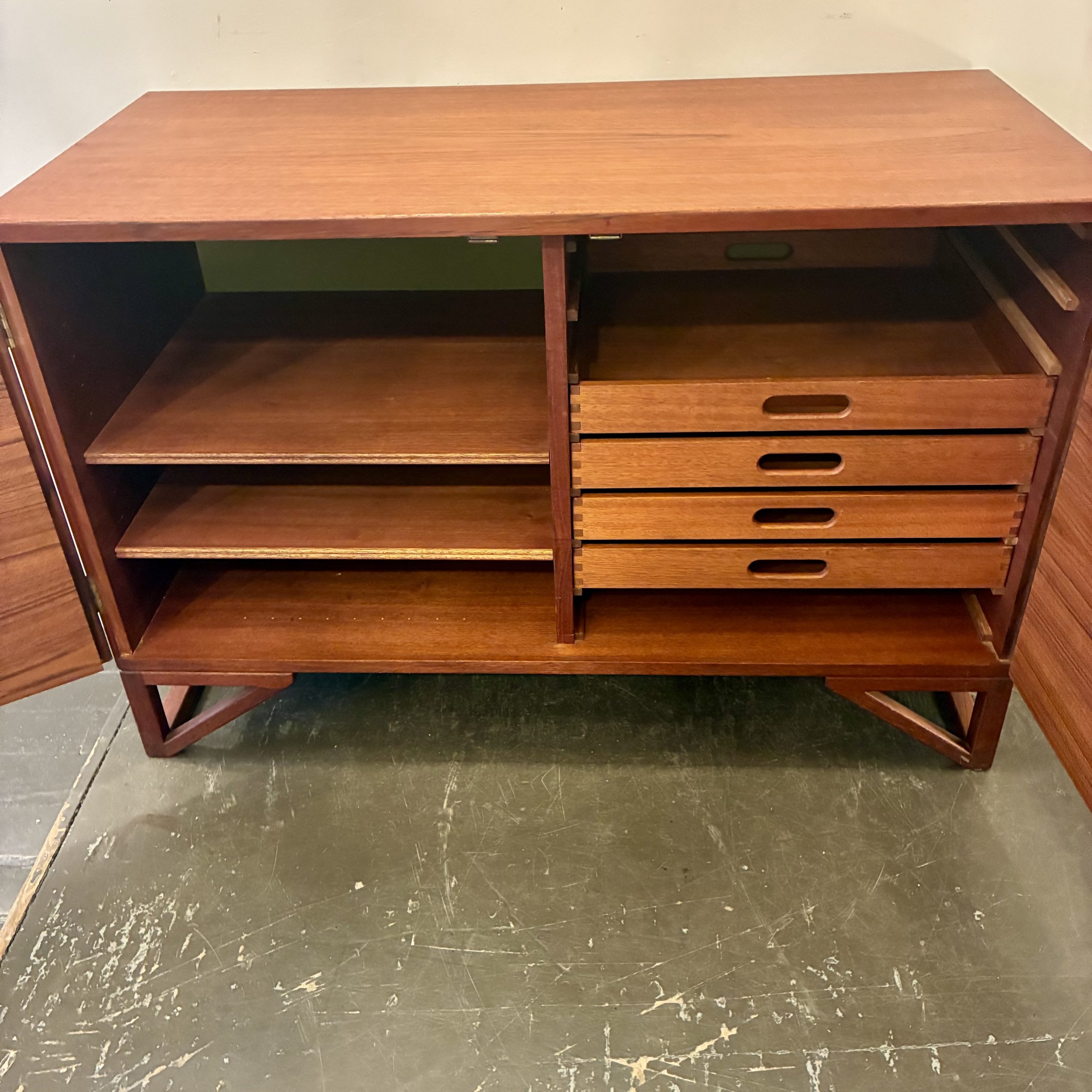Svend Langkilde petite cabinet for Illums Bolighus. Produced by Langkilde Mobler, Denmark 1960’s. The teak wood grain is bookmatched on all sides. The interior of this two-door cabinet includes 4 pull out drawers on one side, with adjustable shelving on the other. Original brass hardware. The cabinet is in very good original condition, it has been lightly cleaned and oiled. Showing light wear throughout from use. Dimensions: 39.25″ W x 26″ H x 18.5″ D $1,995.