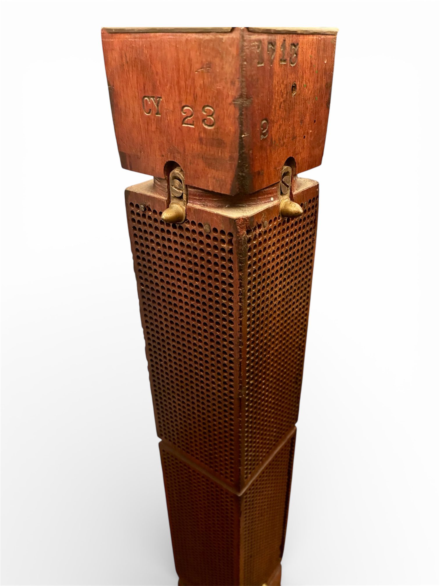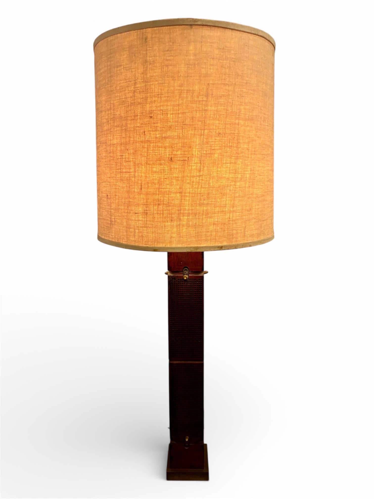 Tall Perforated Japanese Loom Table Lamp. This lamp was beautifully fashioned and fabricated from a part of an antique Japanese loom so fastidiously that it seems factory made. The details of the loom are very compelling and the solid nature of the lamp is impressive. Looks to have its original shade. Measures 16 X 41. $395.