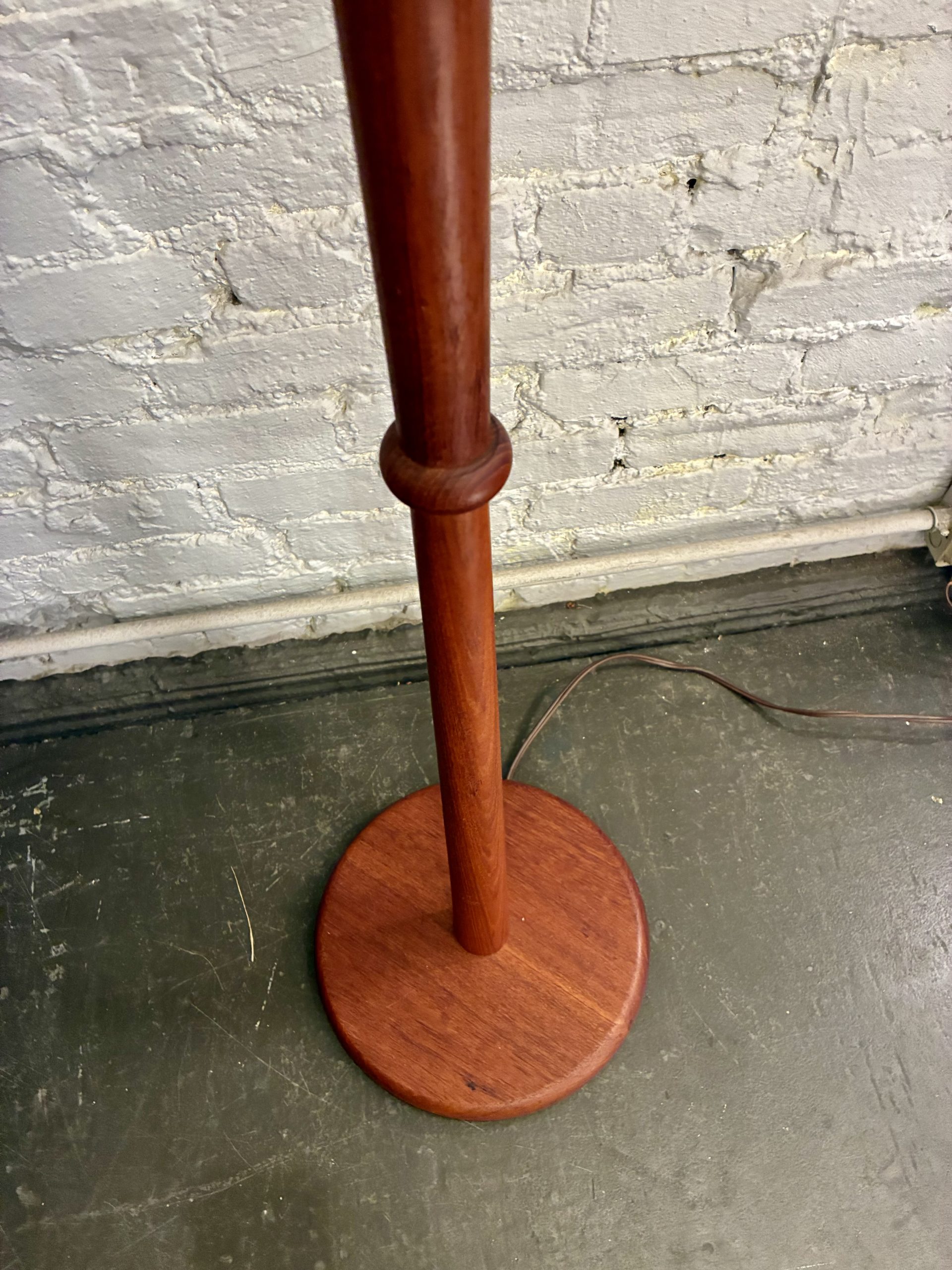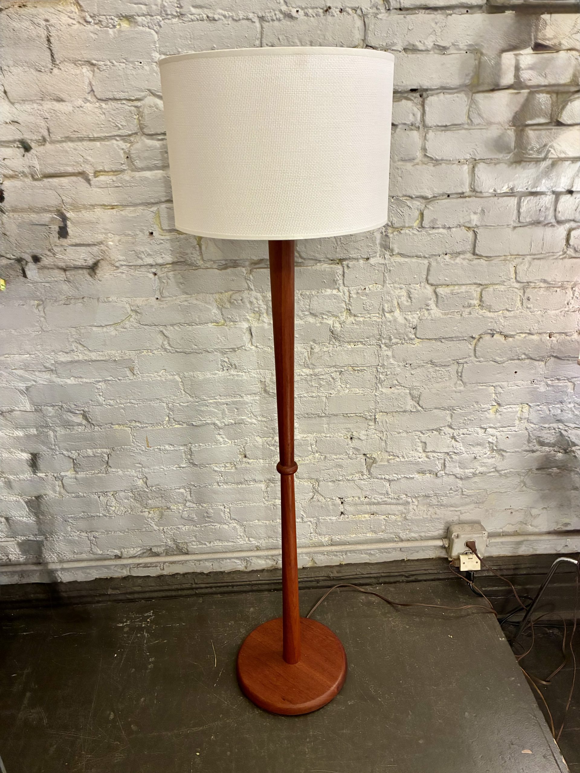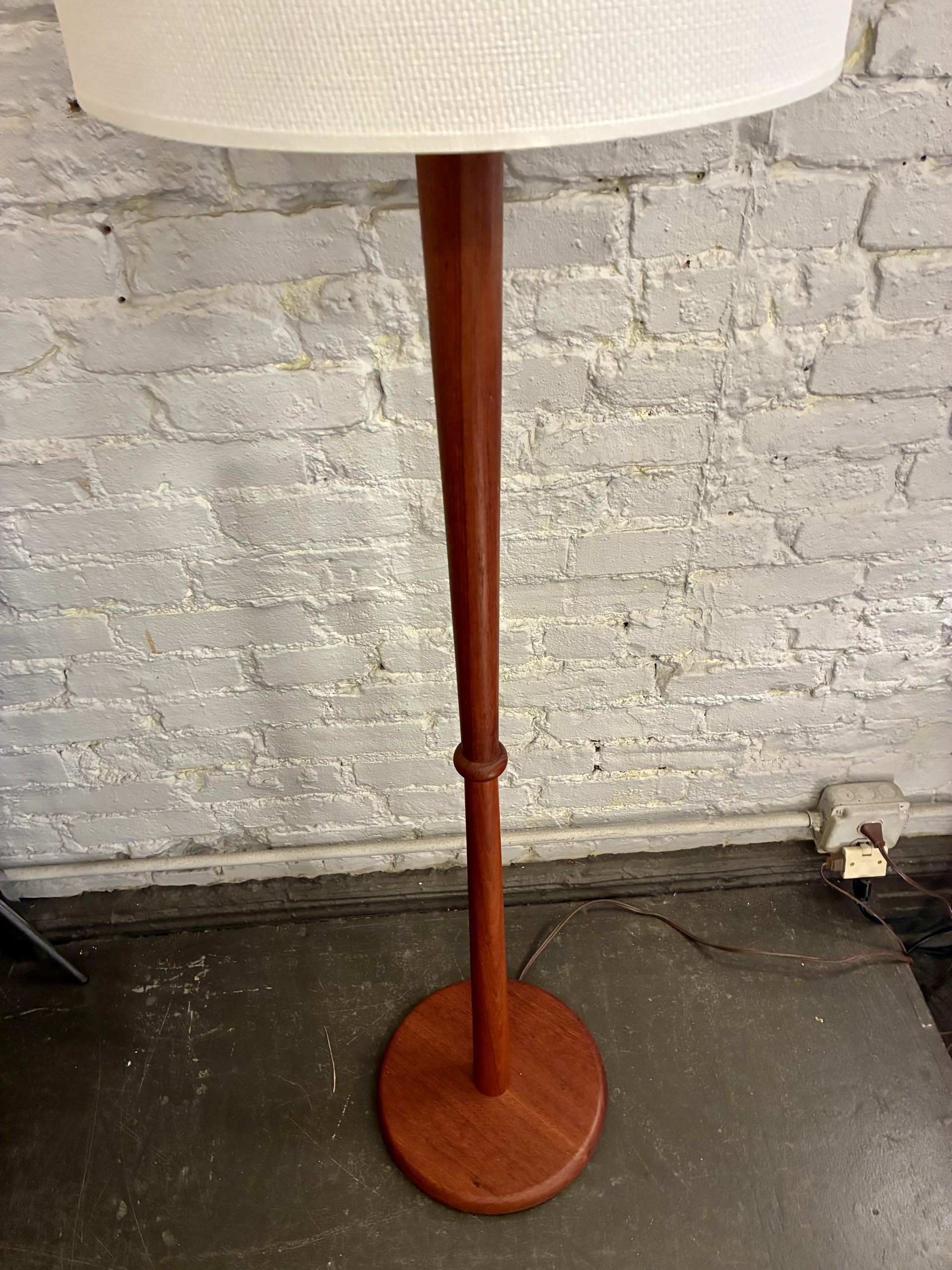 Tapered Turned Teak Floor Lamp with a center ring finial midway down the stem. Measures 15 X 54. $695