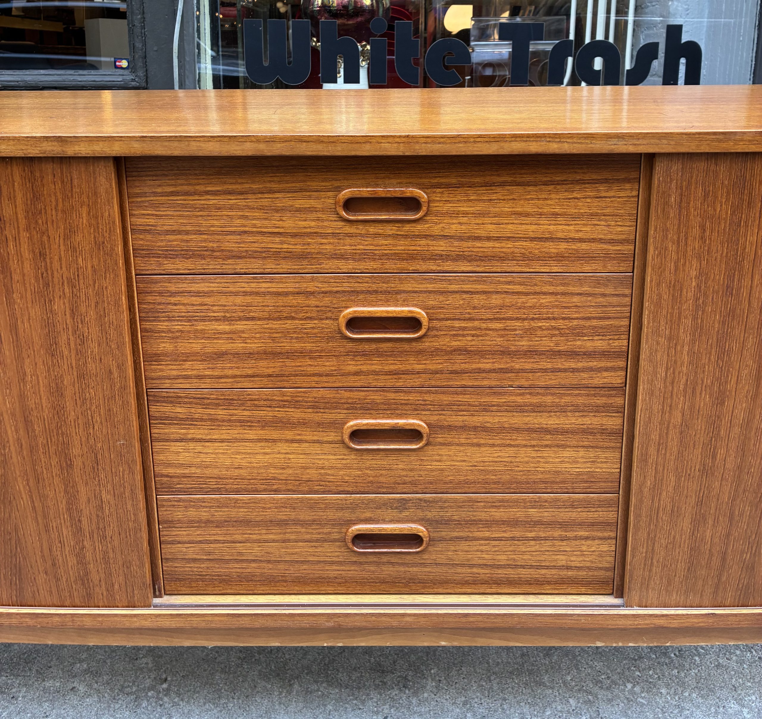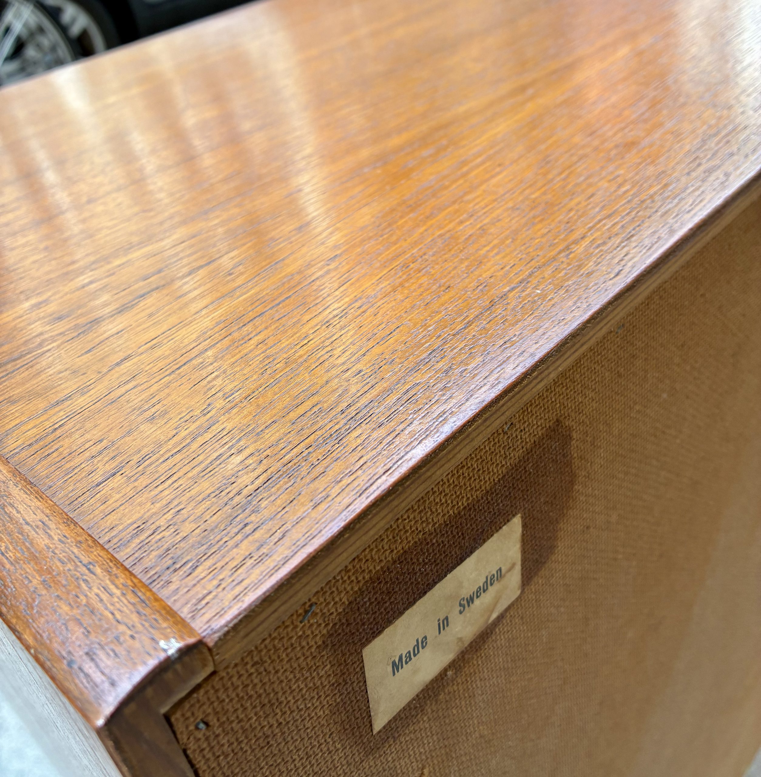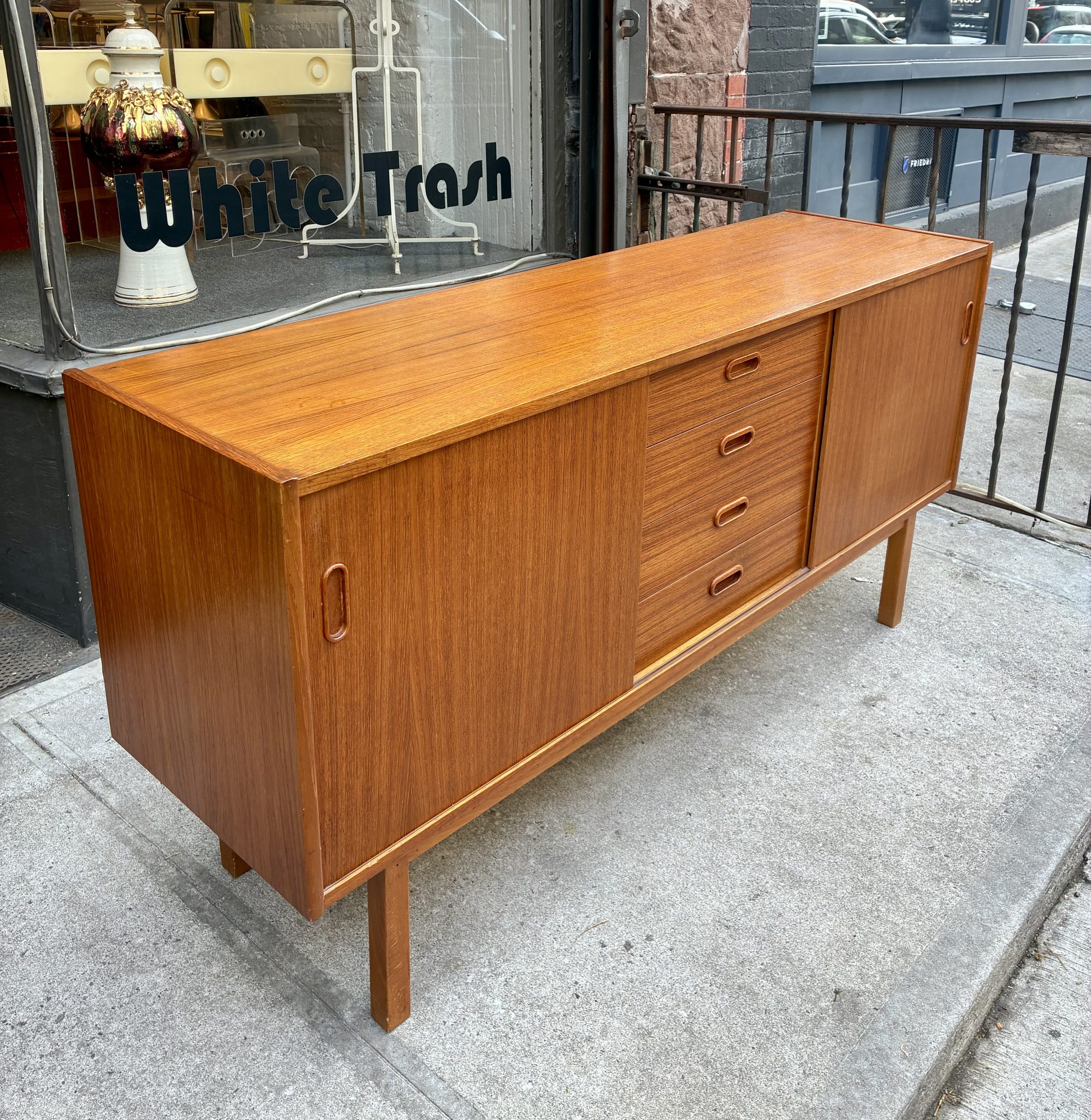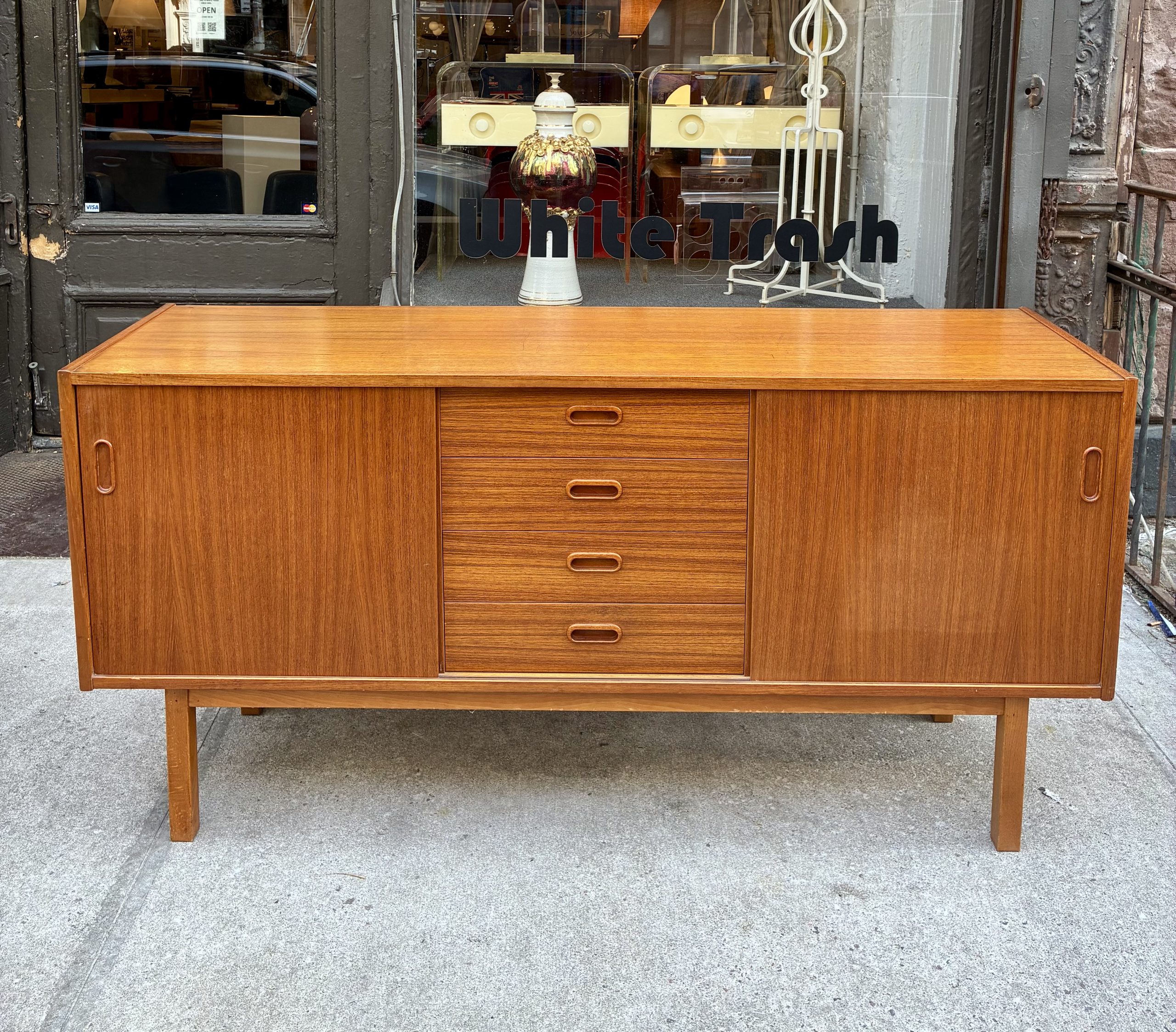 Teak Credenza from Sweden made in the early 1970s. The two side compartments have an adjustable shelf and the exposed center section has four drawers. In excellent condition, it has a nice compact scale, measuring 16 1/2 X 59 X 29″h. $1,750