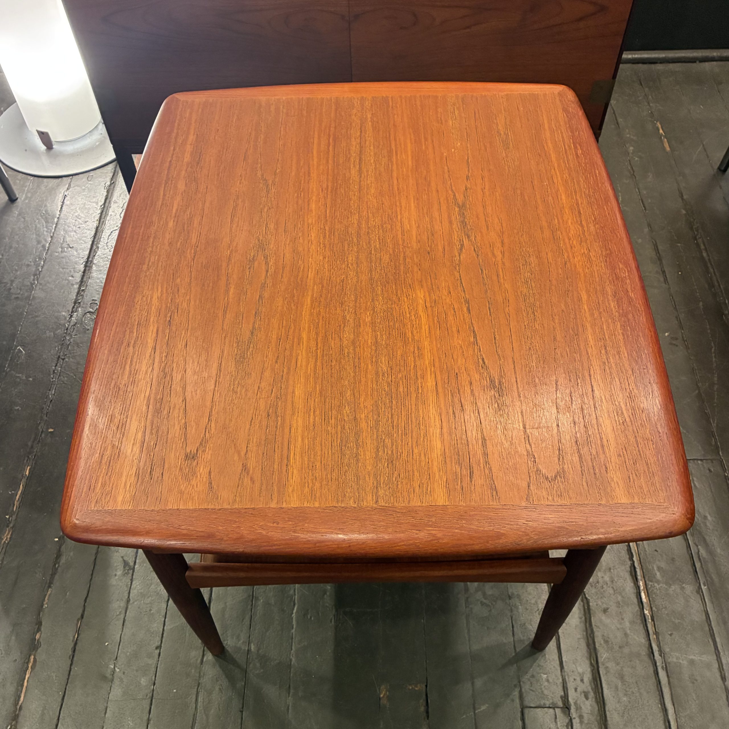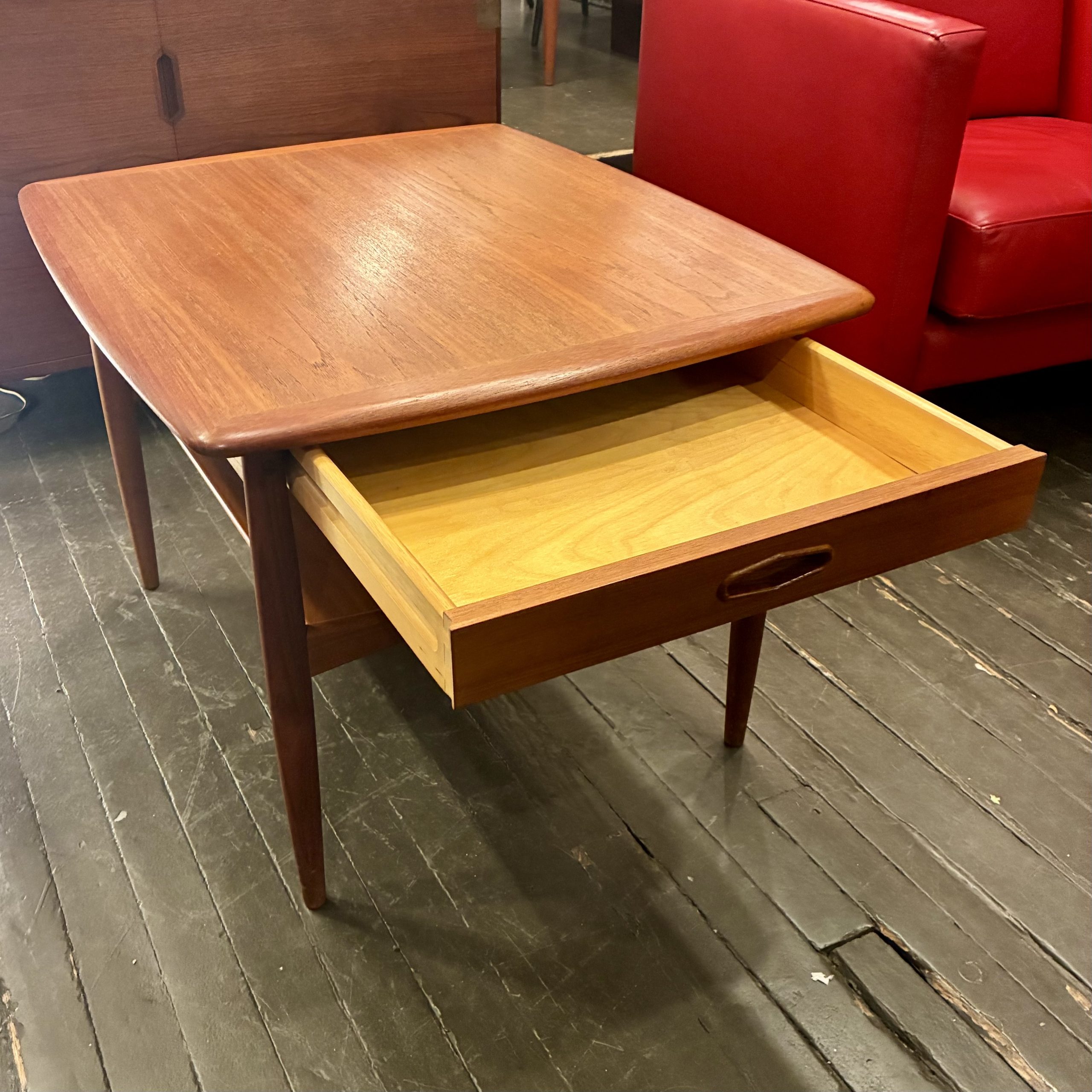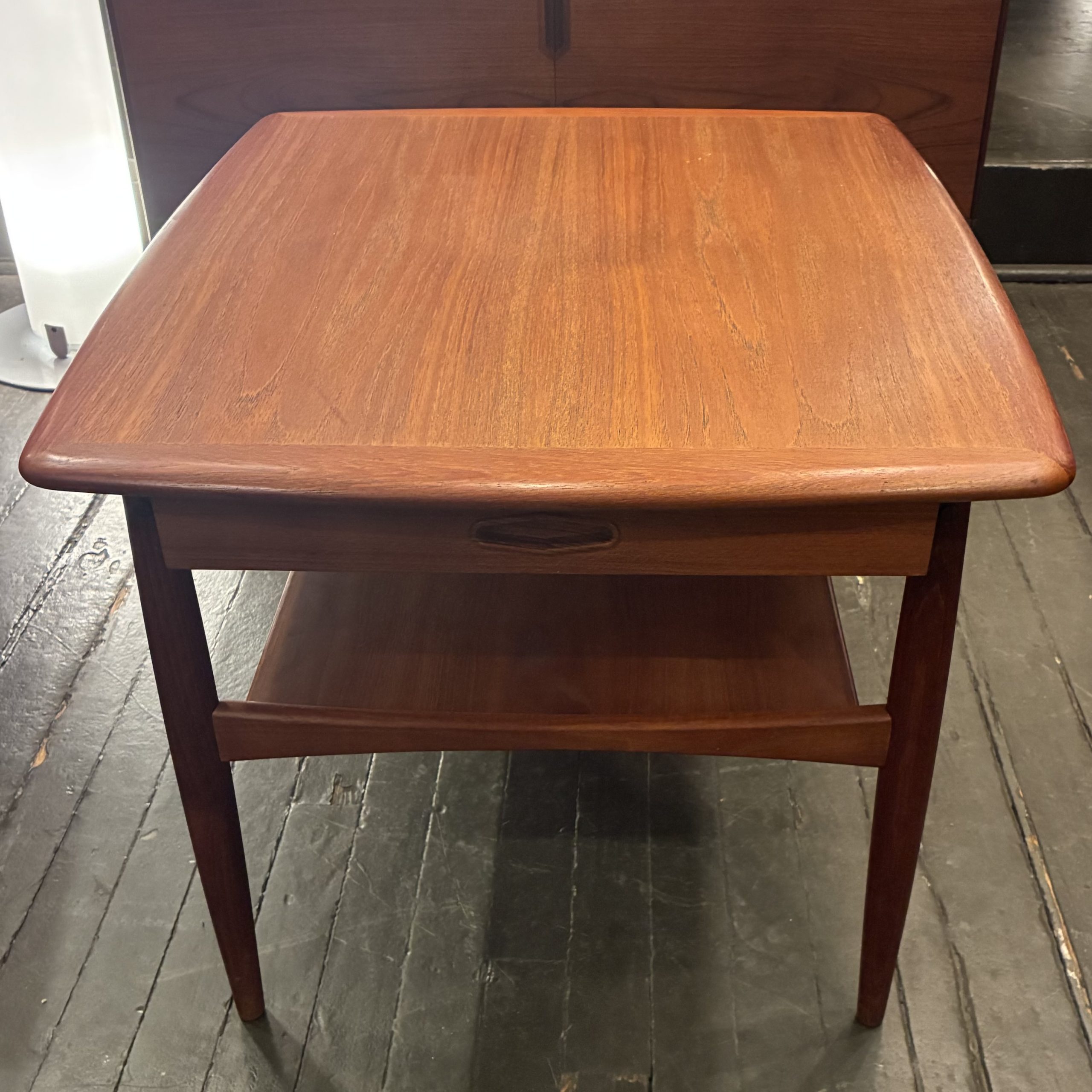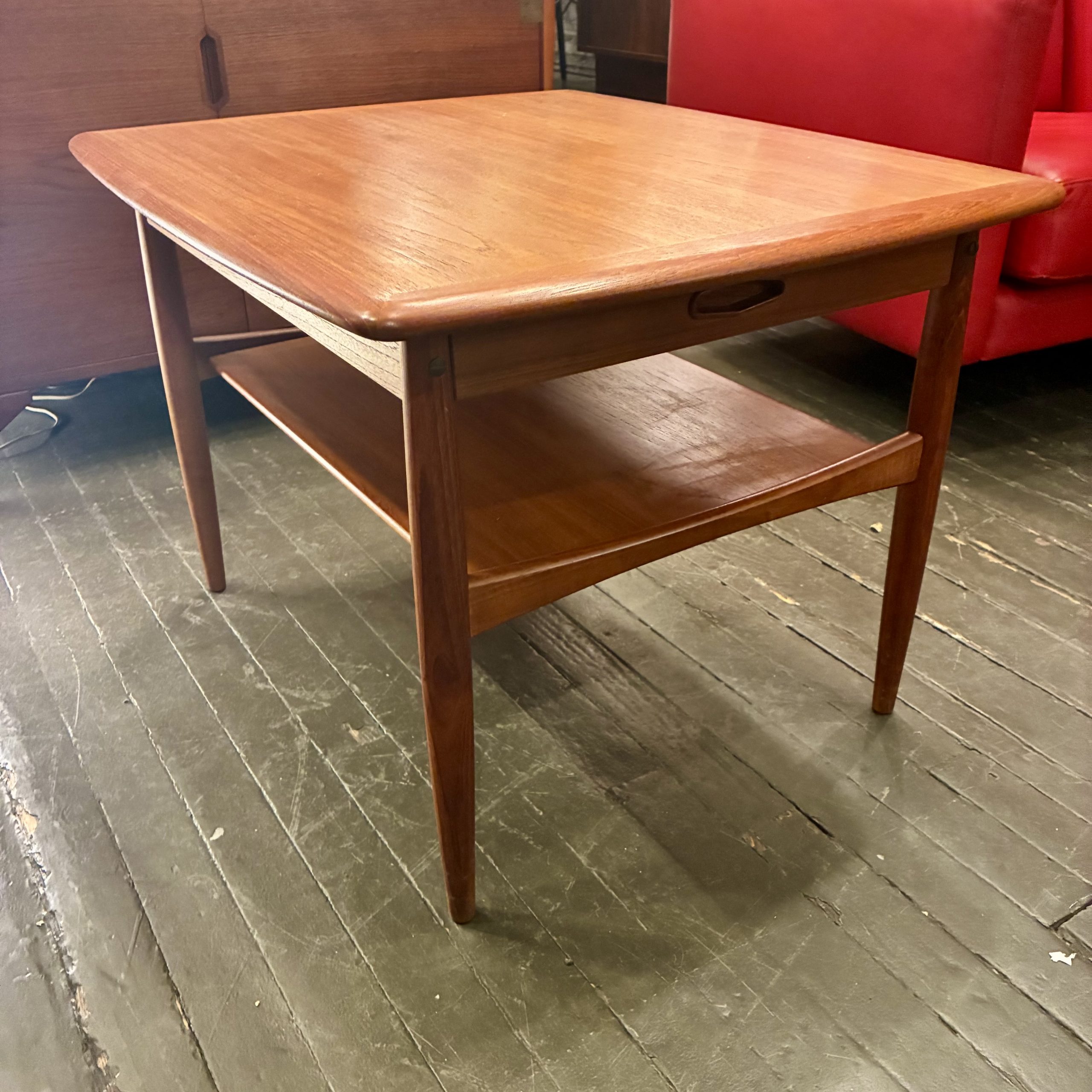 Teak Side Table with long Drawer from Denmark with solid tapered teak legs and shelf. Unmarked. In excellent condition, it measures 24 1/4 X 28 1/4 X 19 3/4″h. $550