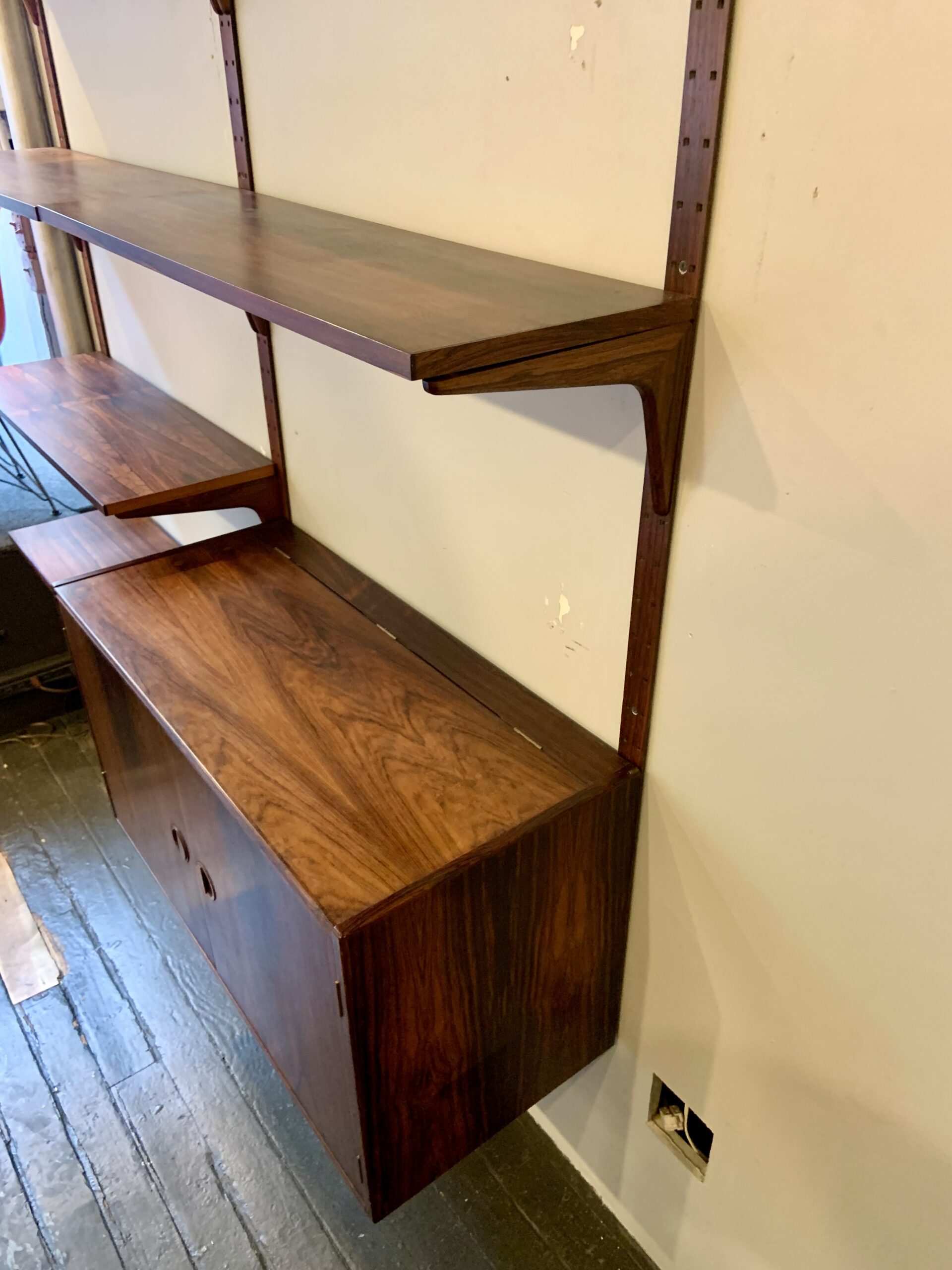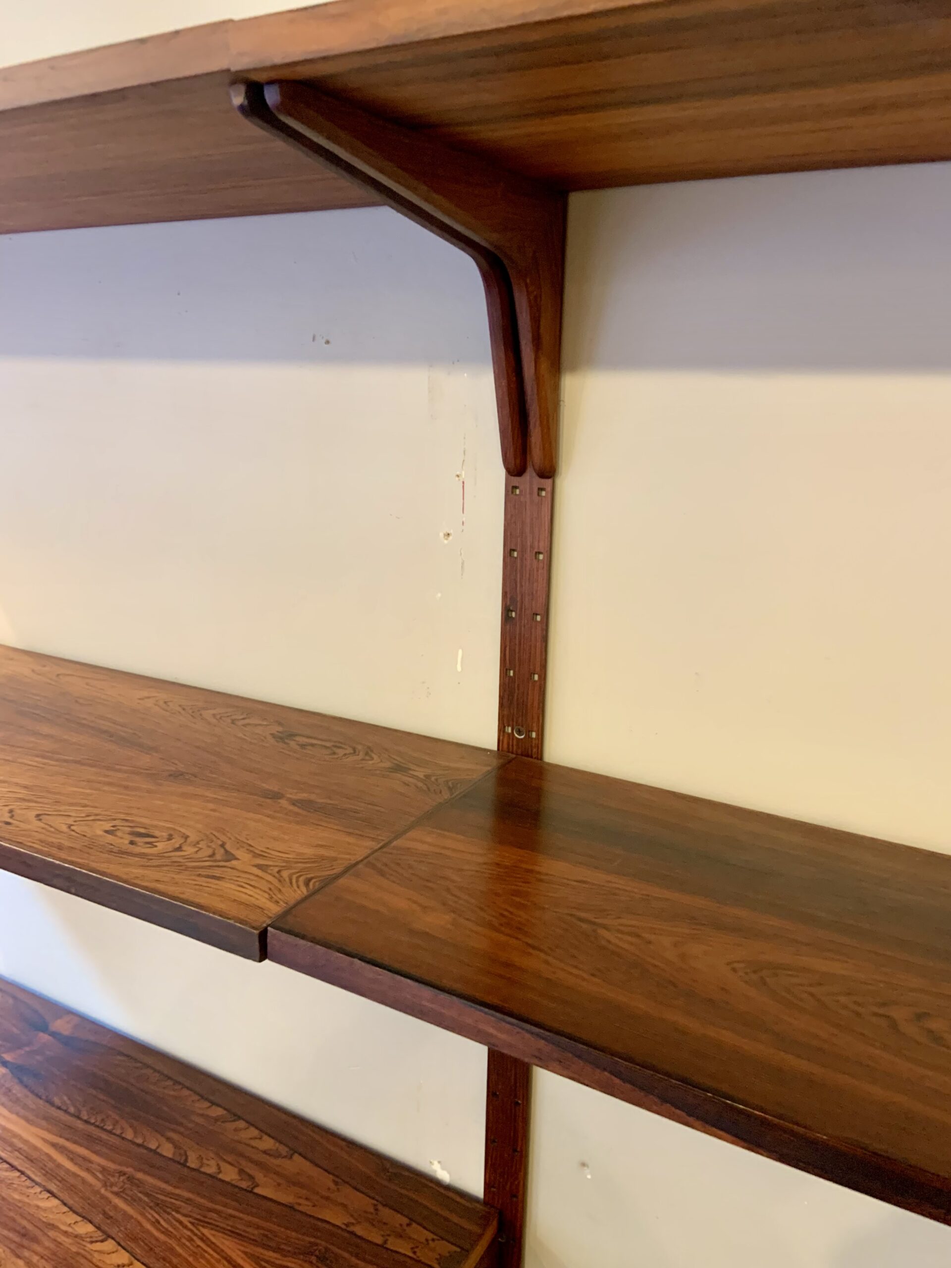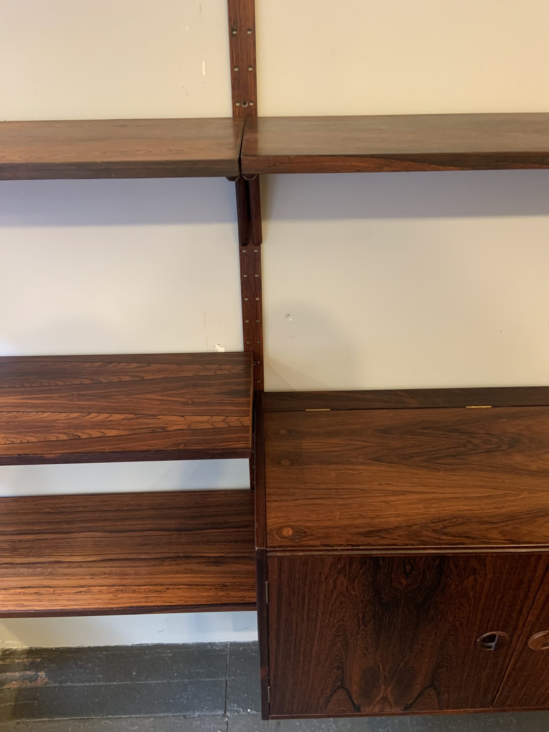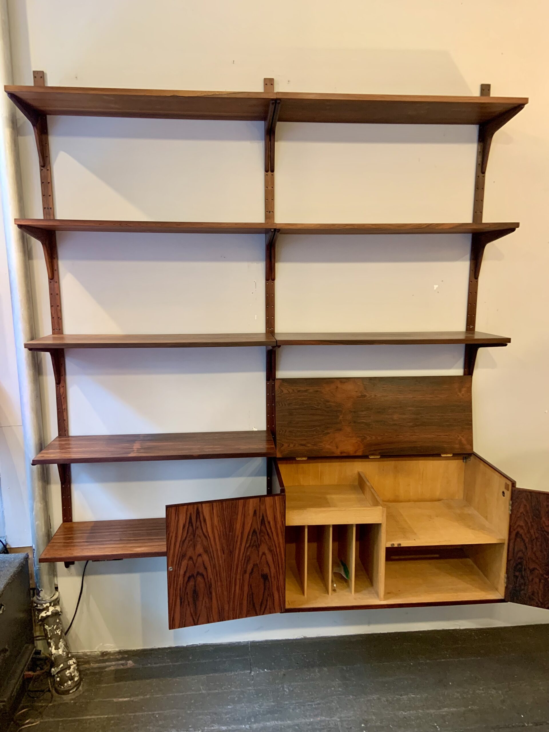 Two Bay Brazilian Rosewood Wall Unit by Rud Thygesen and Johnny Sorensen for Hansen & Guldborg, HG Furniture, Denmark, CA 1960s. Modular bays consist of one three door electronics cabinet, and eight 12″ shelves. The unit is in excellent original condition. Measures 70 3/4″w X 16″d X 78″h.
