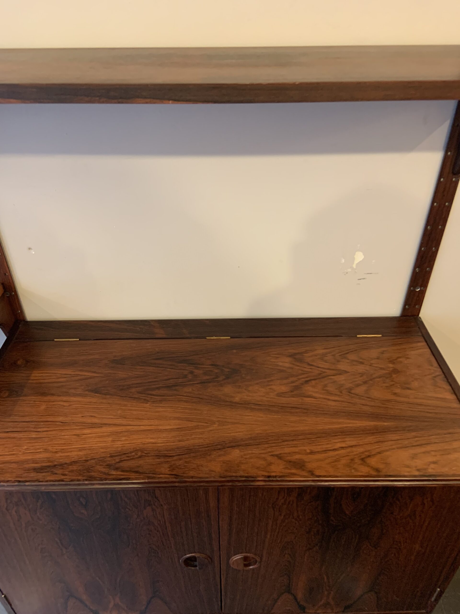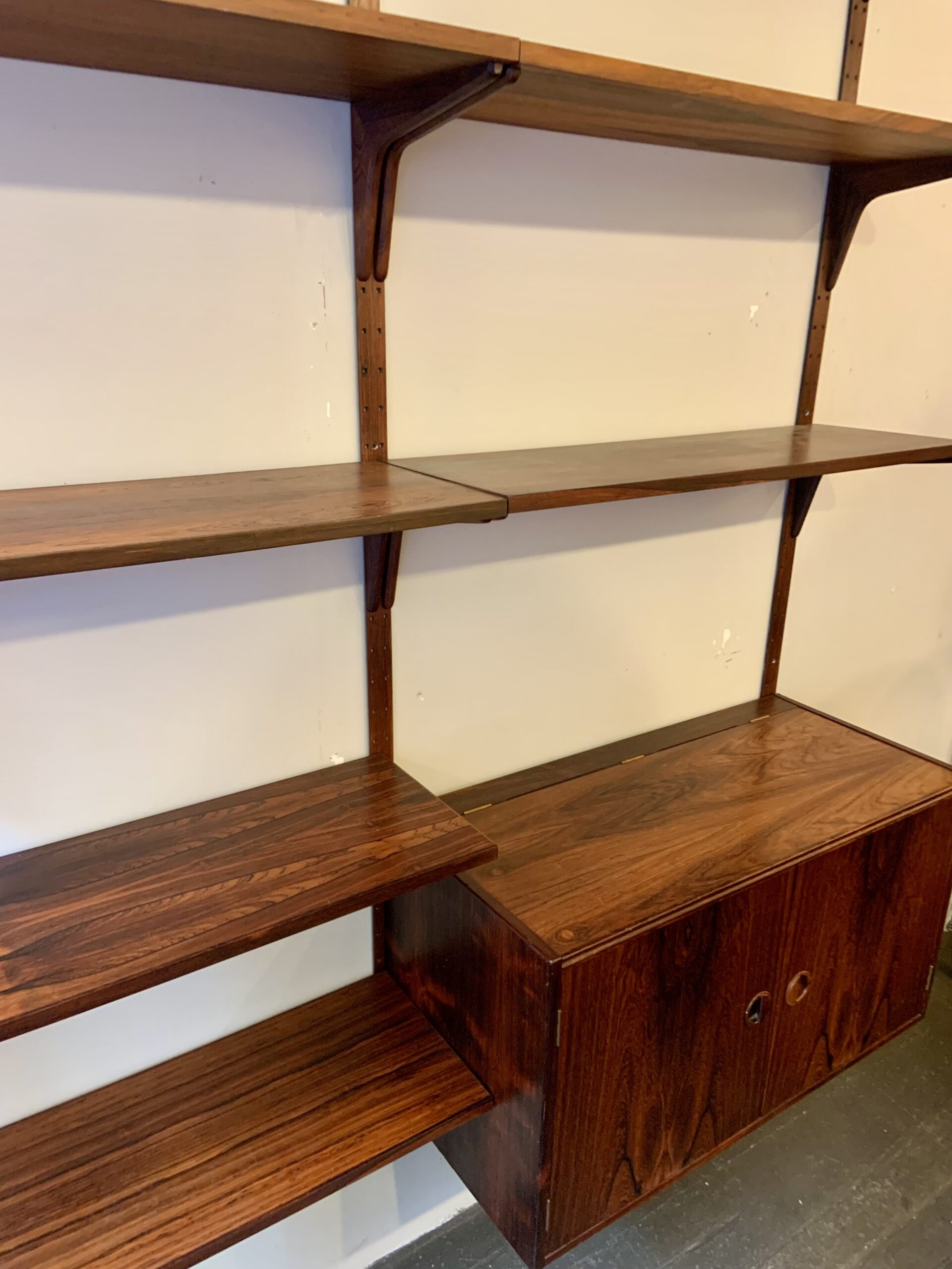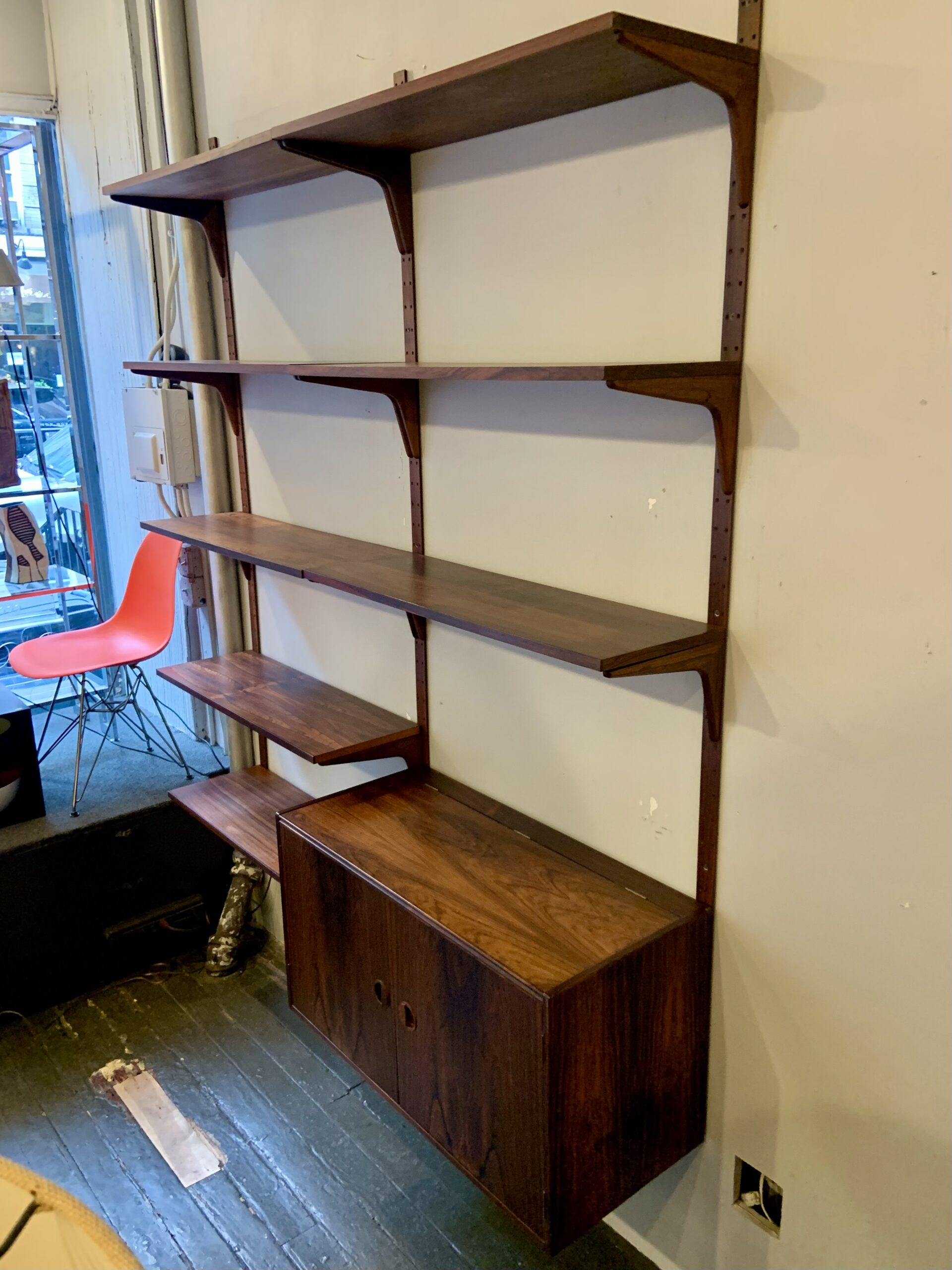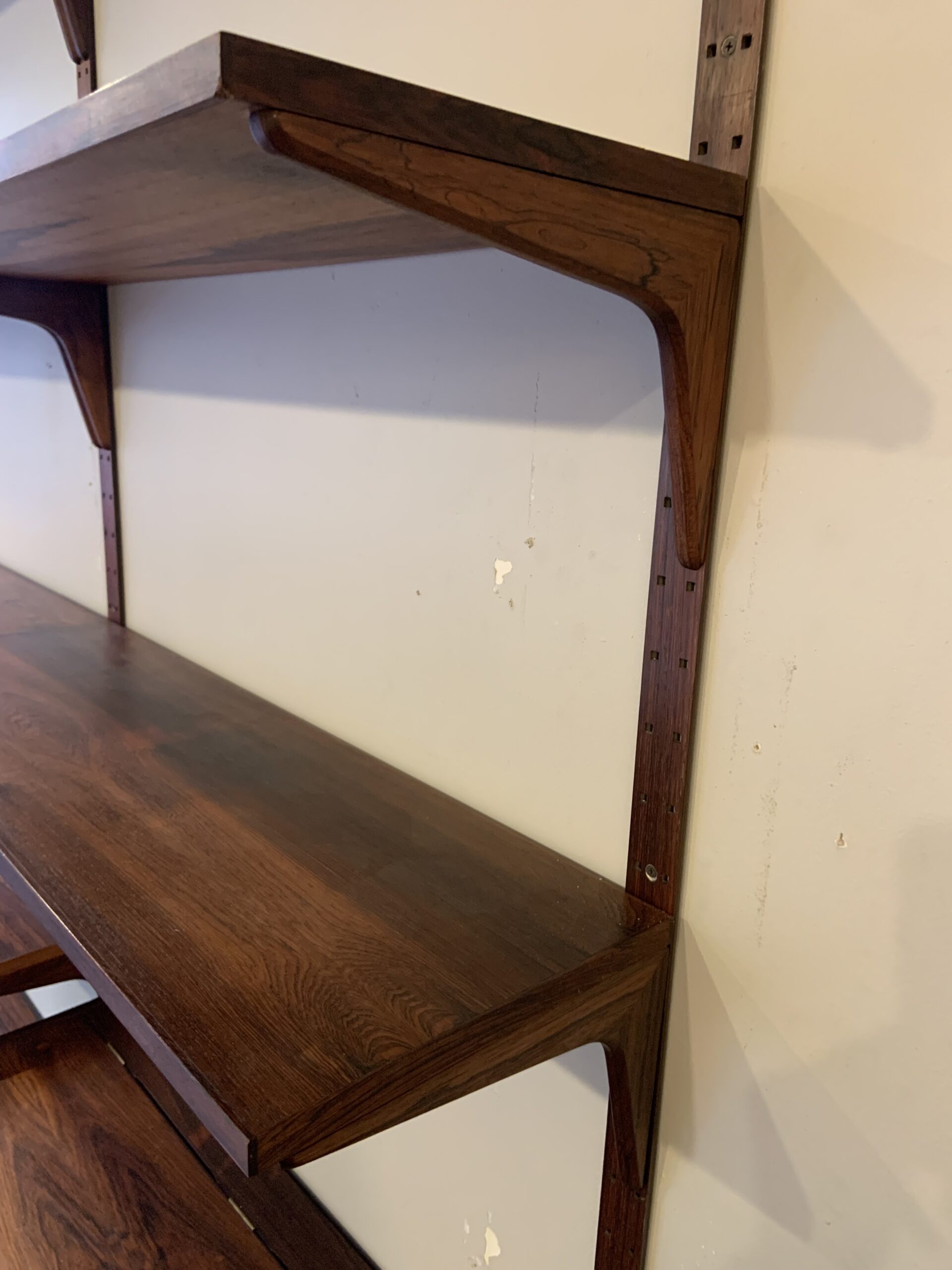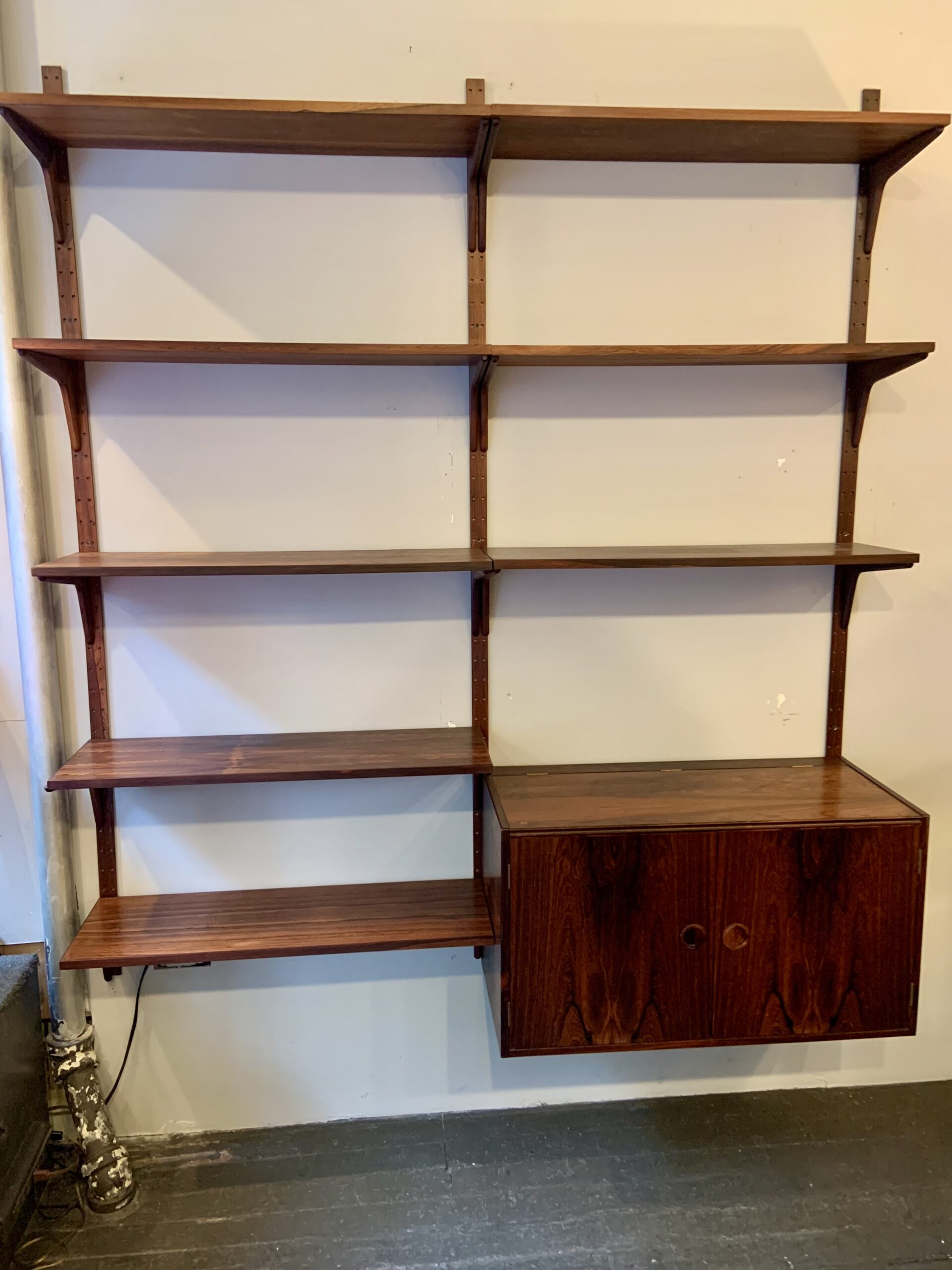 Two Bay Brazilian Rosewood Wall Unit by Rud Thygesen and Johnny Sorensen for Hansen & Guldborg, HG Furniture, Denmark, CA 1960s. Modular bays consist of one three door electronics cabinet, and eight 12″ shelves. The unit is in excellent original condition. Measures 70 3/4″w X 16″d X 78″h.