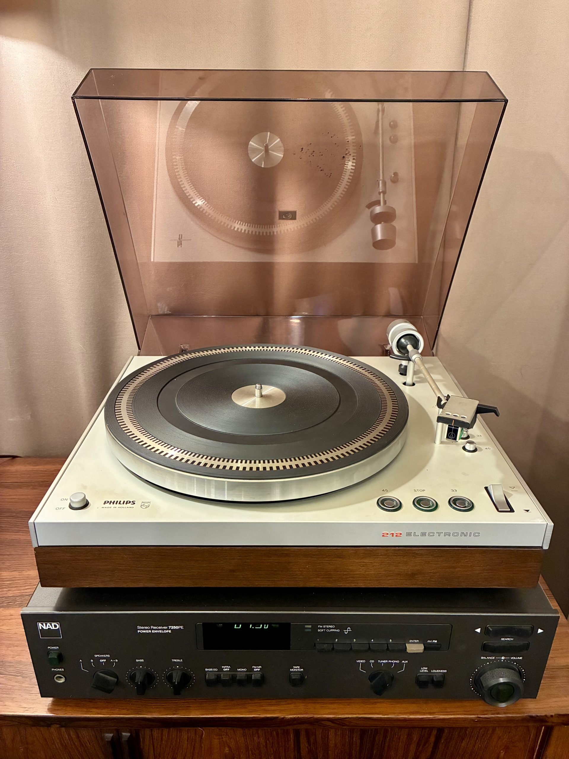 Are you ready for your own vintage system. Just add speakers:) Vintage Phillips Turntable & NAD 7250PE Receiver, handsome and in very good condition. $295