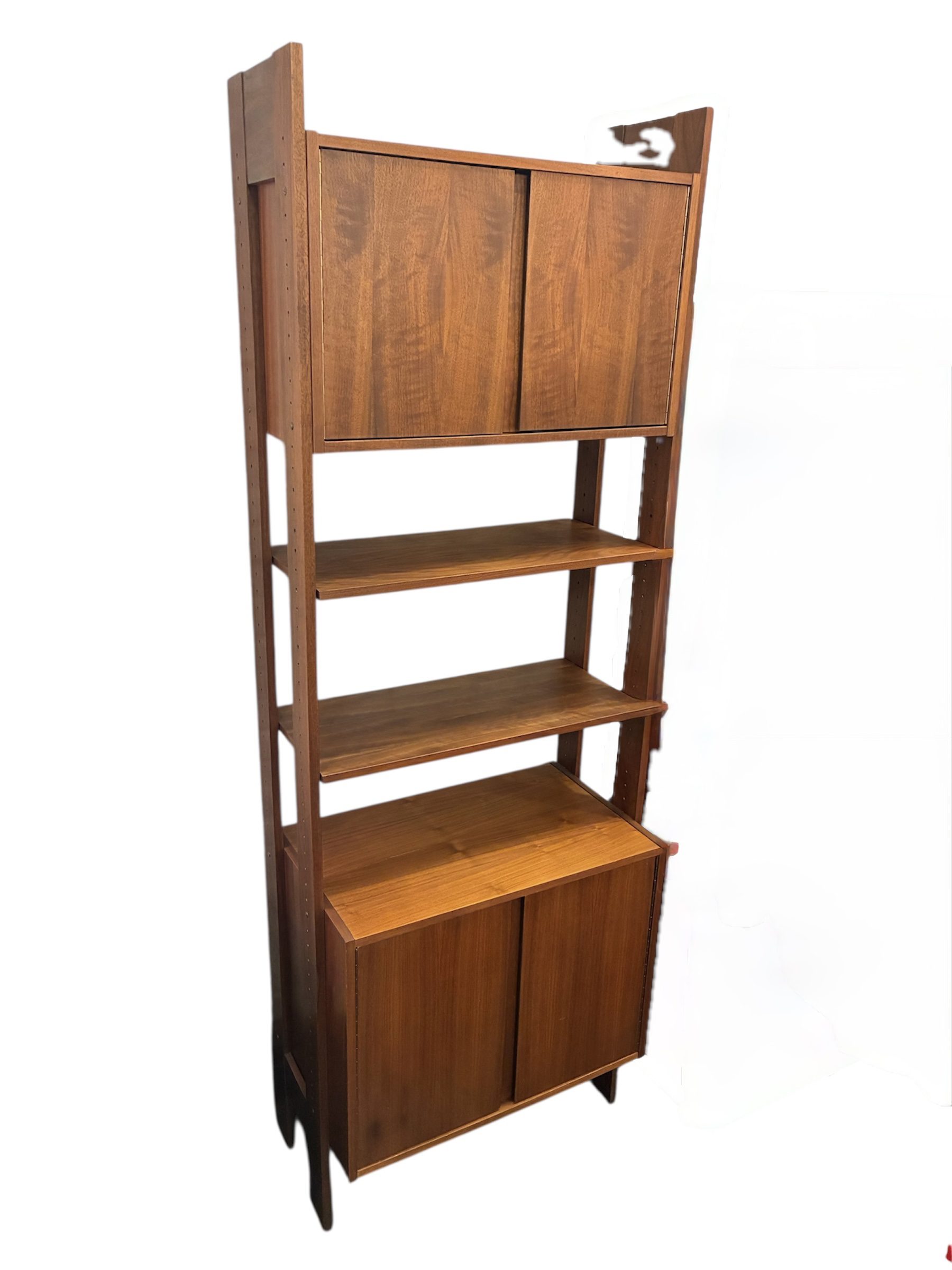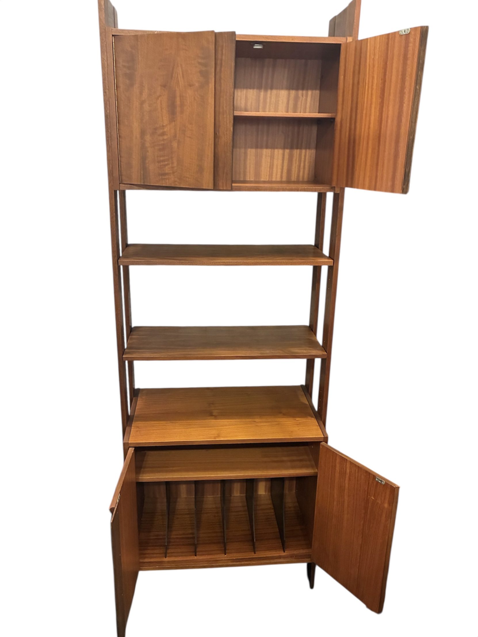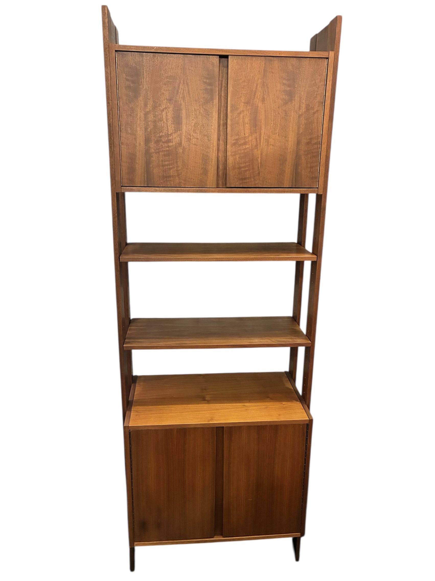 Yugoslavian Walnut Wall Unit with two 2 door cabinets and two adjustable shelves. In very good condition, it measures 28 1/2 X 16 X 82″h. $595